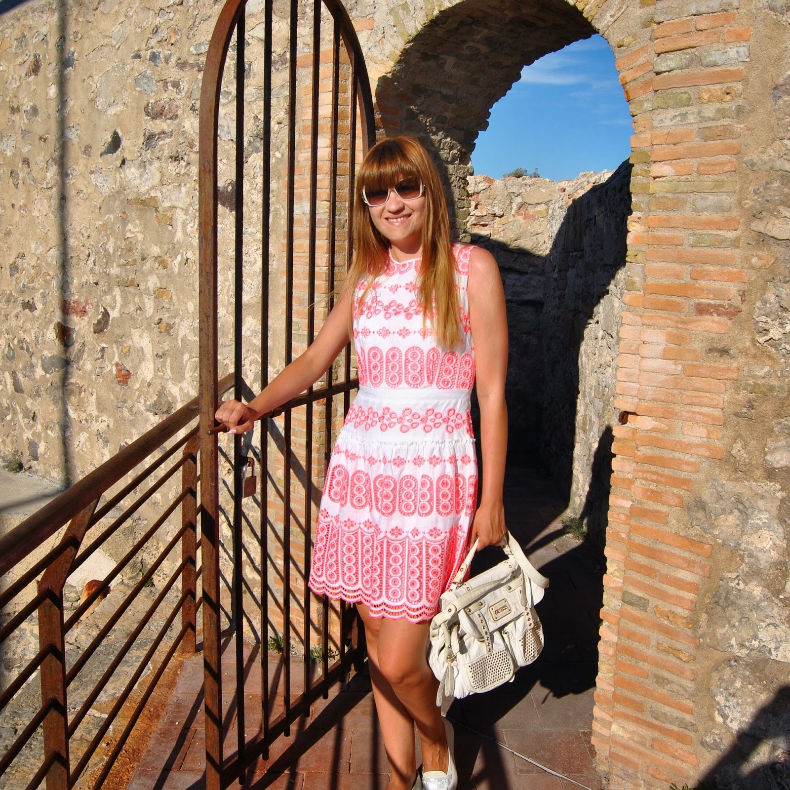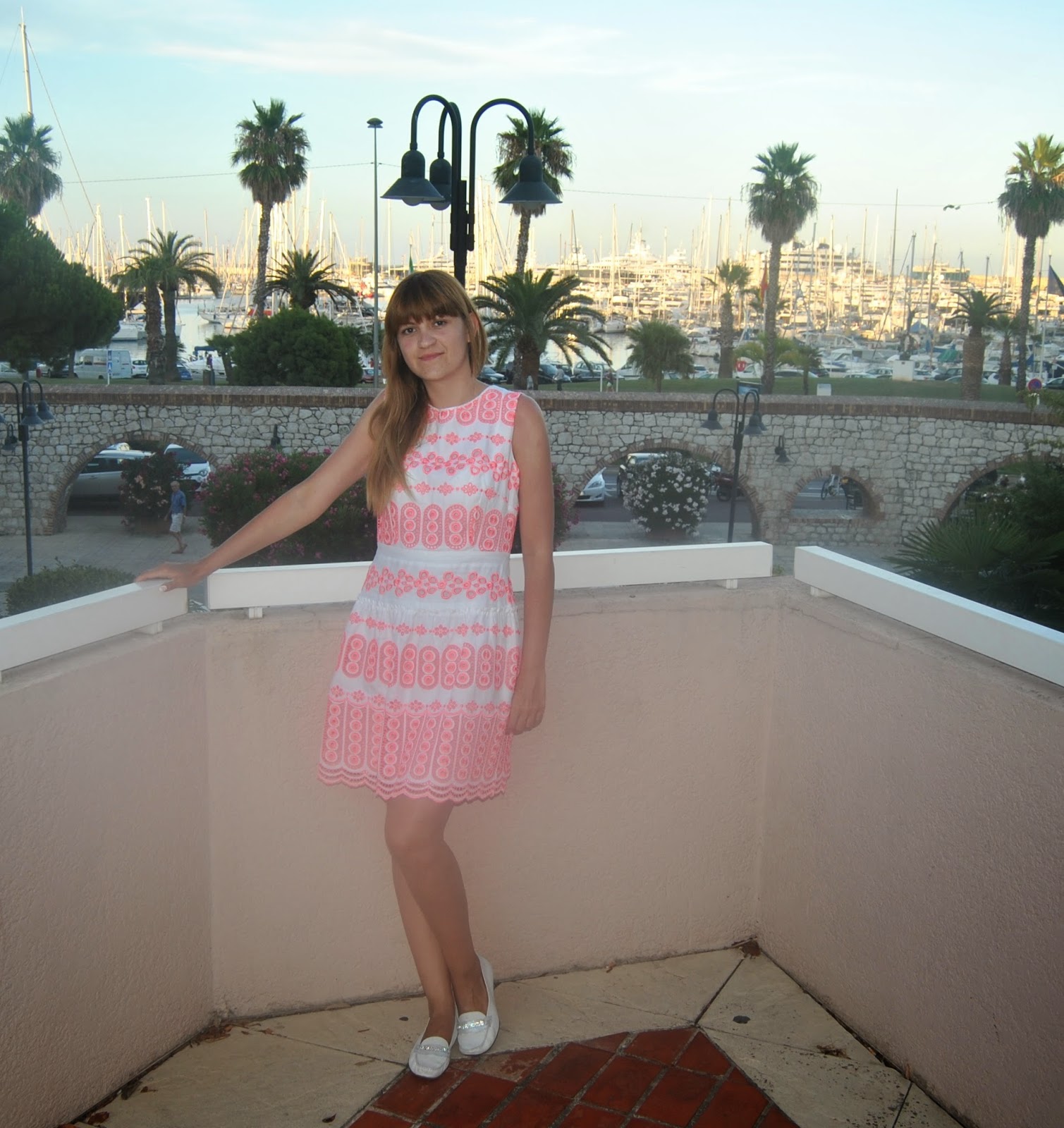 Antibes is a place with a long port, sandy beaches and the beautiful old town. There is also the famous Picasso Museum. I choose a romantic dress with cotton lace in two expressive colors (pink and white) and white comfortable moccasins. The second day I am in a white fluffy skirt paired with a nice viscose blouse in many beautiful complementary colors.