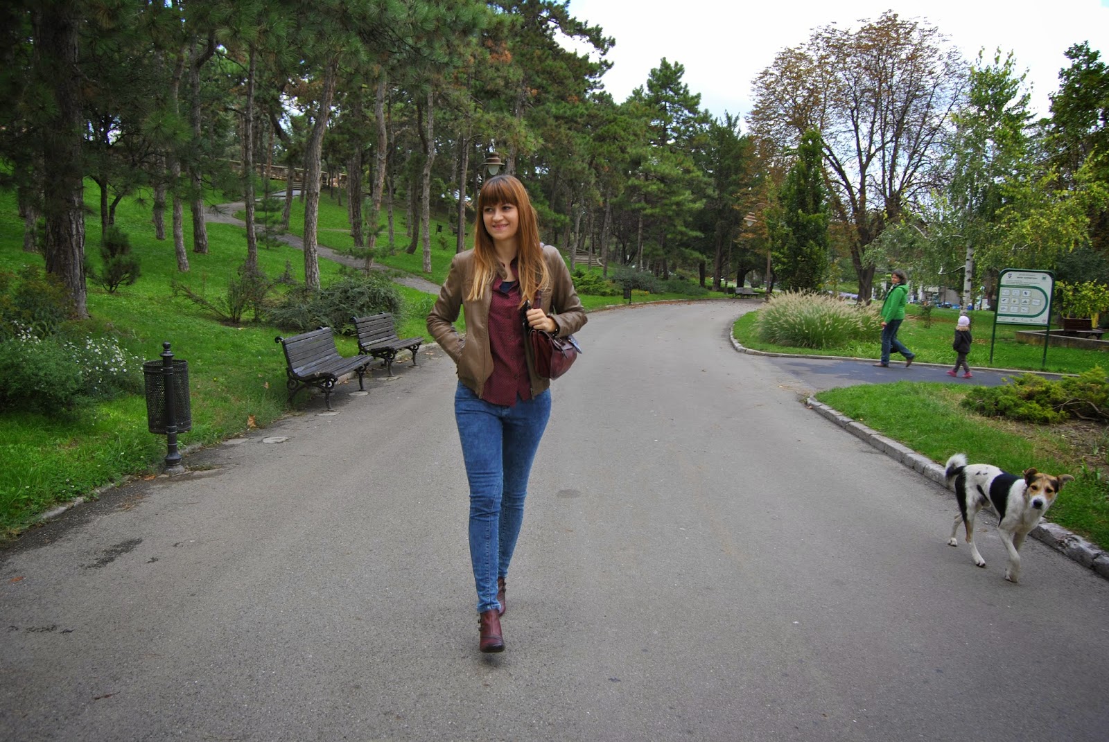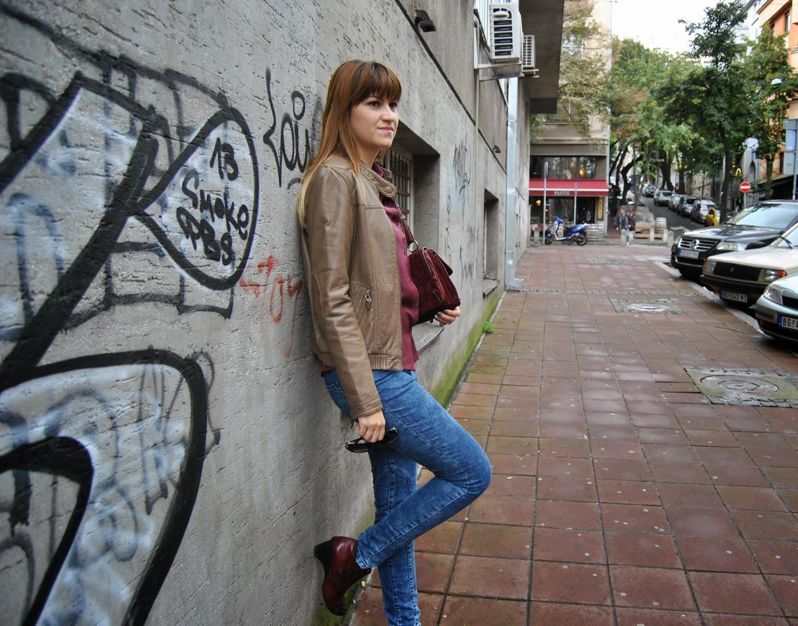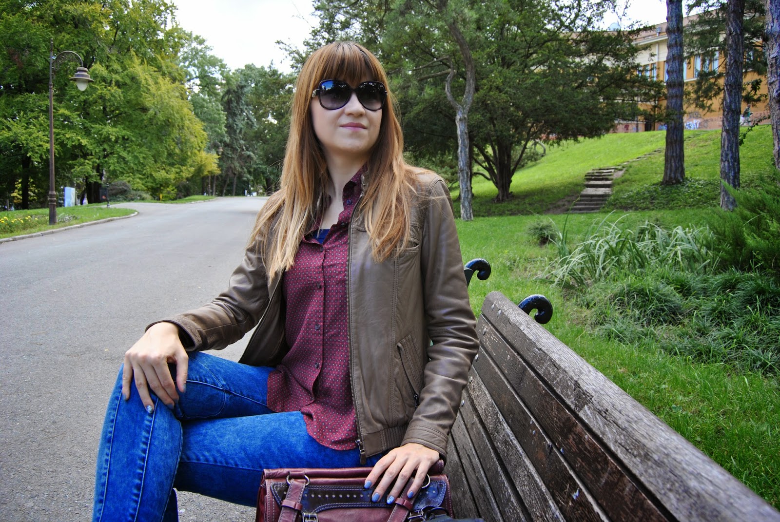 Danas je prvi dan jeseni. Nije mi baš drago zbog toga, jer dani postaju sve kraći i hladniji i moram da sklonim dublje u garderober svoje omiljene haljine i sandale. Ali, ok. Ulazim u novu sezonu sa optimističnim stavom. Priroda biva drugačija, svuda okolo su nove, neverovatne boje, razne nijanse crvene, žute, zelene…A, i rođendan mi je bio nedavno :). Krećem sa svojom omiljenom braon, kožnom jaknom, marke Sud Express, uskim farmerkama marke Nafnaf, bordo košuljom marke Massimo Dutti i sa savršenim bordo spojem kratkih čizmica i tašne marke Hispanitas. Nosim Armani naočare (vau, još uvek je sunčano) i kupila sam najnoviji broj modnog magazina Elle Srbija. Boje su tipično jesenje, obožavam bordo nijanse, najpopularnije ovih dana. Dizajneri preporučuju bordo tašnu kao neophodnu za aktuelnu jesen/zima sezonu. Često nosim odevne kombinacije poput ove, savršen su street style za dane provedene u gradu.