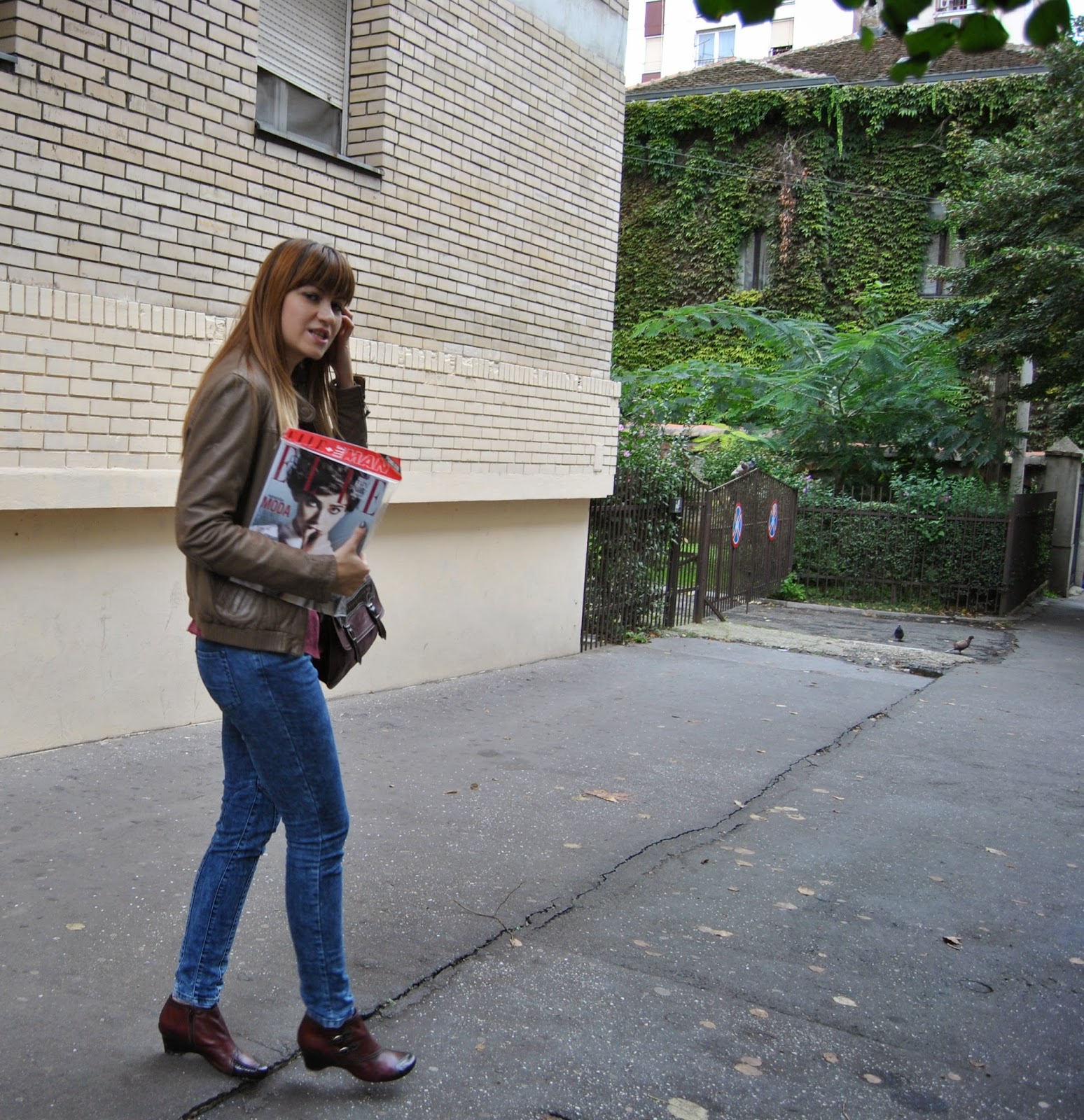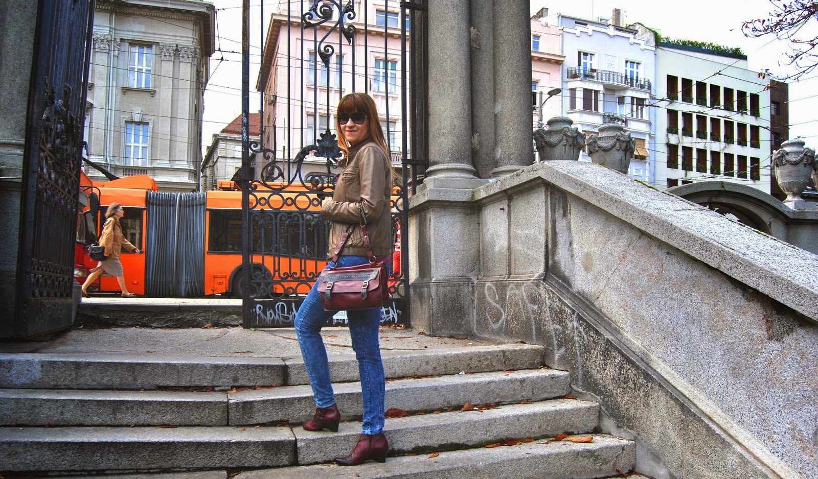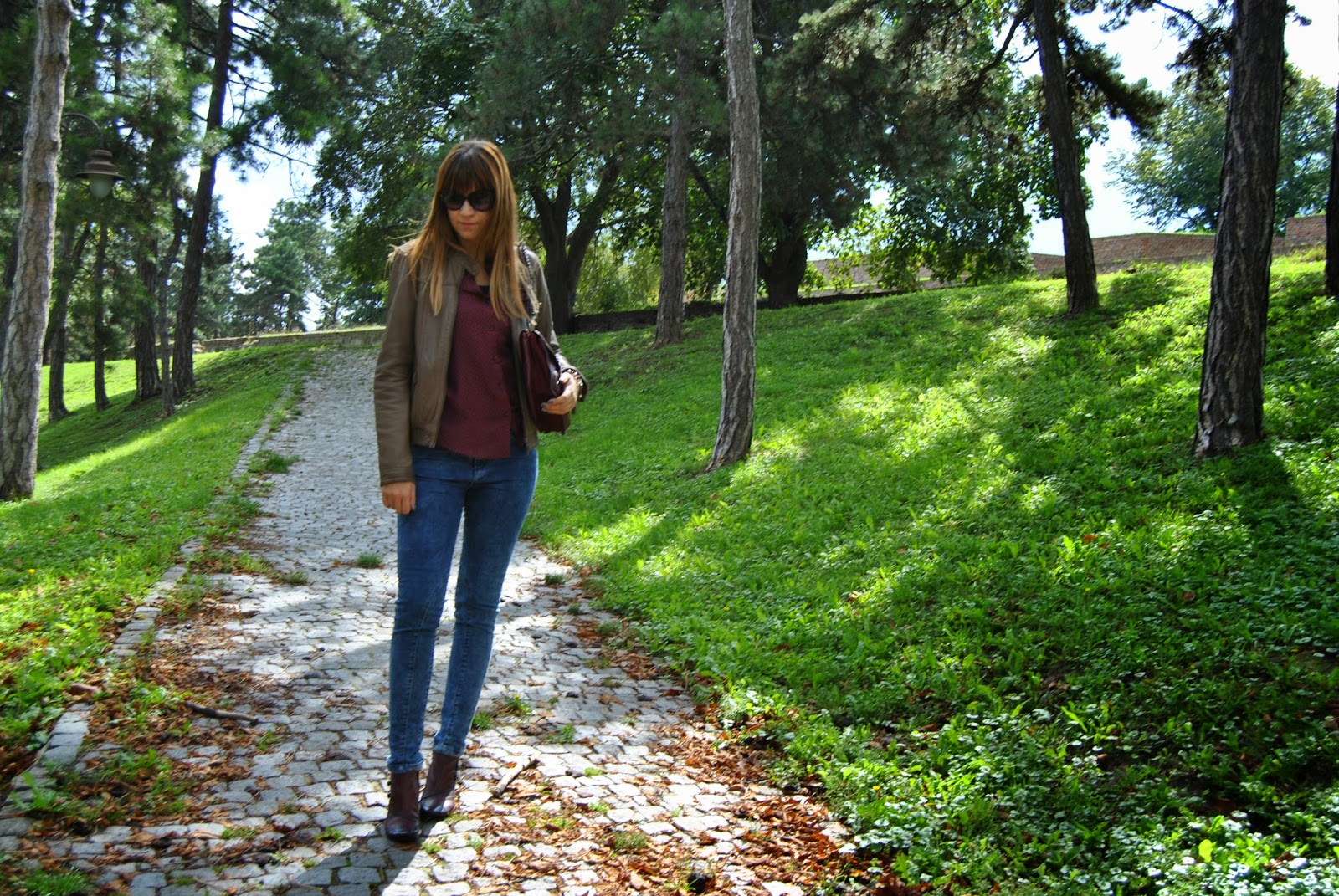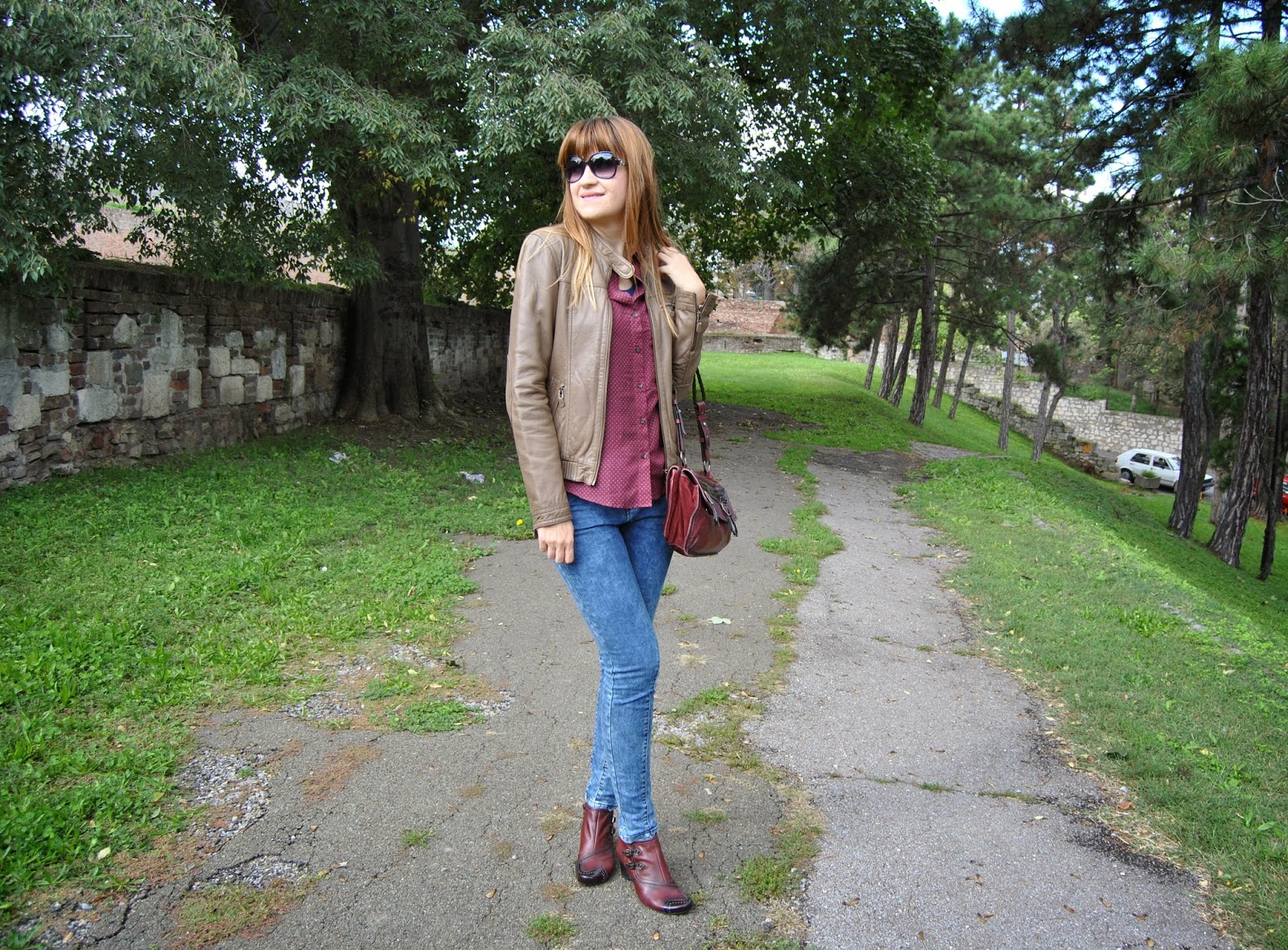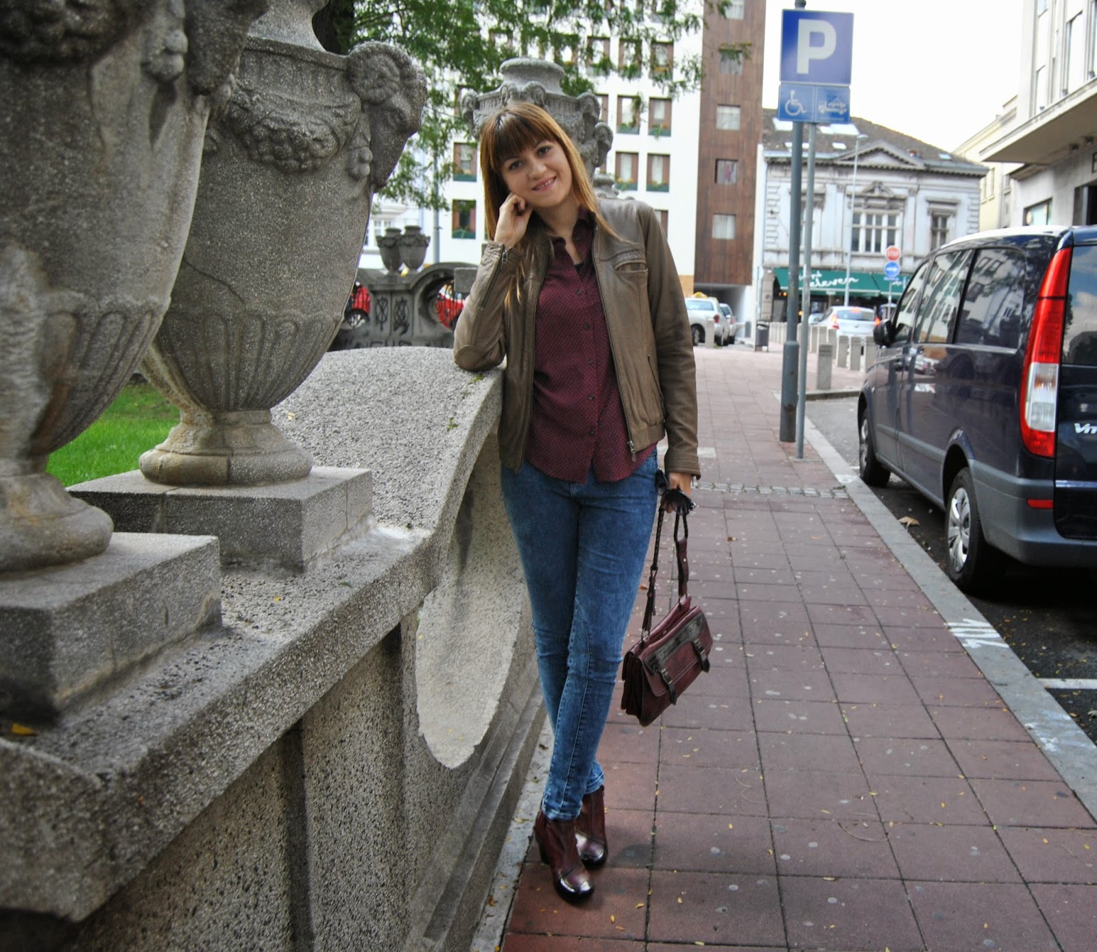 Today is the first day of Autumn. I’m not really happy about this fact, because the days are becoming shorter and colder and I must put away my favorite summer dresses and sandals deeply in the closet. But, okay. I’m starting a new season with the optimistic attitude. Nature becomes different, all over are new amazing colors, as well as several shades of red, yellow, green…and my birthday was recently :). I start with my favorite brown leather jacket by Sud Express, skinny jeans by Nafnaf, “burgundy” shirt by Massimo Dutti and with amazing “burgundy” match of short leather boots and bag by Hispanitas. Also, I wear Armani sunglasses (wow, it’s still sunny) and bought a new issue of the fashion magazine Elle Serbia. Colors are typical of autumn, I adore the color “burgundy”, the most popular color these days. Designers recommend “burgundy” bag as a necessary accessory for current autumn/winter season. I like to wear outfits like this, that is the perfect street style for days in the city.