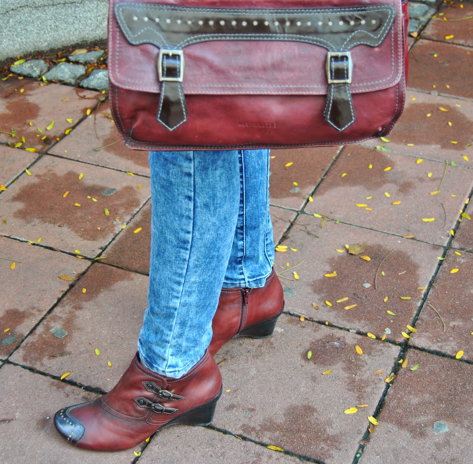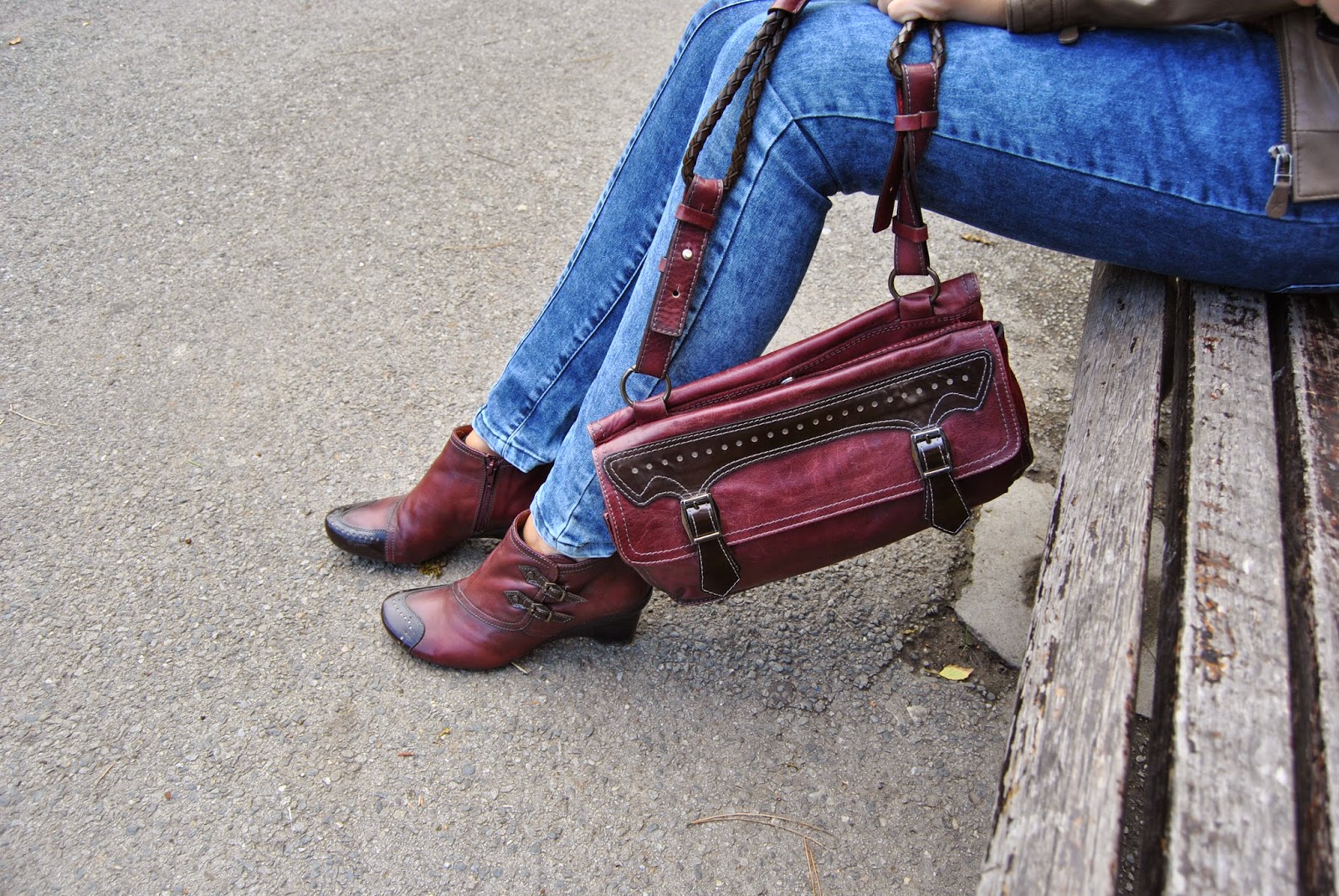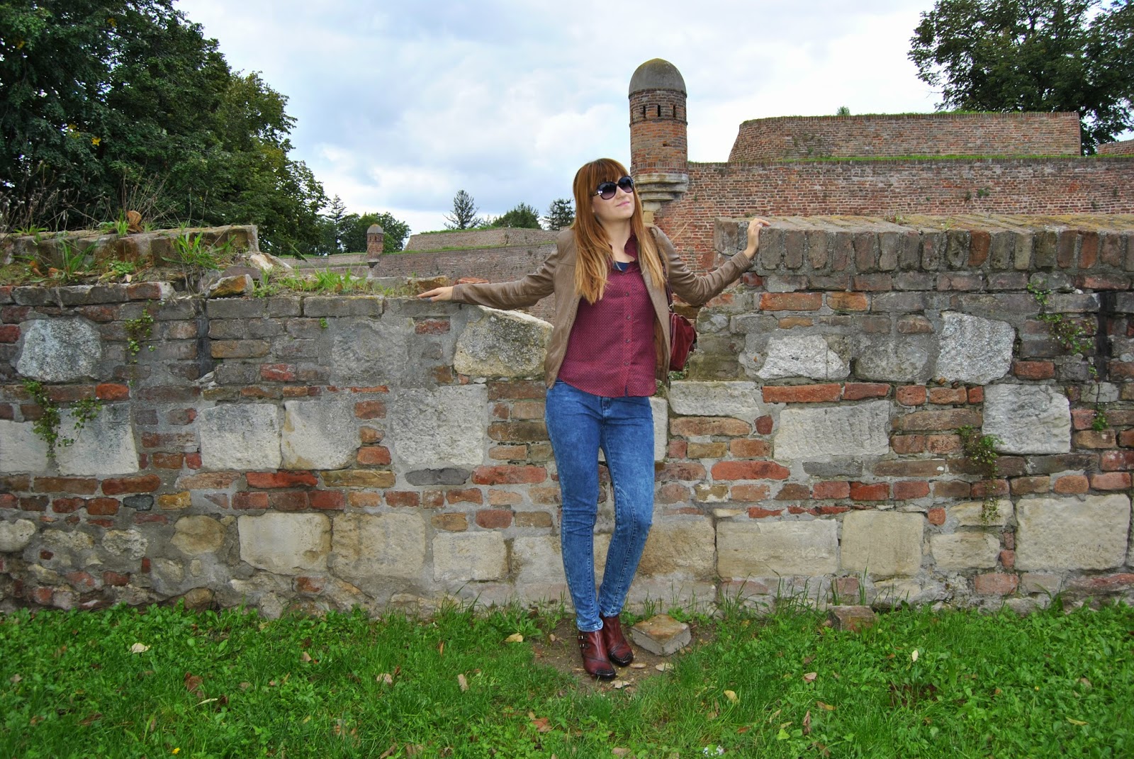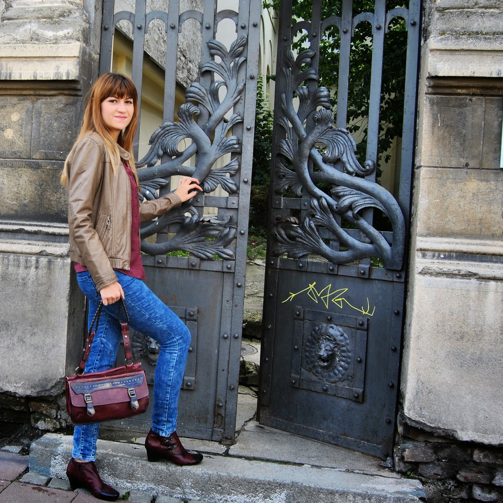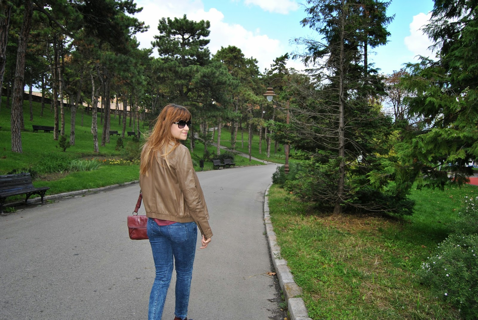 Today is the first day of Autumn. I’m not really happy about this fact, because the days are becoming shorter and colder and I must put away my favorite summer dresses and sandals deeply in the closet. But, okay. I’m starting a new season with the optimistic attitude. Nature becomes different, all over are new amazing colors, as well as several shades of red, yellow, green…and my birthday was recently :). I start with my favorite brown leather jacket by Sud Express, skinny jeans by Nafnaf, “burgundy” shirt by Massimo Dutti and with amazing “burgundy” match of short leather boots and bag by Hispanitas. Also, I wear Armani sunglasses (wow, it’s still sunny) and bought a new issue of the fashion magazine Elle Serbia. Colors are typical of autumn, I adore the color “burgundy”, the most popular color these days. Designers recommend “burgundy” bag as a necessary accessory for current autumn/winter season. I like to wear outfits like this, that is the perfect street style for days in the city.