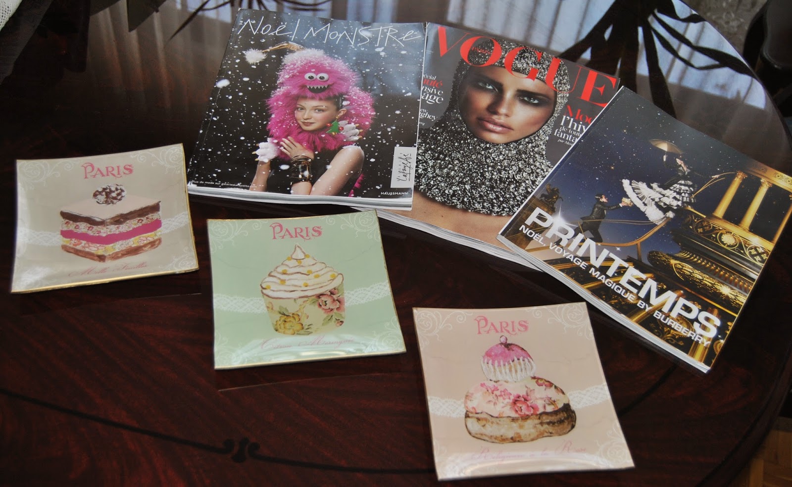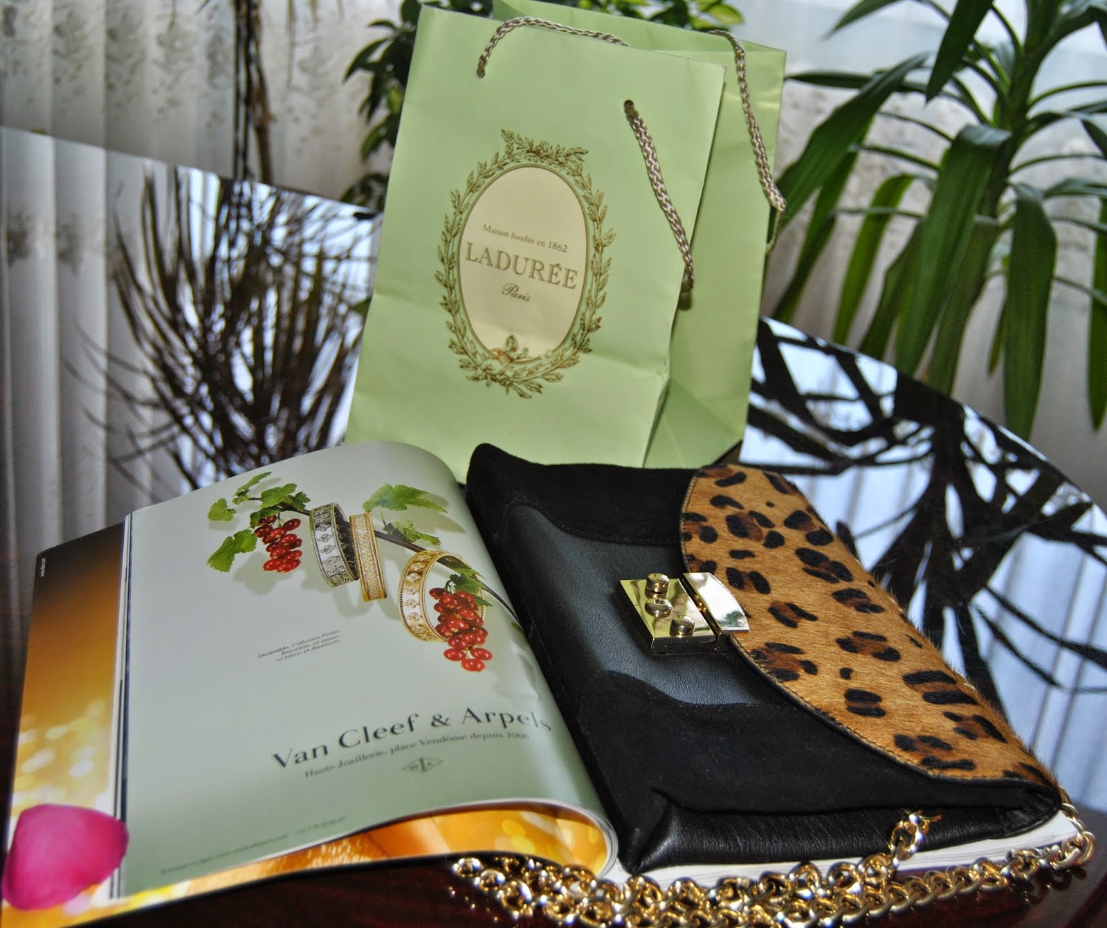 Hi, beautiful people! First of all, I want to apologize because didn’t post a lot of days. Obligations, obligations! I’ve recently came back from short, but beautiful trip to Paris and when I would have pics from there (hope very soon), I will put them on the blog. I can’t wait to show you wonderful atmosphere in romantic and rainy Paris. In this post, you can see a few inspiring things from this trip, such as magazines of famous, glamorous and spacious department stores: Printemps and Galeries Lafayette, the new issue of French Vogue with beautiful Adriana Lima at the cover, my polaroid pics from outside of the famous museum Louvre, delicate French perfume Repetto, red lipstick Givenchy (rouge interdit No.12), sweet purse with leopard print Sinequanone, Ladurée bag (tasty macarons on the next post), lovely glass saucers with motives of Paris and pleasant cup of tea. It’s perfect afternoon for me. How do you spend your free time at home when it’s cold and cloudy as today?