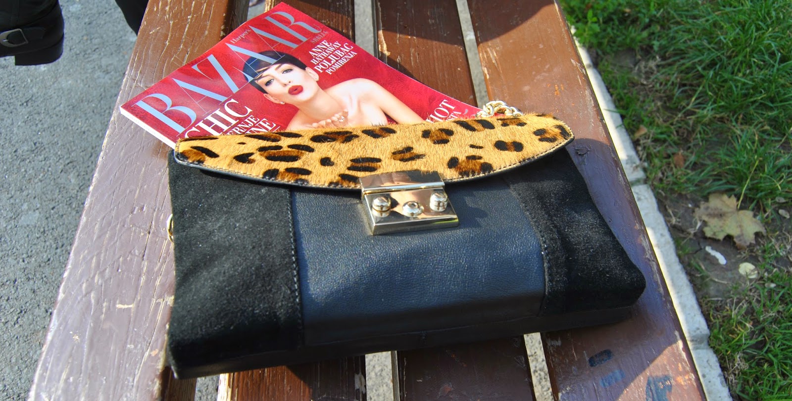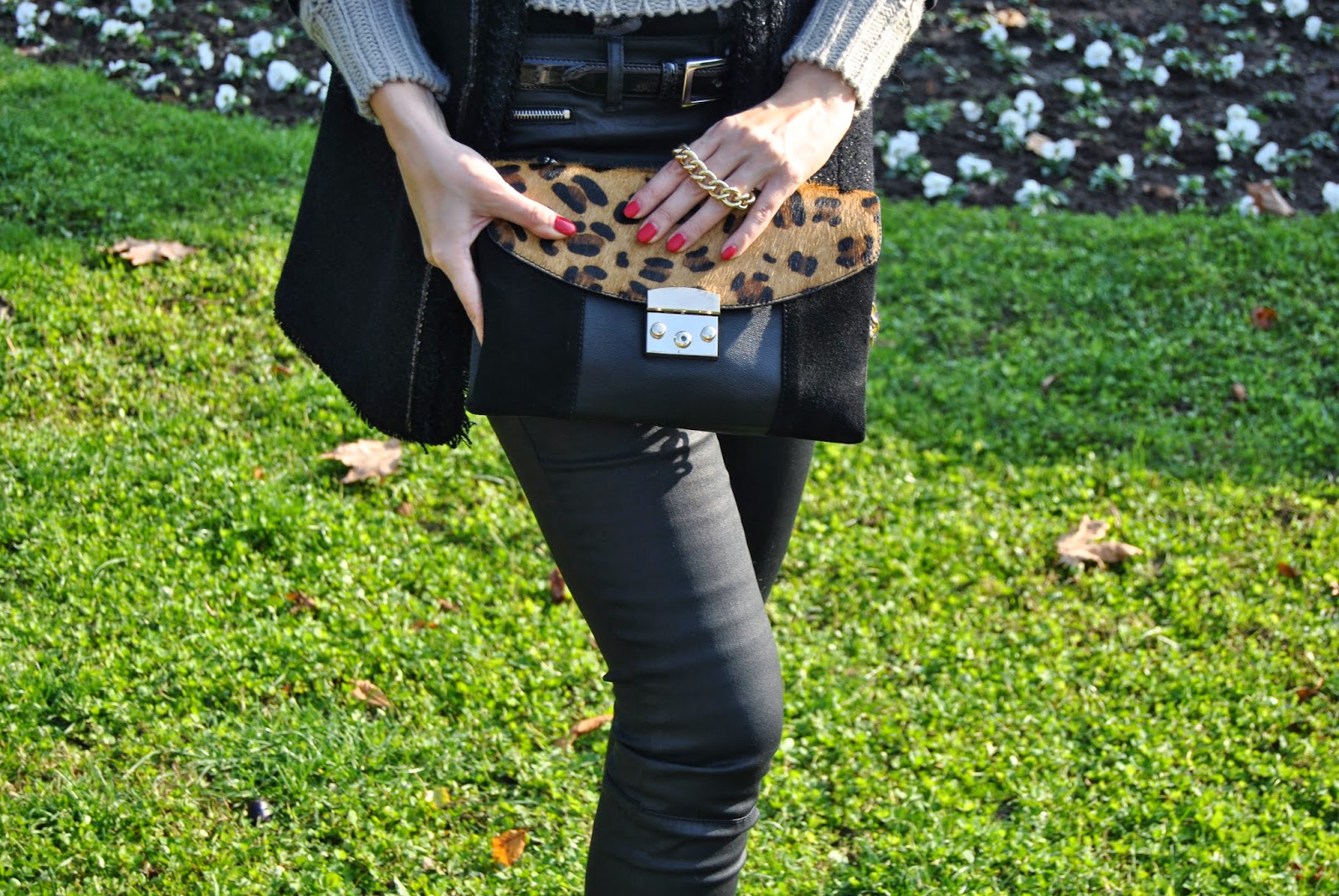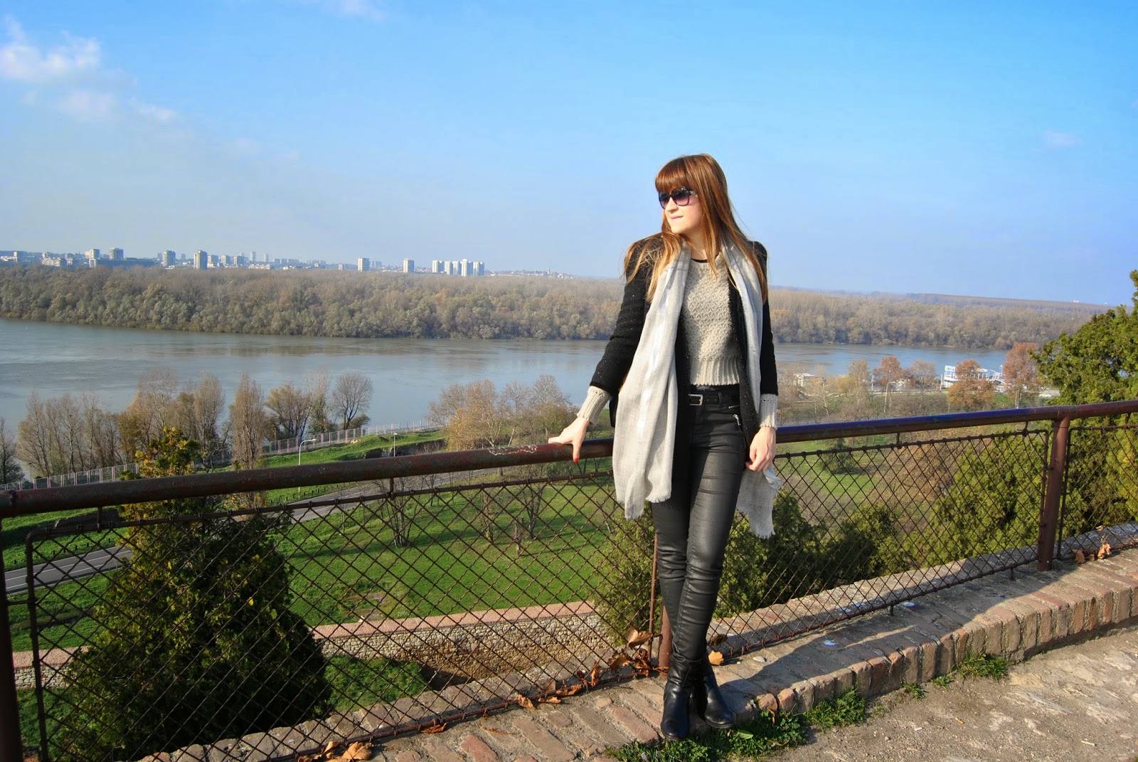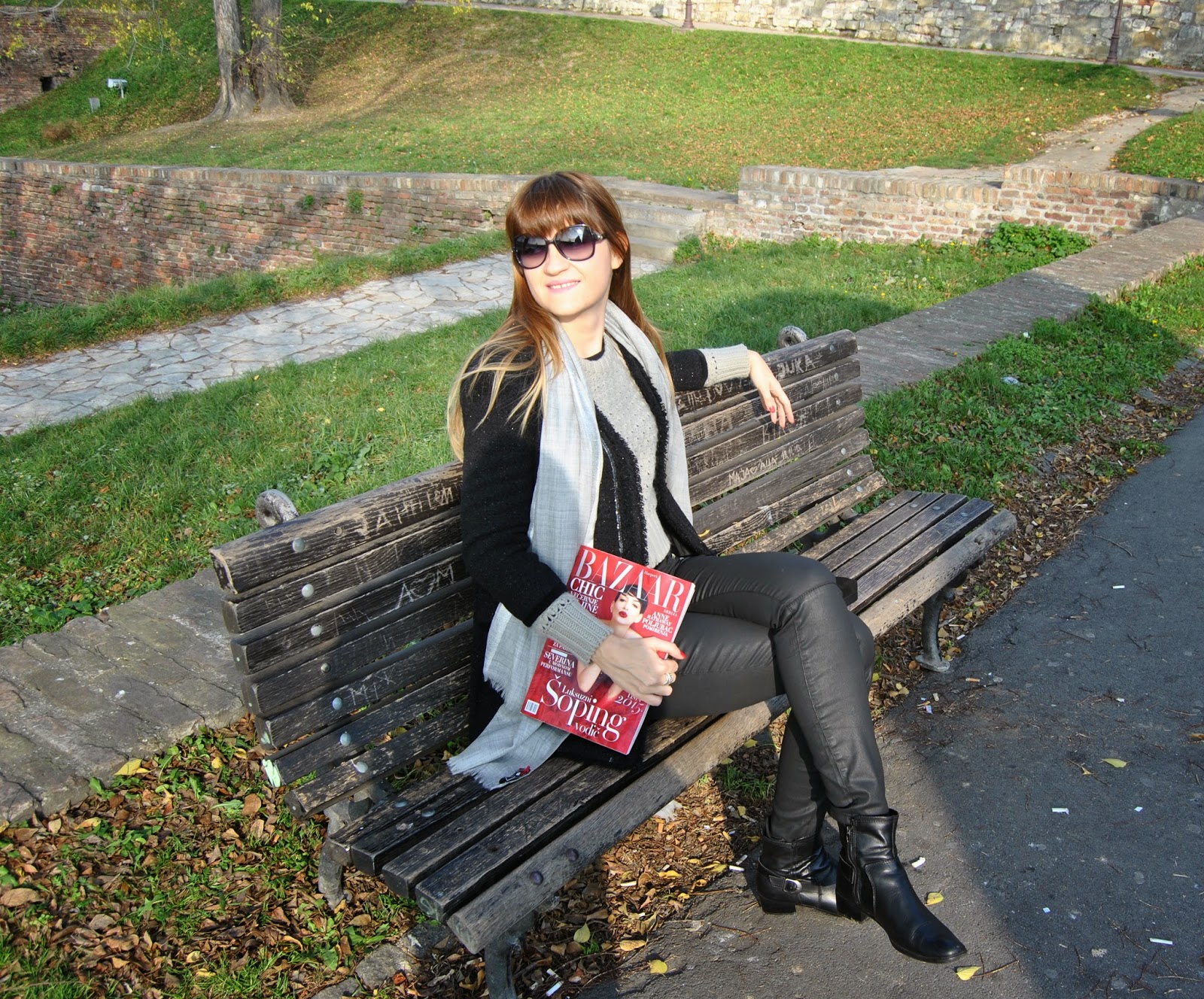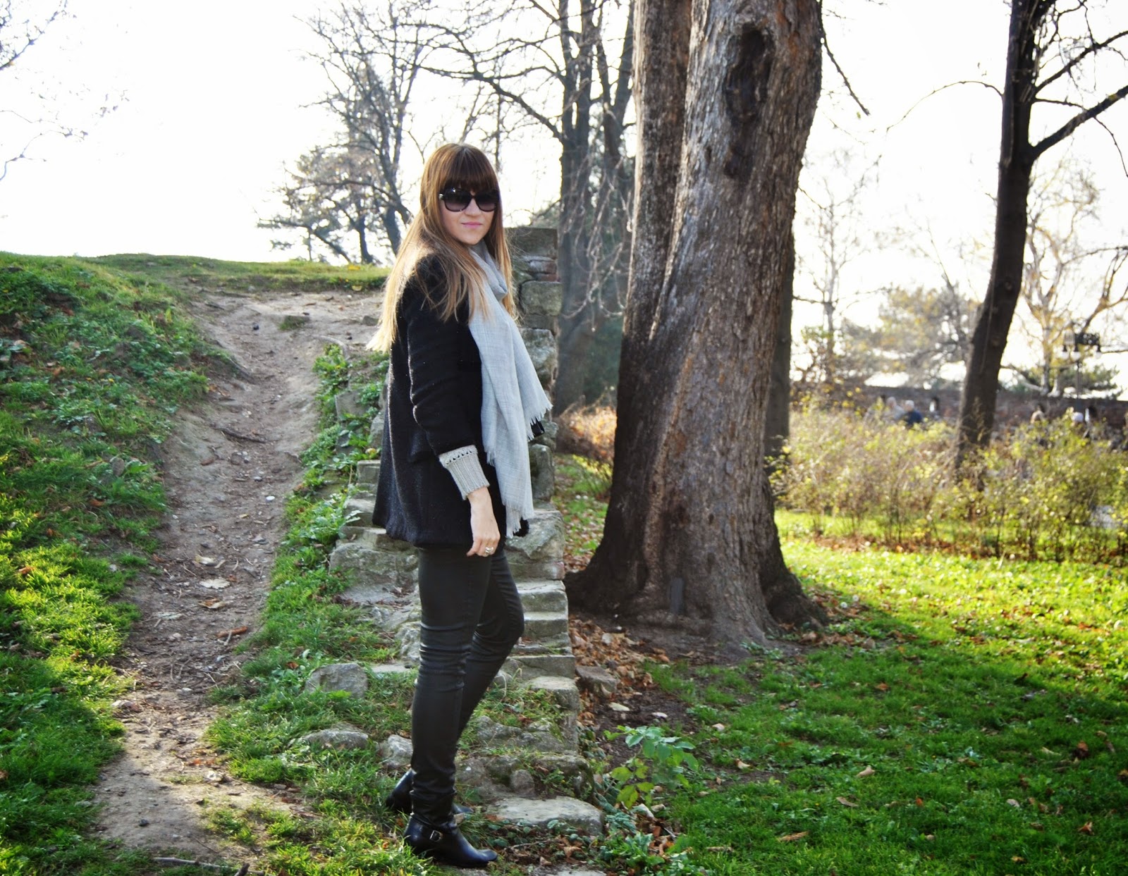 Hi lovely friends! Today was cold, but sunny, so I’ve enjoyed in Kalemegdan, famous Belgrade fortress. You can see my black outfit, with touch of gray and leopard print. I mixed skinny pants which look like a leather with short woolen jumper and shiny coat-blazer. Short black boots seem to be ideal for this slim form of pants and of course, nothing without accessories. I’ve chosen big woolen scarf in sophisticated gray and with silver edges and cute leather purse with leopard print and long chain. Do you like city outfits like this?