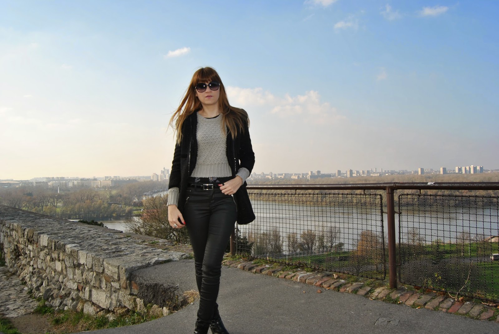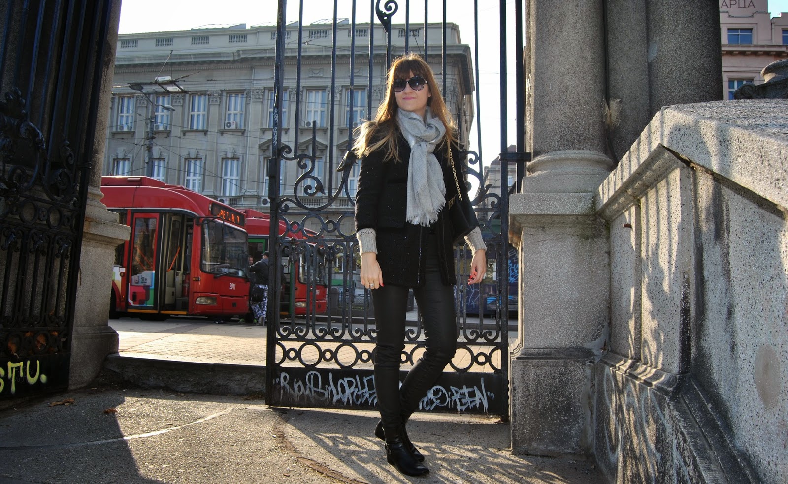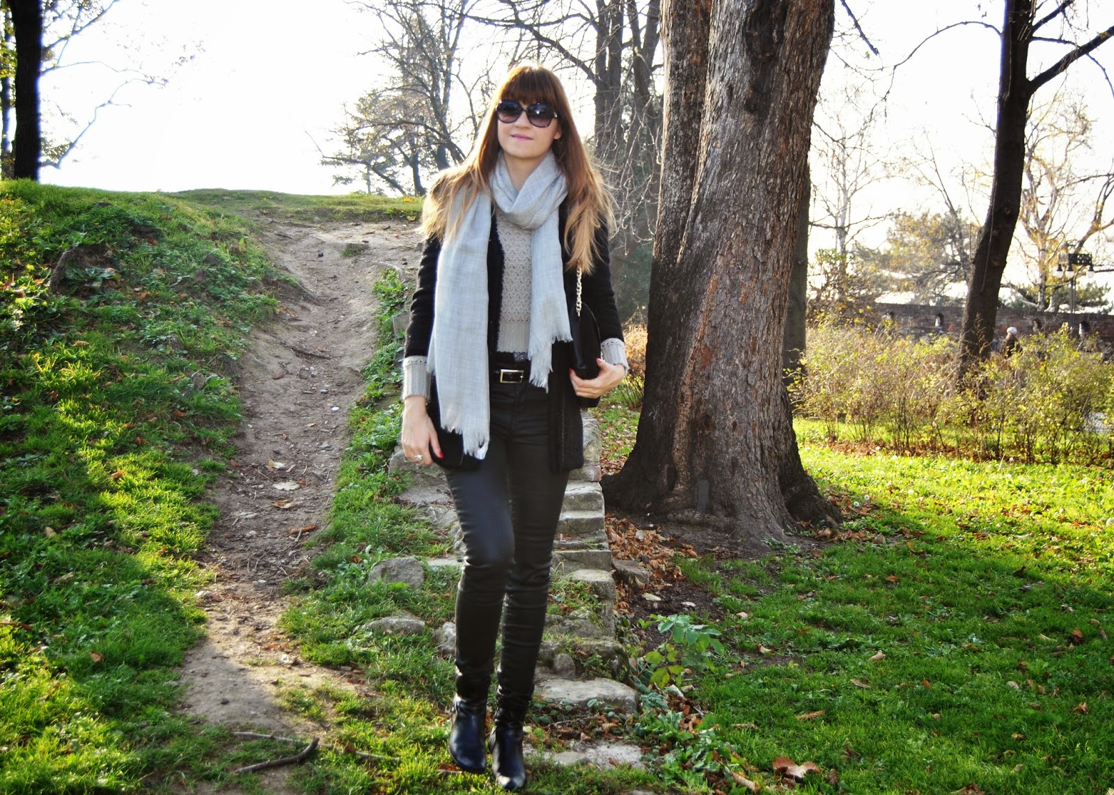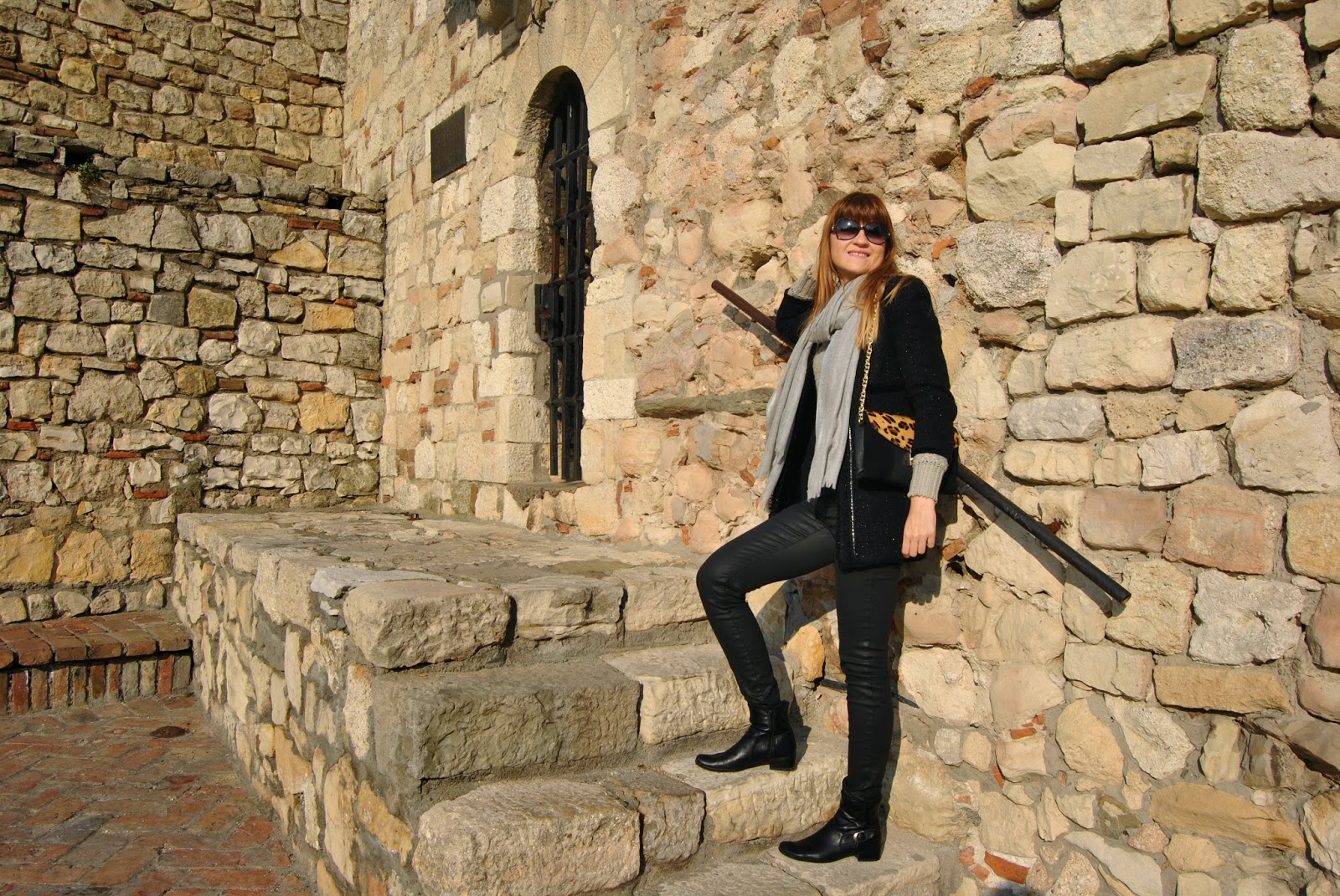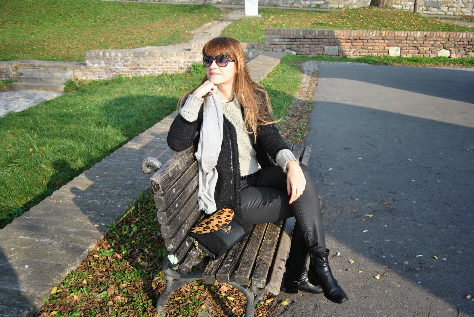 Hi lovely friends! Today was cold, but sunny, so I’ve enjoyed in Kalemegdan, famous Belgrade fortress. You can see my black outfit, with touch of gray and leopard print. I mixed skinny pants which look like a leather with short woolen jumper and shiny coat-blazer. Short black boots seem to be ideal for this slim form of pants and of course, nothing without accessories. I’ve chosen big woolen scarf in sophisticated gray and with silver edges and cute leather purse with leopard print and long chain. Do you like city outfits like this?