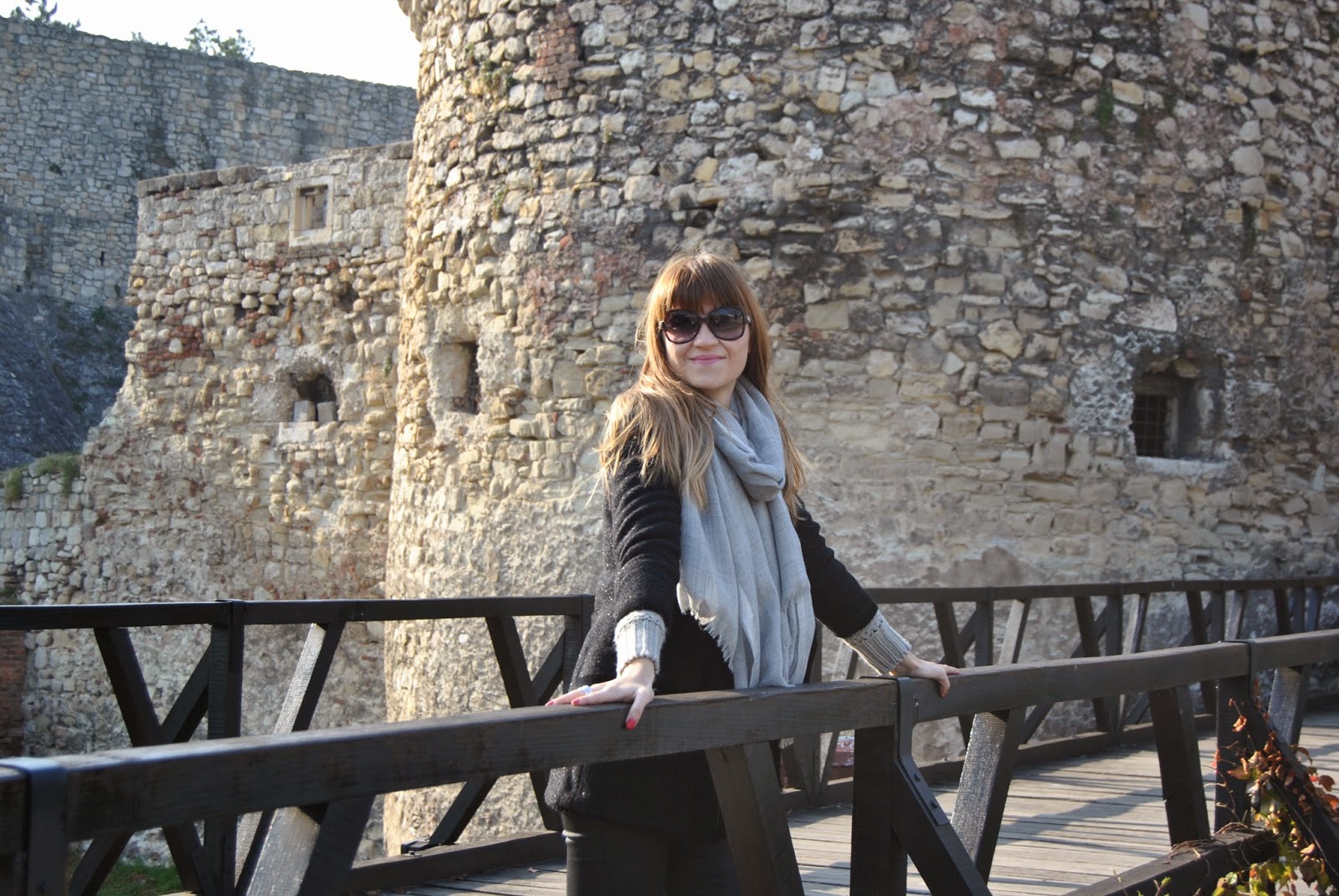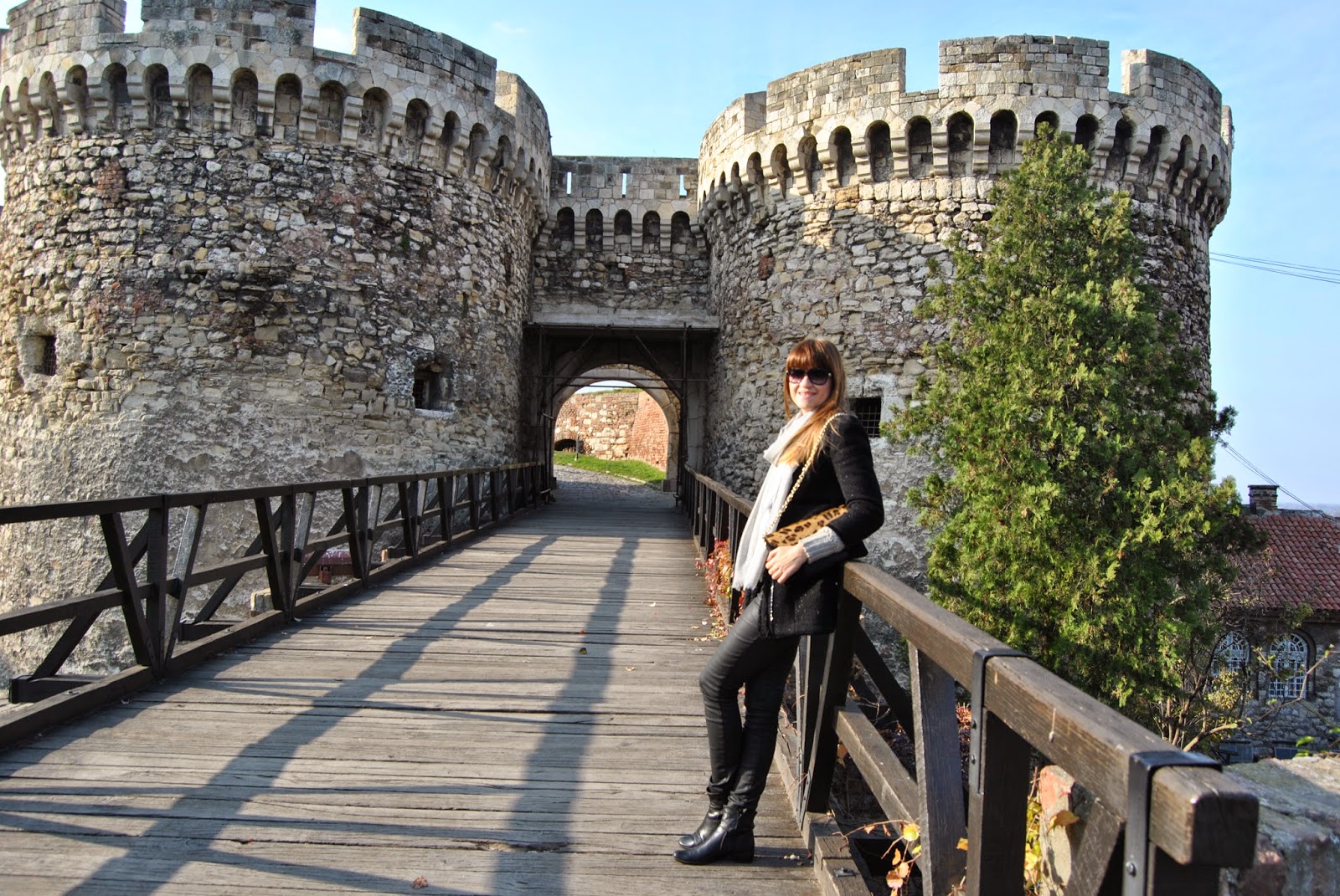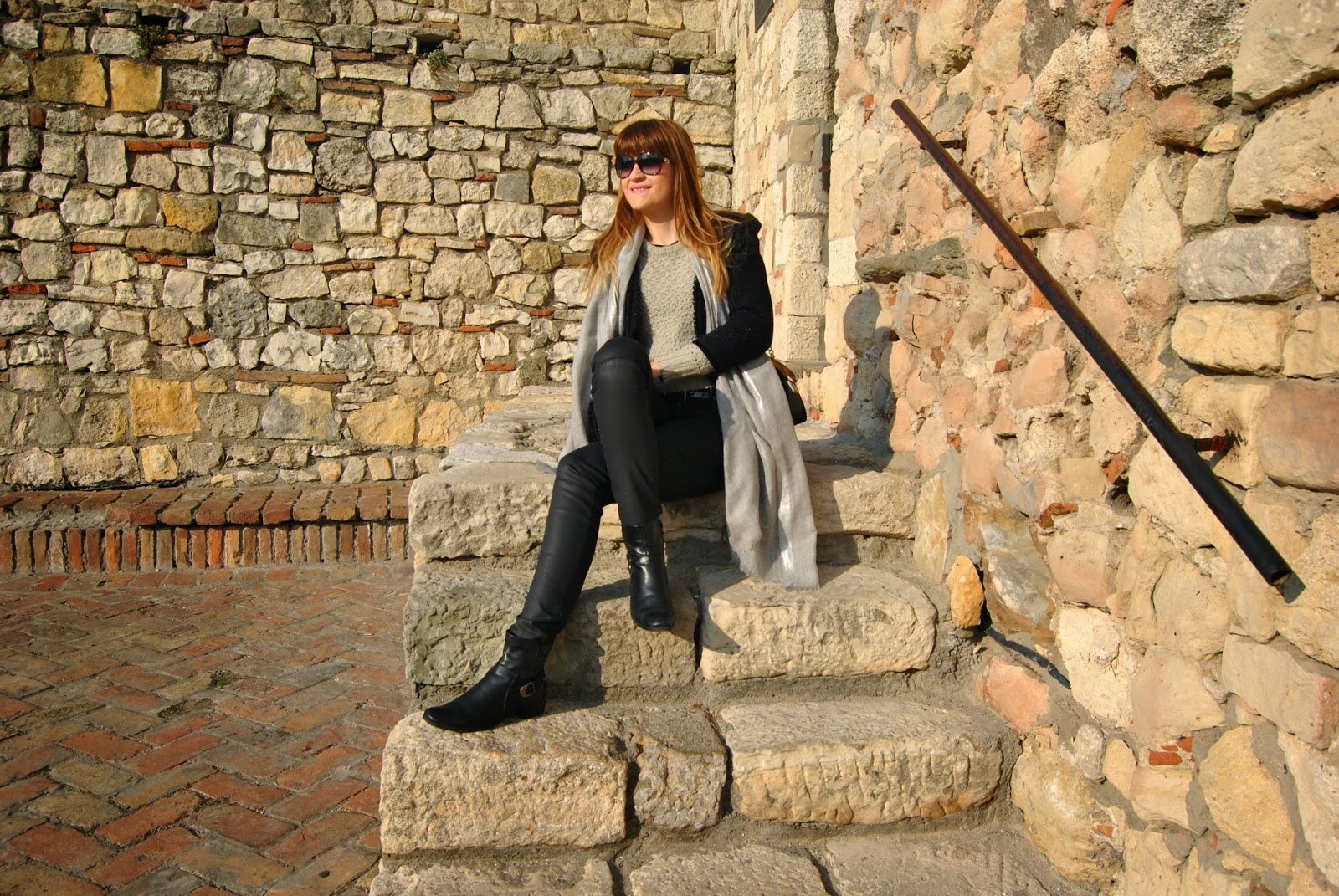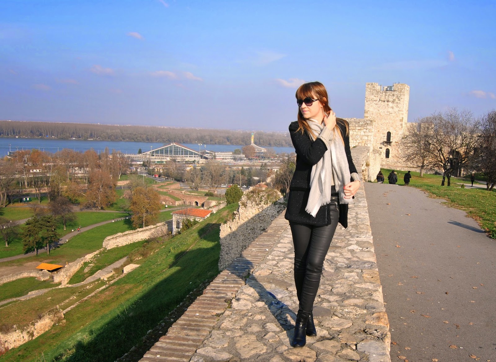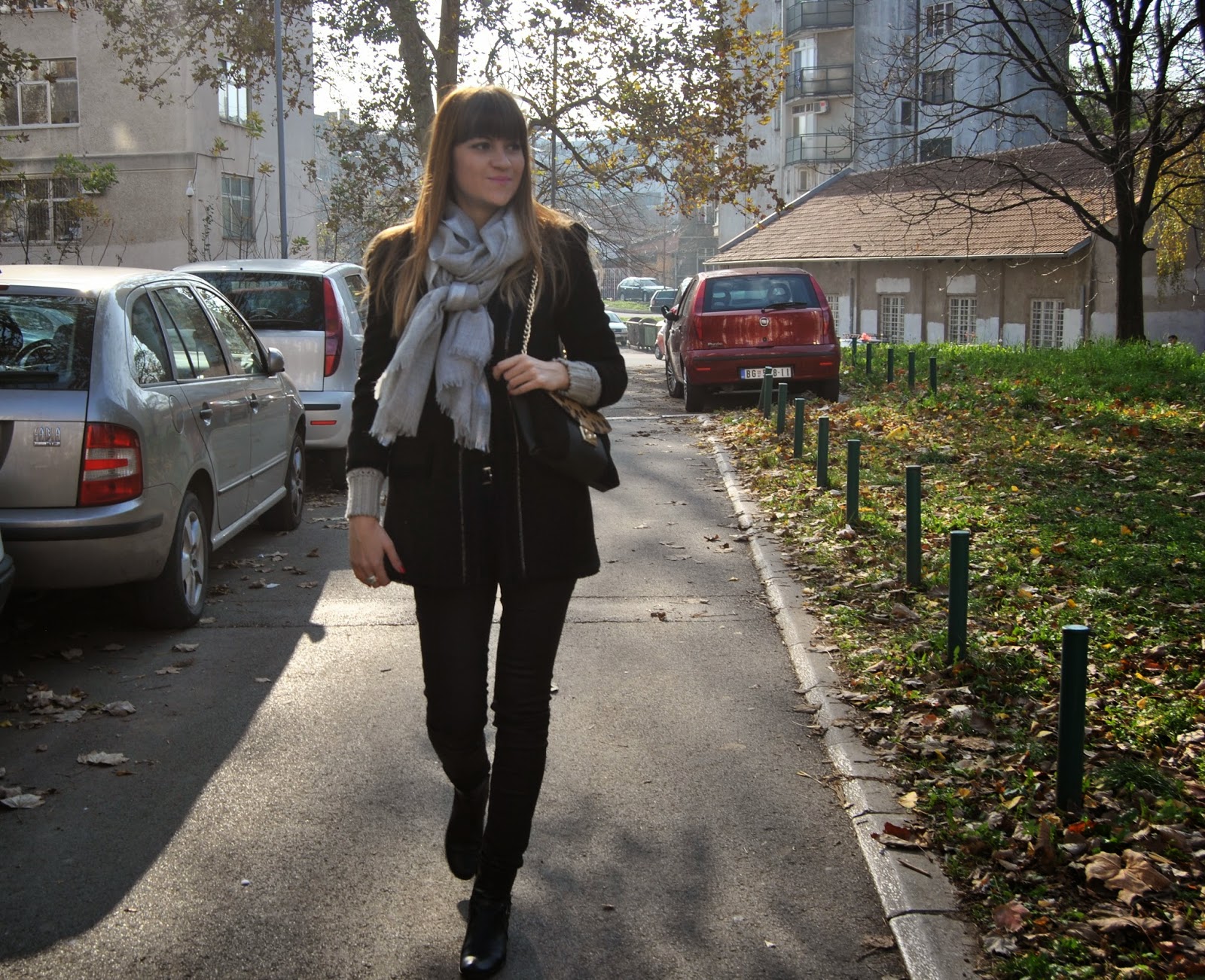 Hi lovely friends! Today was cold, but sunny, so I’ve enjoyed in Kalemegdan, famous Belgrade fortress. You can see my black outfit, with touch of gray and leopard print. I mixed skinny pants which look like a leather with short woolen jumper and shiny coat-blazer. Short black boots seem to be ideal for this slim form of pants and of course, nothing without accessories. I’ve chosen big woolen scarf in sophisticated gray and with silver edges and cute leather purse with leopard print and long chain. Do you like city outfits like this?