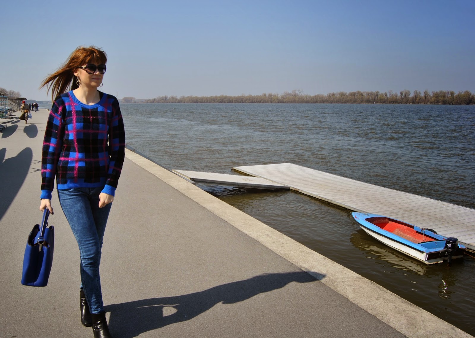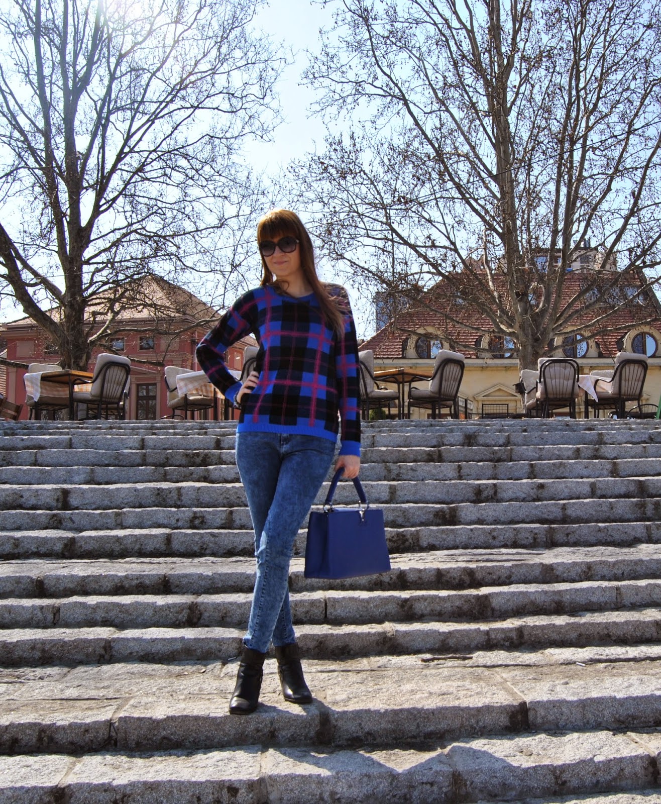 Hello lovelies! Finally, spring is here and we can forget our heavy winter clothes. Before few days, I chose to wear one casual chic outfit in blue shades. Skinny jeans, attractive sweater in 3 colours, ankle boots, favourite royal blue bag, a few accessories and it is it. Super comfortable and trendy look for long walking and enjoying in the sun.