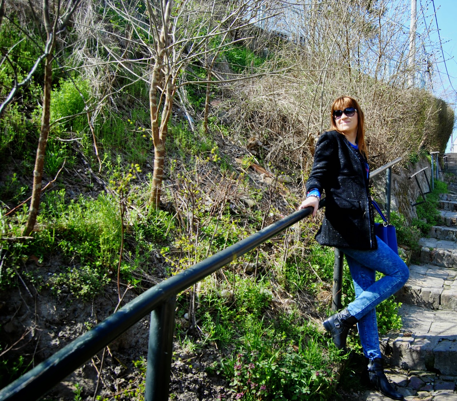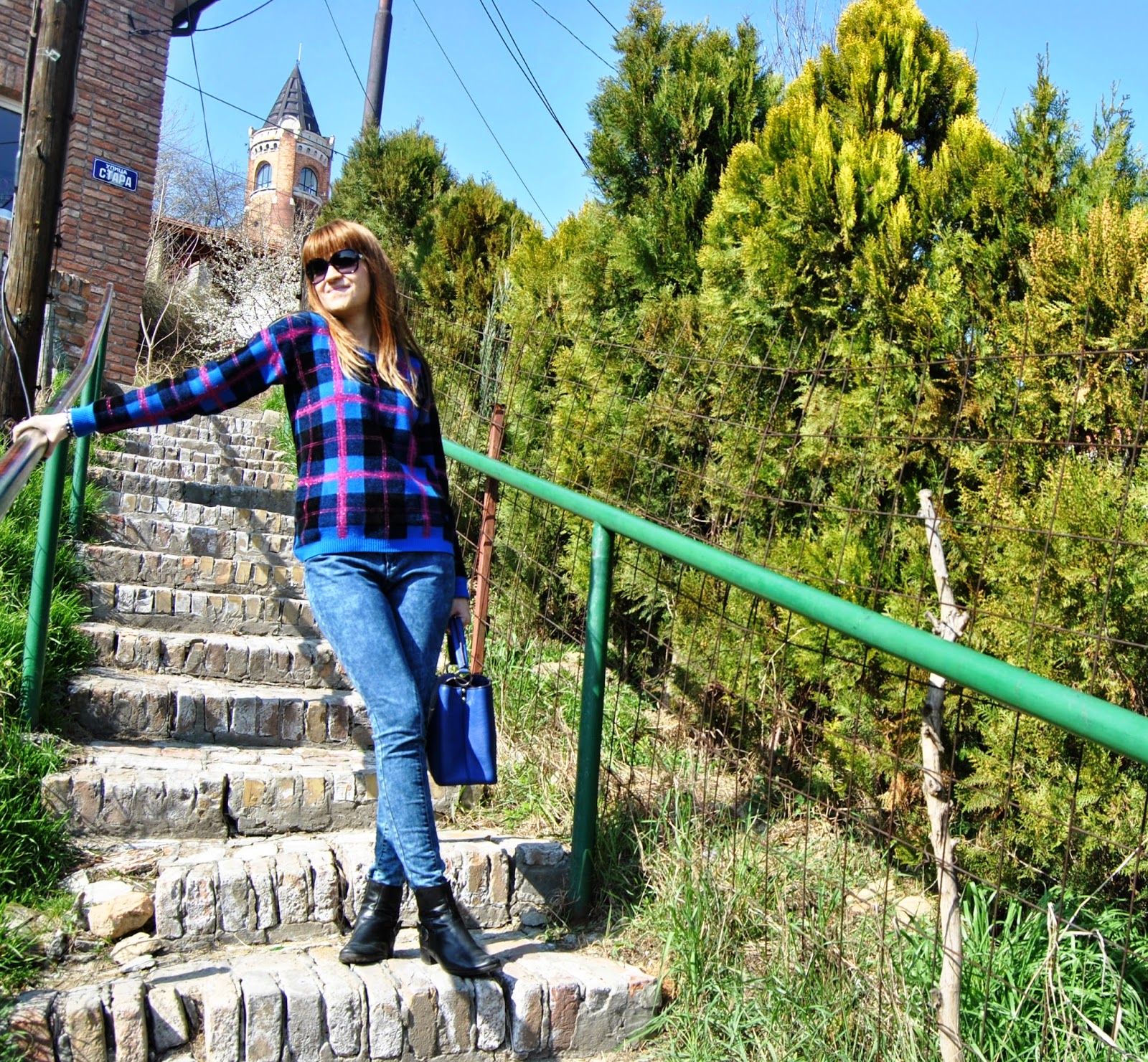 Hello lovelies! Finally, spring is here and we can forget our heavy winter clothes. Before few days, I chose to wear one casual chic outfit in blue shades. Skinny jeans, attractive sweater in 3 colours, ankle boots, favourite royal blue bag, a few accessories and it is it. Super comfortable and trendy look for long walking and enjoying in the sun.