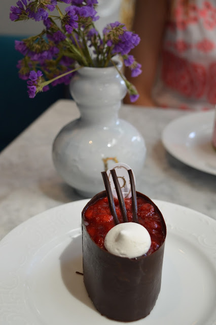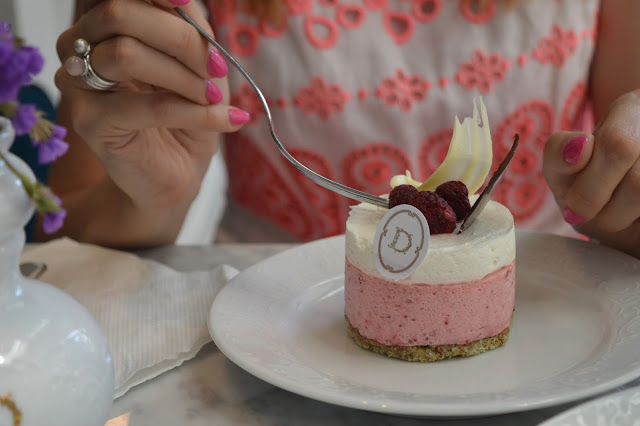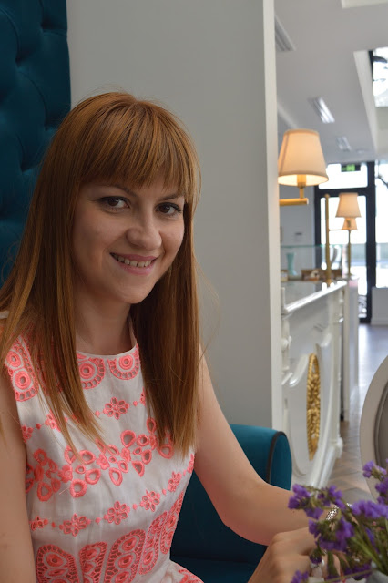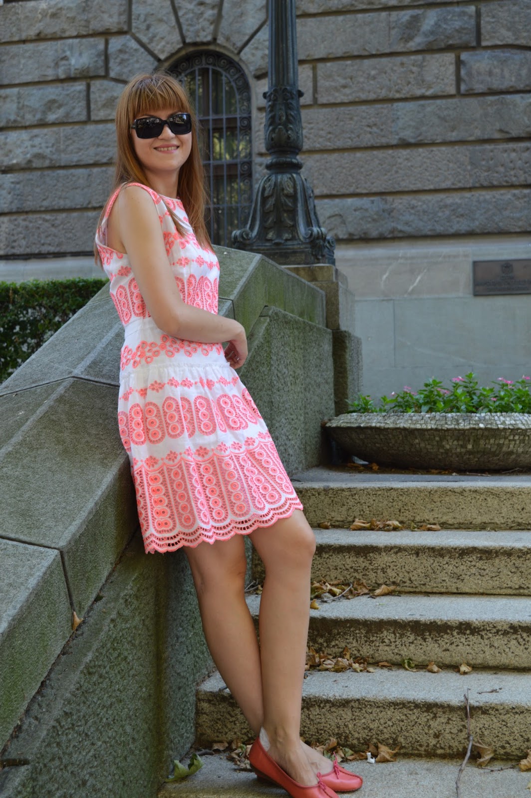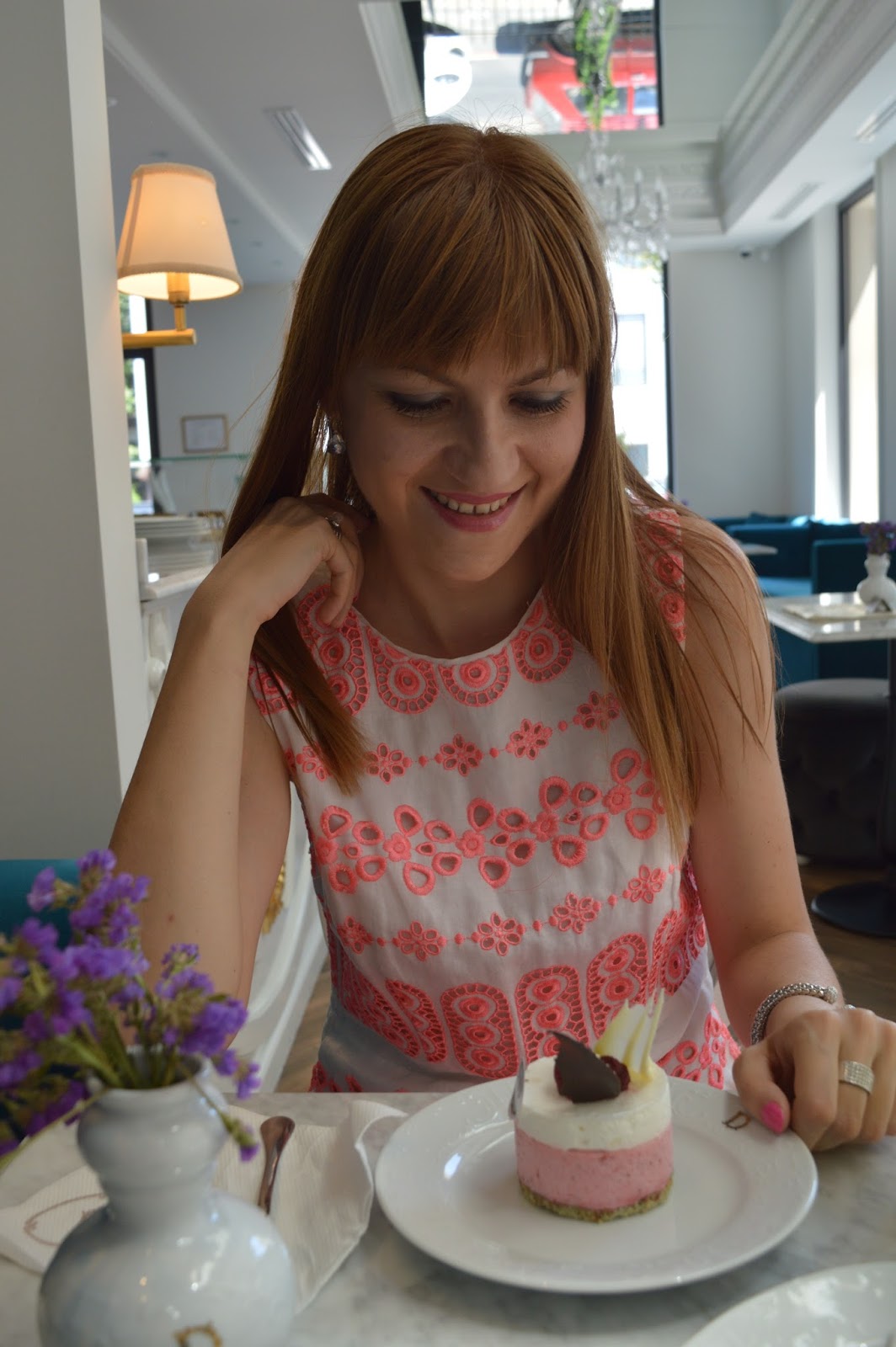 I’ve discovered very cute new place in my town. It is an Italian pastry shop “Dolce Tintolino” with a wide selection of tasty desserts (such as pop cakes, cupcakes, macaroons, fruit and chocolate cakes, Italian gelato…) and with a very pleasant ambient. It was very hard to choose only one cake to degustate. But, I’ll be back there soon to try more of these delicious sweets 🙂 For this occasion (and after that, for a pleasant walking around the city) I have created romantic girly outfit in accordance to pastel baroque ambient. Items, which I picked are this lovely white-coral dress with embroidered details, super comfy coral leather flats and white soft leather bag. Also, there are dark sunnies, two elegant rings and bracelet with Swarovski elements.