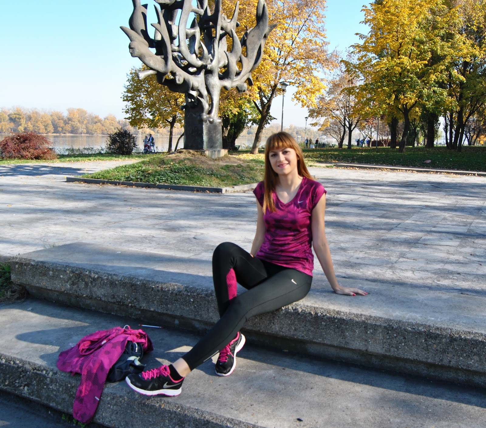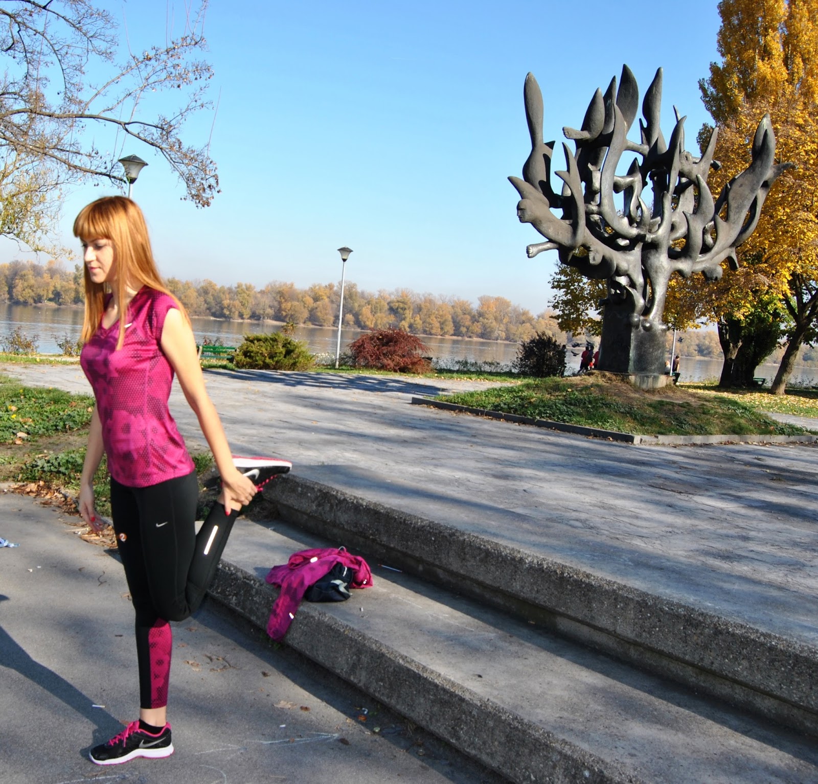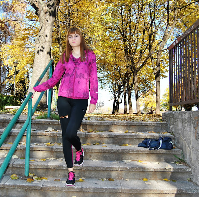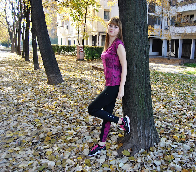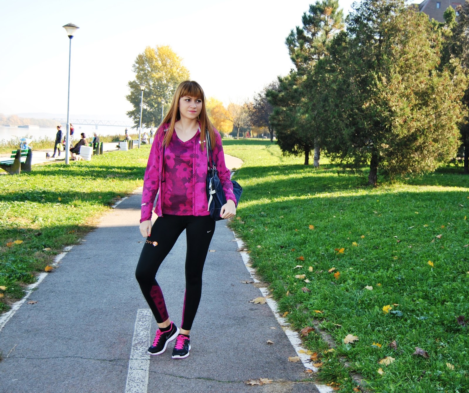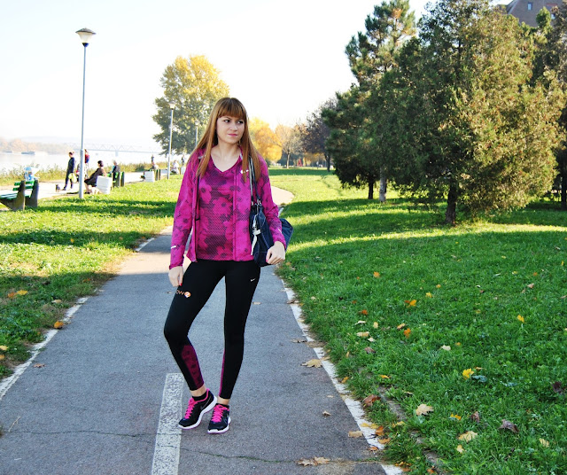 This time, I choose to show you totally Nike outfit in black and pink tones. I prefer to wear leggings for sport activities, comfy t-shirts and sneakers. This is one of my favourite sporty combinations with touch of the feminine style, because the print is with geometrical flowers. Cool, isn’t it! Because, this November is incredibly warm, sunny and beautiful I’ve decided jogging and stretching by the river and choosen this lovely location, near to my home, for photoshooting.