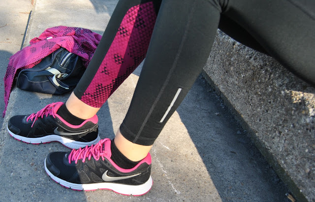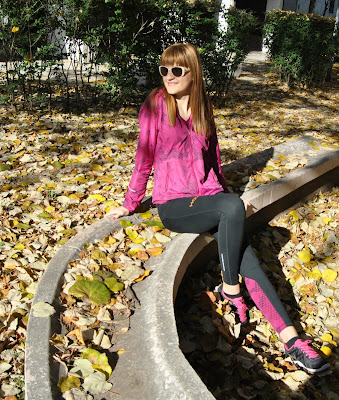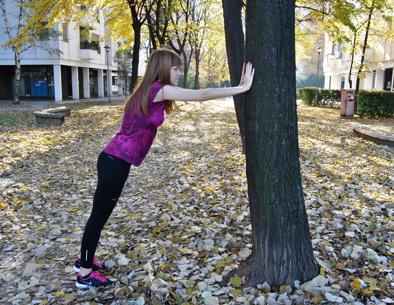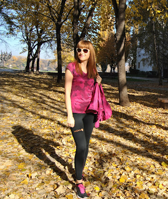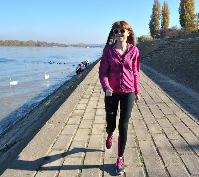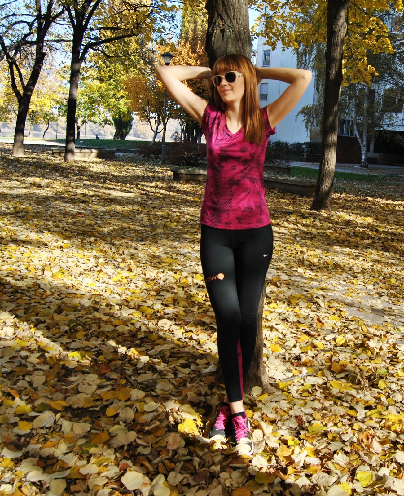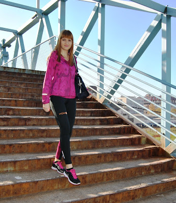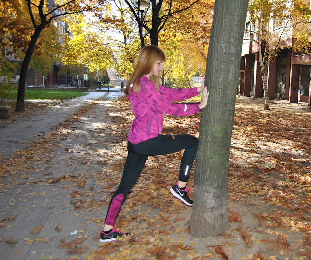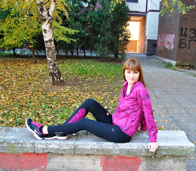 This time, I choose to show you totally Nike outfit in black and pink tones. I prefer to wear leggings for sport activities, comfy t-shirts and sneakers. This is one of my favourite sporty combinations with touch of the feminine style, because the print is with geometrical flowers. Cool, isn’t it! Because, this November is incredibly warm, sunny and beautiful I’ve decided jogging and stretching by the river and choosen this lovely location, near to my home, for photoshooting.