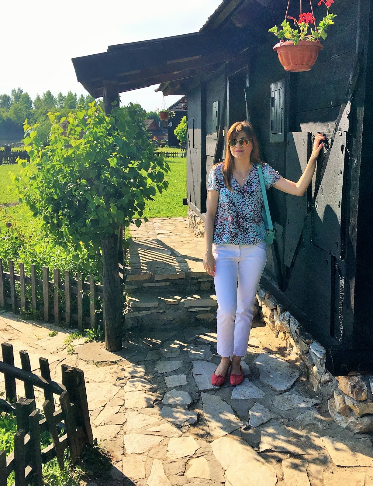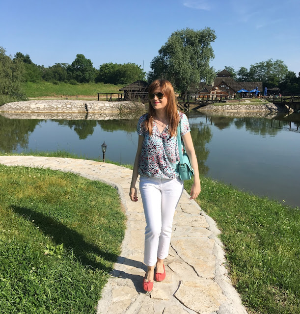 Uživajte u fotografijama koje slede. Za dan u prirodi, izabrala sam komotnu šik kombinaciju: bele farmerke i laganu šarenu bluzu, uz mini tirkiznu torbu i koralne baletanke,