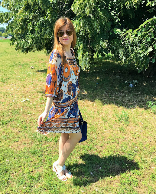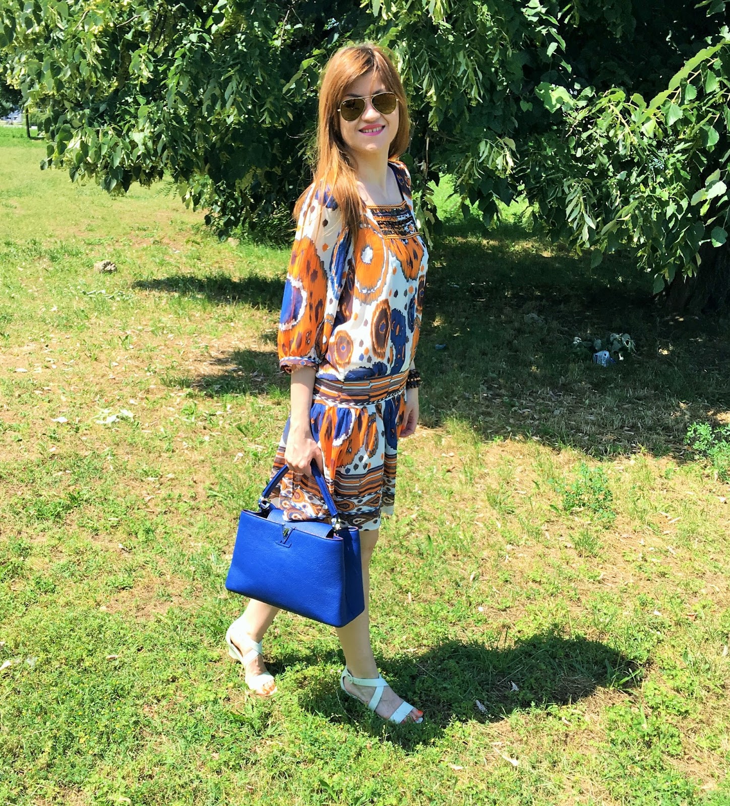 Wearing a pattern or print gives a touch of individuality to every outfit. Summer is especially inspiring to play with colors and patterns. I like this boho dress with beads on the upper part, because of fantastic colorful print and feel so comfortable in this dress. It’s so light and airy. I paired it with attractive white leather sandals with straps and big royal blue bag. Boho vibe is completed with bracelets of wooden beads and classical aviator sunnies. Summer season can begin! I’m ready 🙂