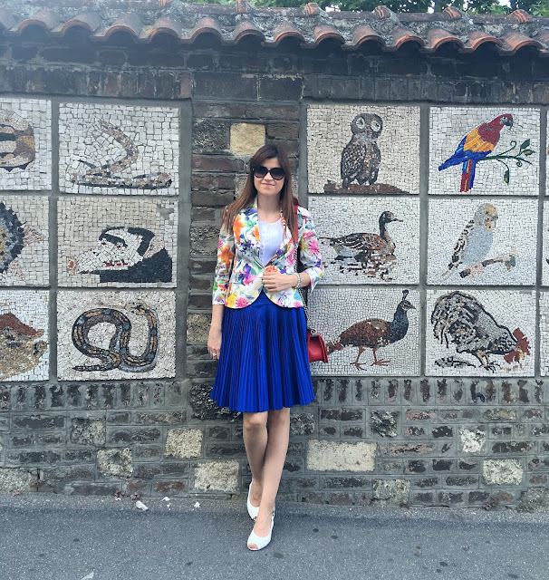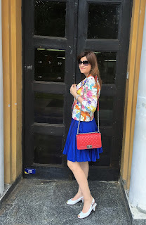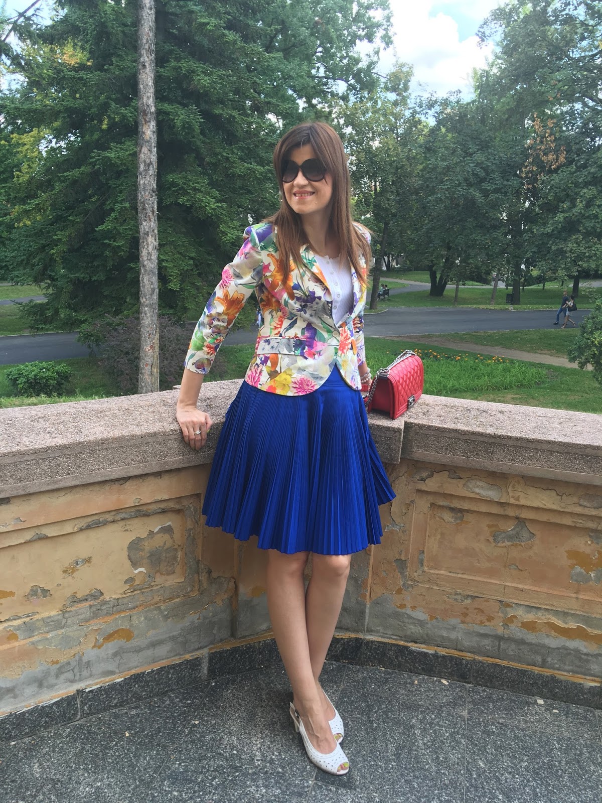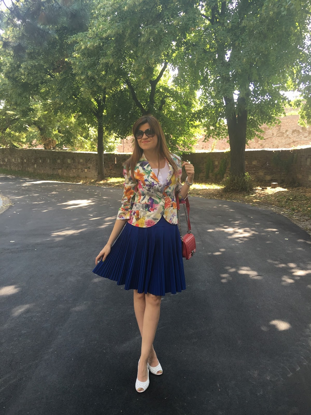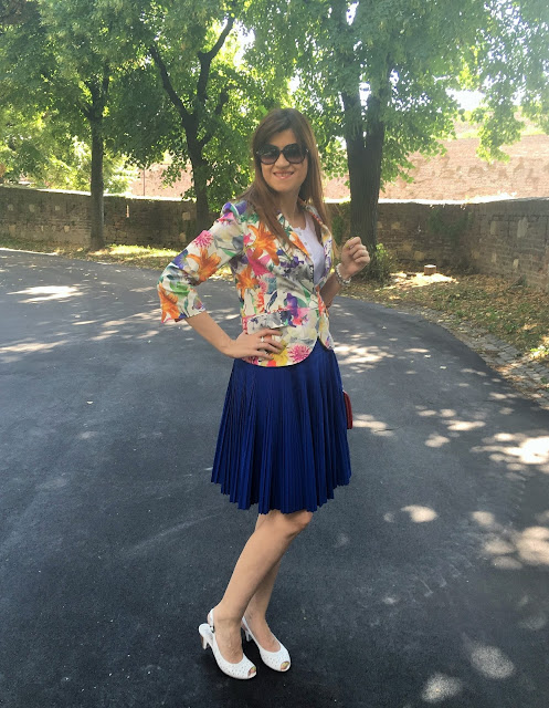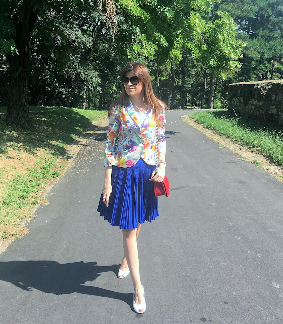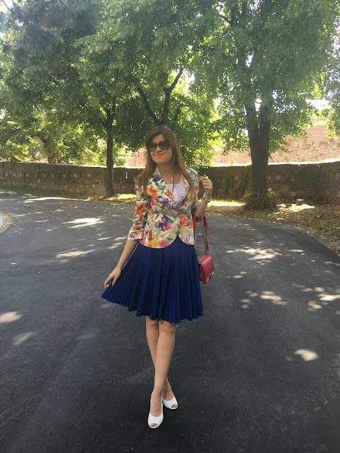 Summer is ideal time of the year to play with colours and patterns. In accordance to that, my today’s outfit is so colourful and fun. I’ve chosen favourite eye-catching pattern for summer. Guess what is it 🙂 Of course, it is big flowers in many bright colours on my blazer. Also, as you probably noticed before, I like to wear pleats and this time it is fantastic pleated skirt in royal blue tone. Totally ladylike look for lovely summer day in the city and why not, acceptable for the office too. Outfit is spiced with touch of retro vibe with these cute sandals, mini bag with long chair and big dark sunnies. Hope you like it!