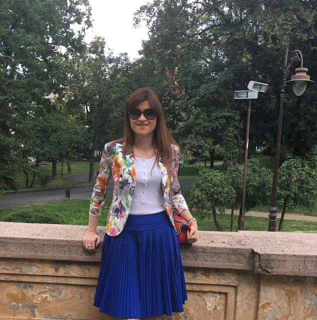 Odlučila sam se za omiljeni letnji dezen. Pretpostavljate, ako već nisu prugice i tufnice, onda su to veliki raznobojni cvetovi 🙂 Ovog puta su u vidu laganog blejzera koji sam ukombinovala sa fenomenalnom suknjom na falte u kraljevski plavoj boji. Cilj mi je bio postići skroz damski izgled začinjen retro vibracijama sa sandalama na rupice, mini torbom sa dugačkim lancem i velikim tamnim naočarima. Nadam se da vam se sviđa.