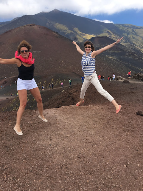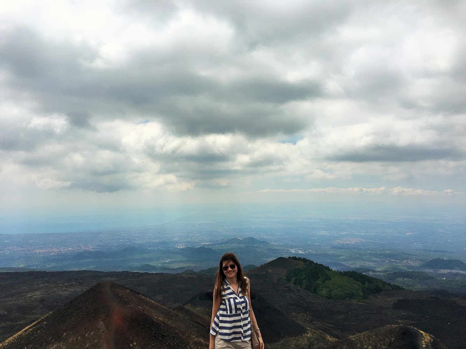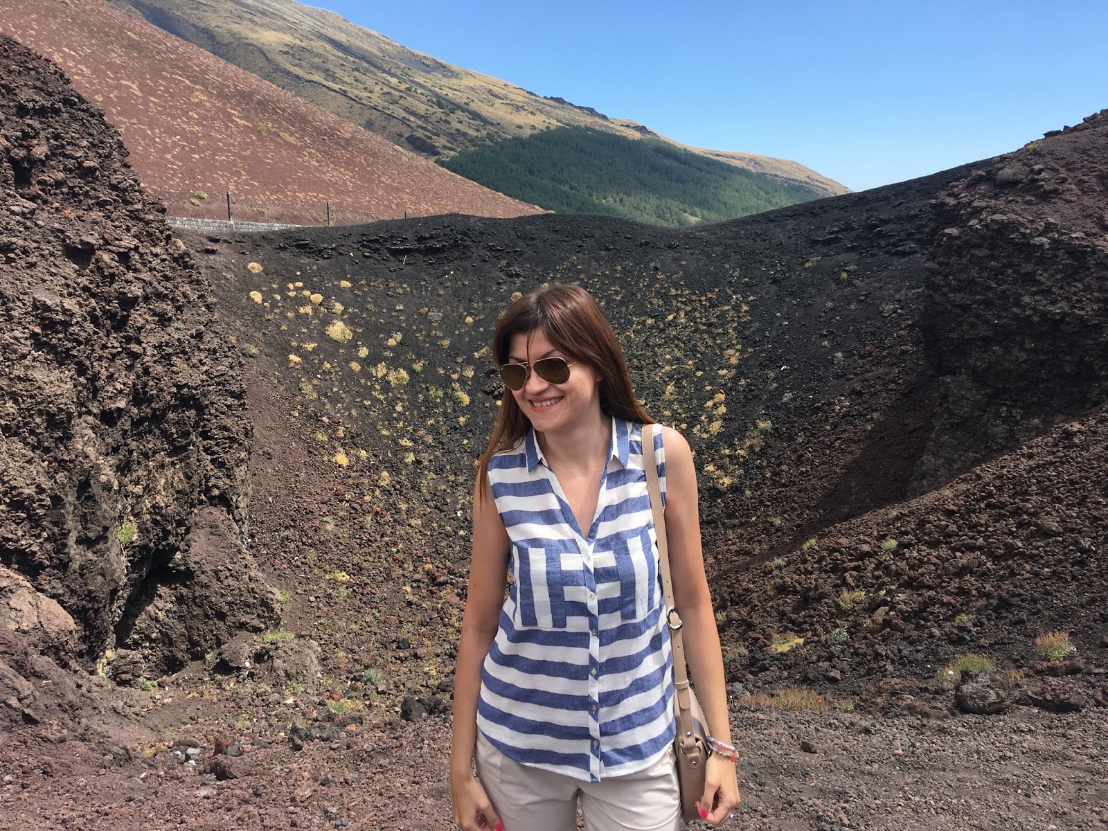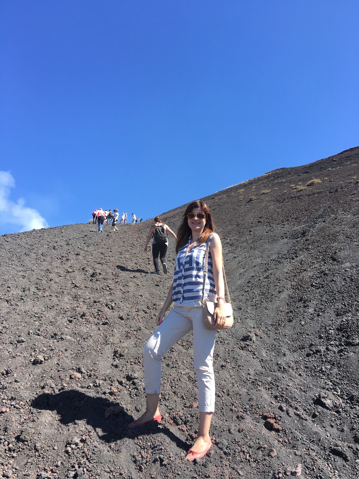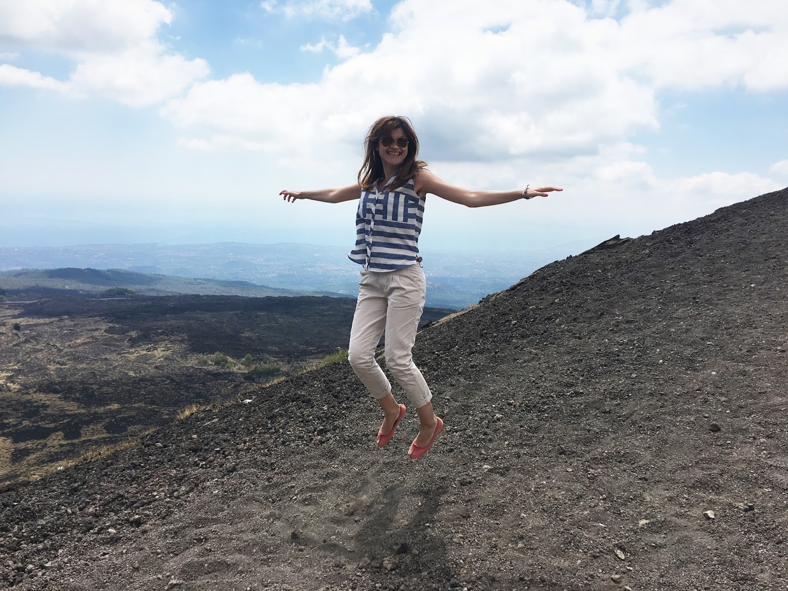 Što se tiče odevne kombinacije za koju sam se odlučila, mislim da nije baš najbolji izbor za penjanje i skakanje u cilju nastanka što bolje luckaste fotke 🙂 Jeste da je outfit skroz udoban i casual šik, ali svetlo bež pantalone su se skroz naprašile, a baletanke od mekane kože ogulile. Ali, to i nije toliko važno, jer šetnja po kraterima je nešto neverovatno i kajala bih se da nisam otišla na ovaj izlet. Pa, ukoliko neko od vas planira da poseti Etnu ili nešto slično, moja preporuka za vas je da obučete npr. šorts, gumene čizme ili duboke patike (svakako, ne nove i omiljene:-)) i ponesite obavezno neku jaknicu ili duks, jer može biti veoma vetrovito i sveže na ovim visinama.