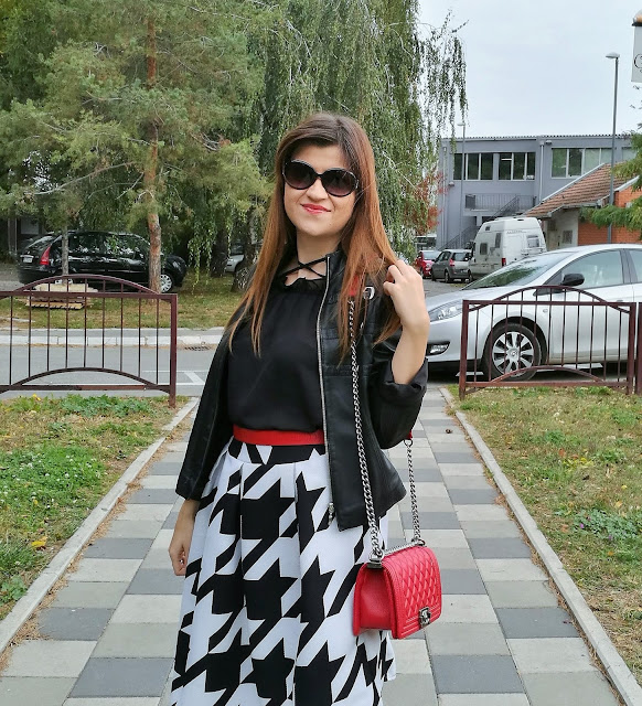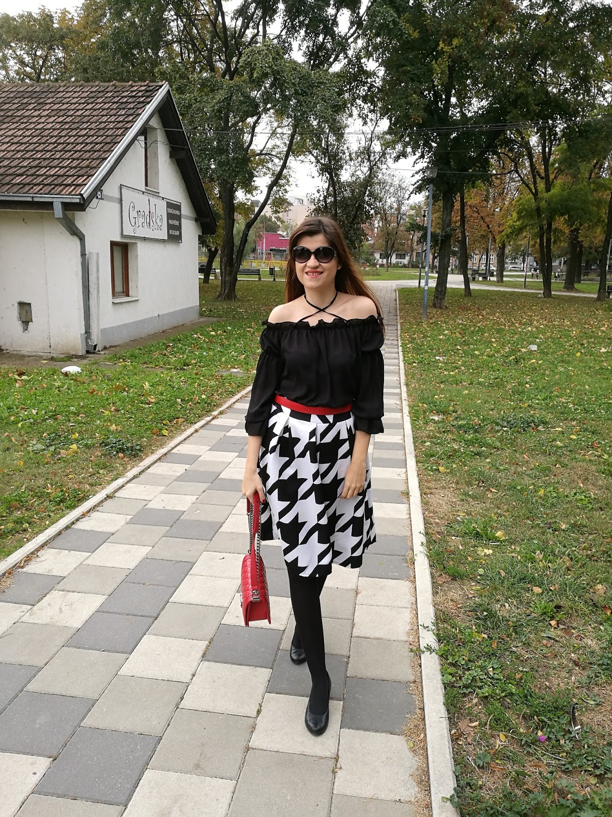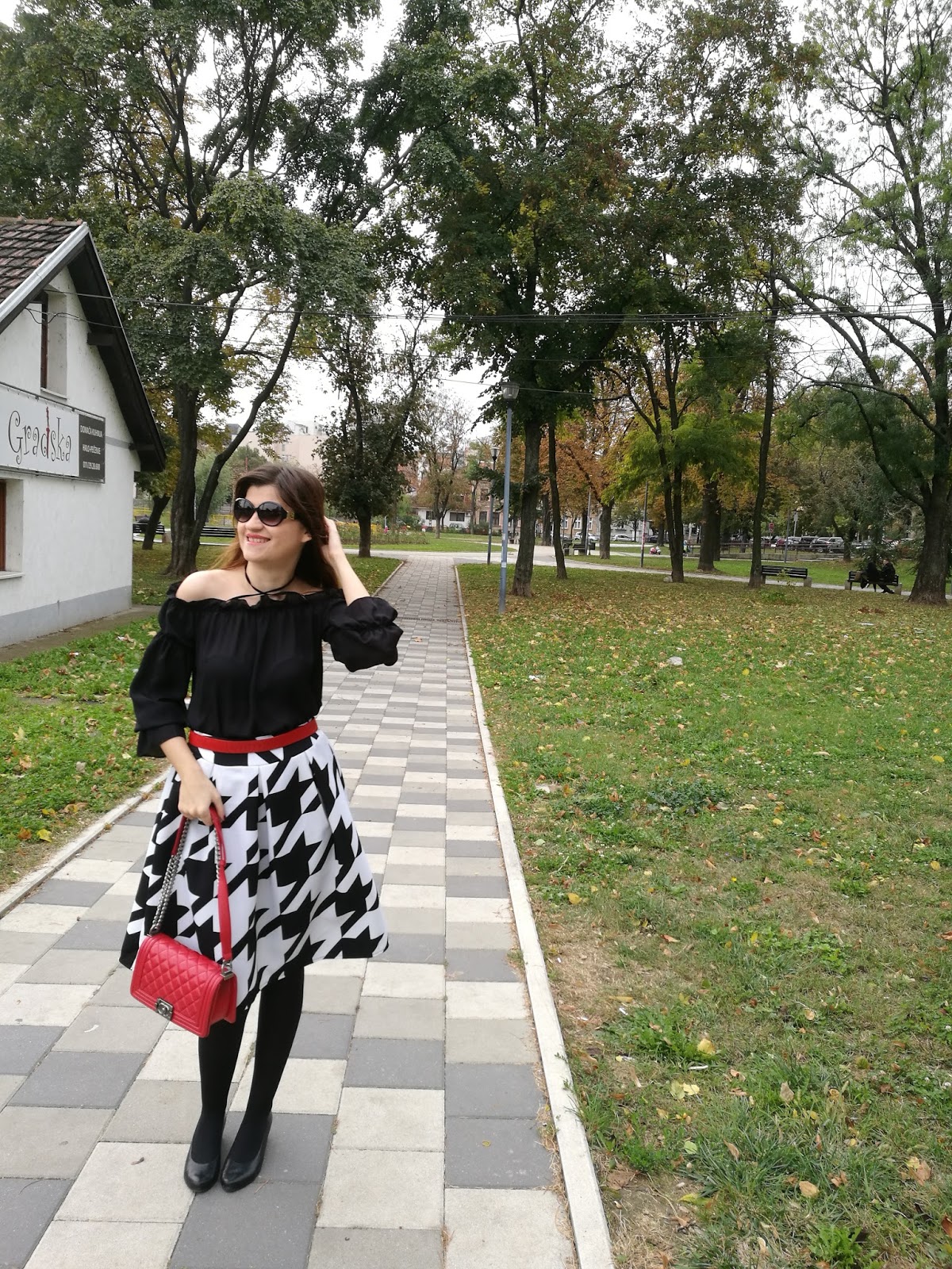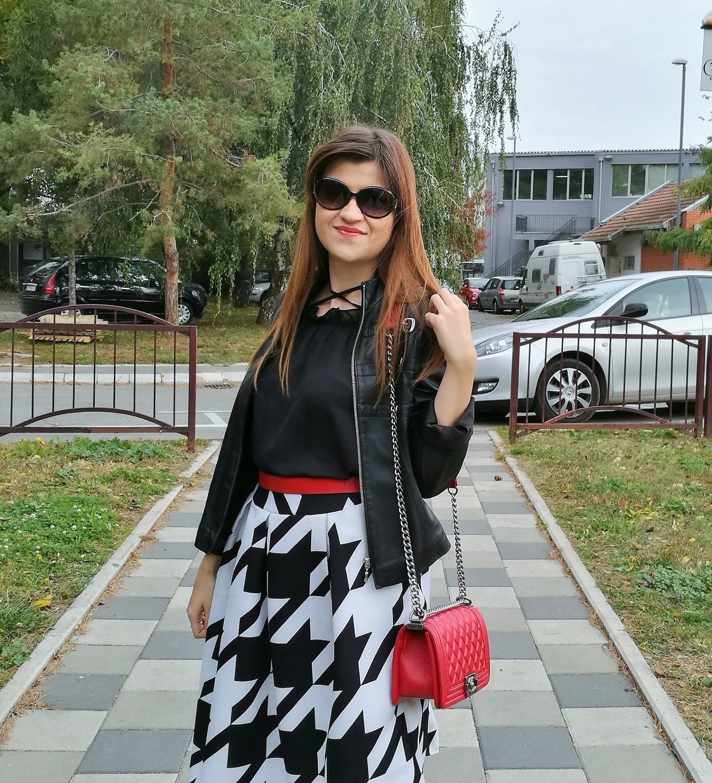 Odevna kombinacija je inspirisana pedesetim godinama prošlog veka, kada se itekako negovao damski, ženstveni izgled. Odlučila sam se za prelepu crno-belu suknju midi dužine, visokog struka i sa geometrijskim dezenom (ovde), kao i za slatku bluzu koja pada na ramena, ima tračicu koja se vezuje oko vrata i suptilne karnere na rukavima (ovde). Preko bluze nabacila sam crnu kožnu jaknu i time se ipak zadržala u ovom vremenu 🙂 Kako bih malo začinila kombinaciju, dodala sam detalje u crvenoj boji: tanki kaiš kao i mini štepanu Chanel tašnu.