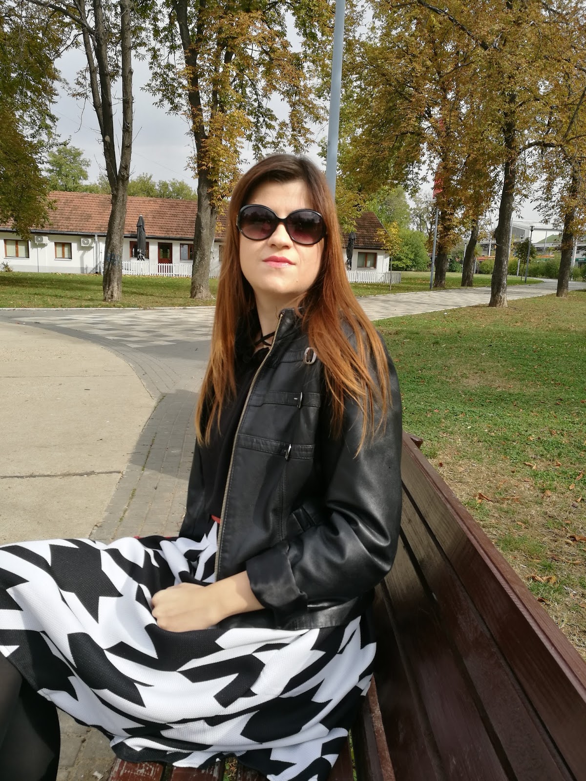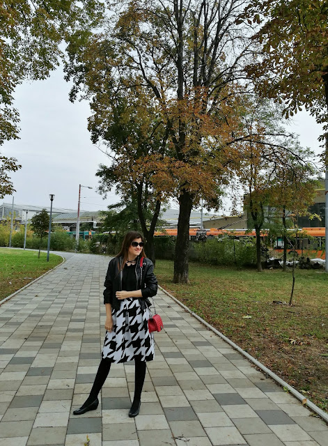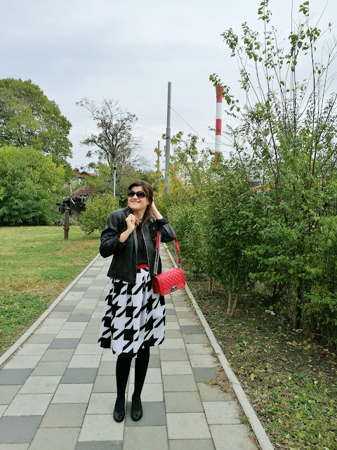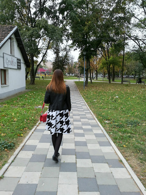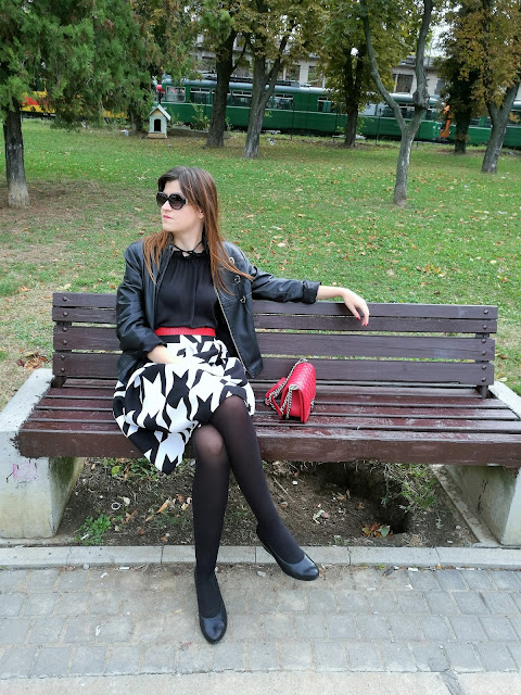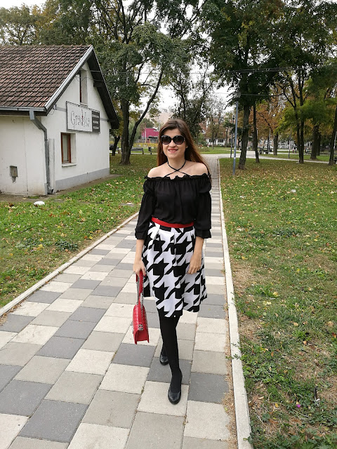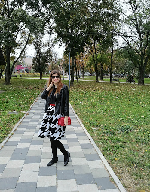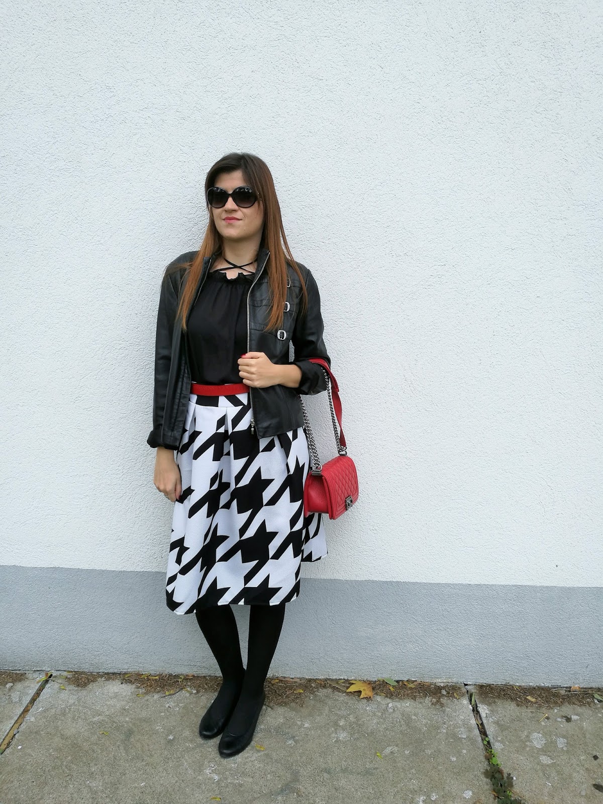 Odevna kombinacija je inspirisana pedesetim godinama prošlog veka, kada se itekako negovao damski, ženstveni izgled. Odlučila sam se za prelepu crno-belu suknju midi dužine, visokog struka i sa geometrijskim dezenom (ovde), kao i za slatku bluzu koja pada na ramena, ima tračicu koja se vezuje oko vrata i suptilne karnere na rukavima (ovde). Preko bluze nabacila sam crnu kožnu jaknu i time se ipak zadržala u ovom vremenu 🙂 Kako bih malo začinila kombinaciju, dodala sam detalje u crvenoj boji: tanki kaiš kao i mini štepanu Chanel tašnu.