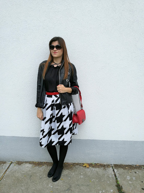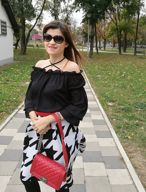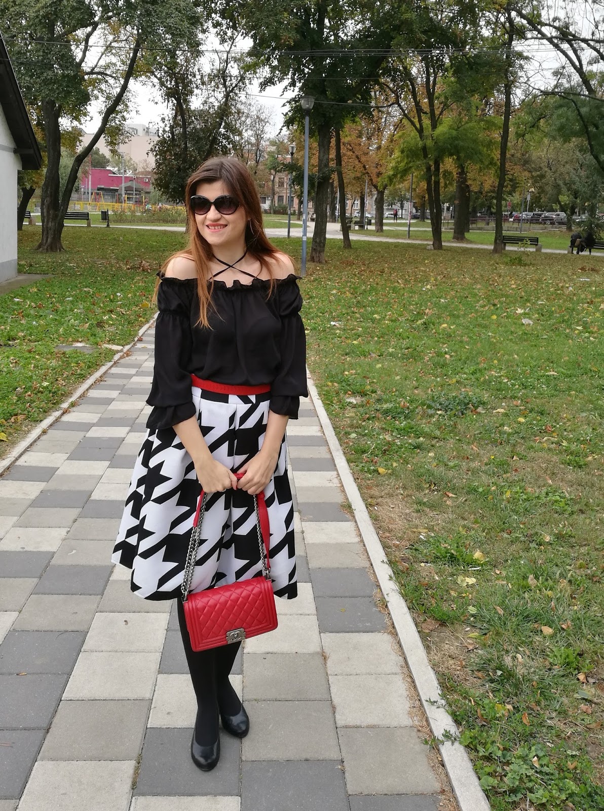 Outfit is inspired by the fifties of the last century when was popular ladylike, feminine look. So, I’ve picked this fantastic black & white midi skirt with high waist and geometrical print (find it here) and this cute off-the-shoulder halter flounced blouse (find it here). Over the blouse I’ve worn black, leather jacket and thus still kept in the spirit of the modern age 🙂 To make outfit more interesting I simply add pop of red with Chanel boy bag and thin belt.