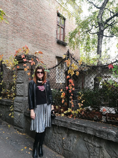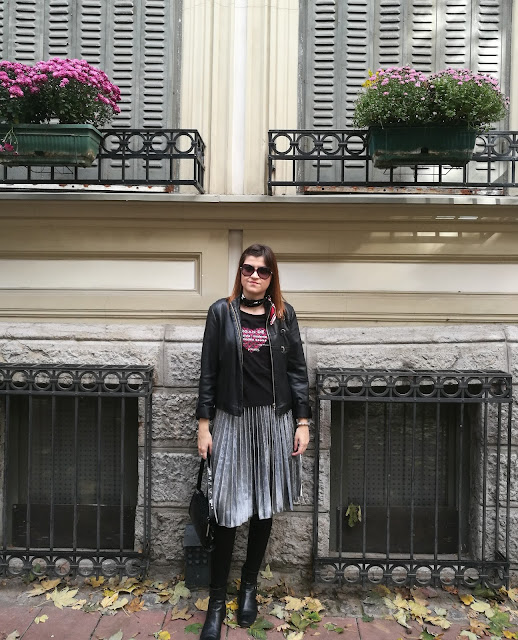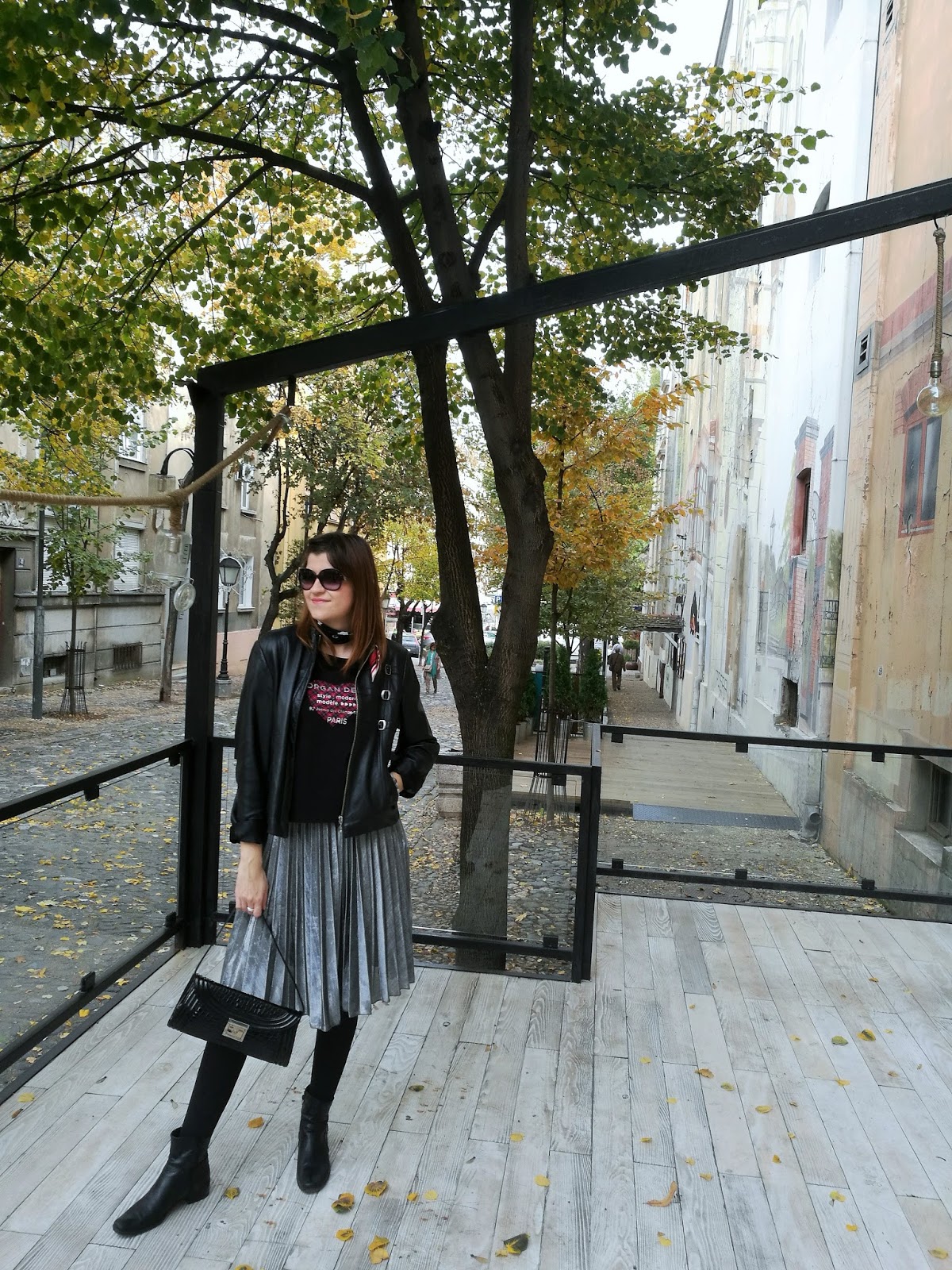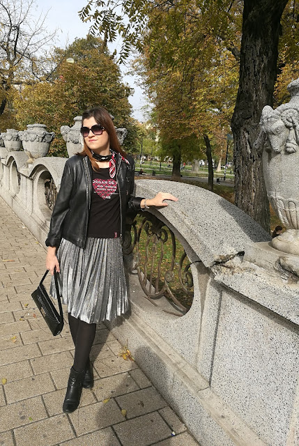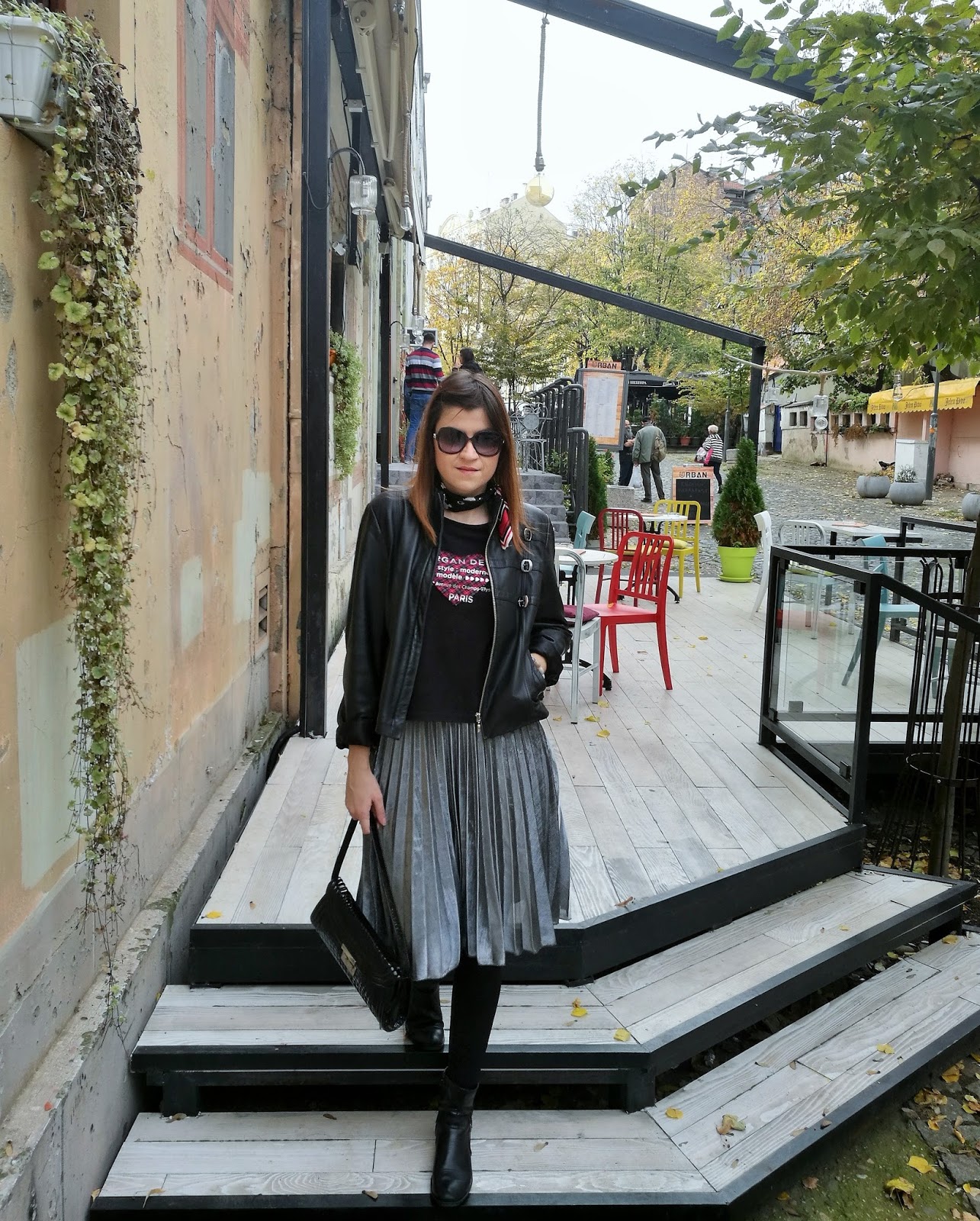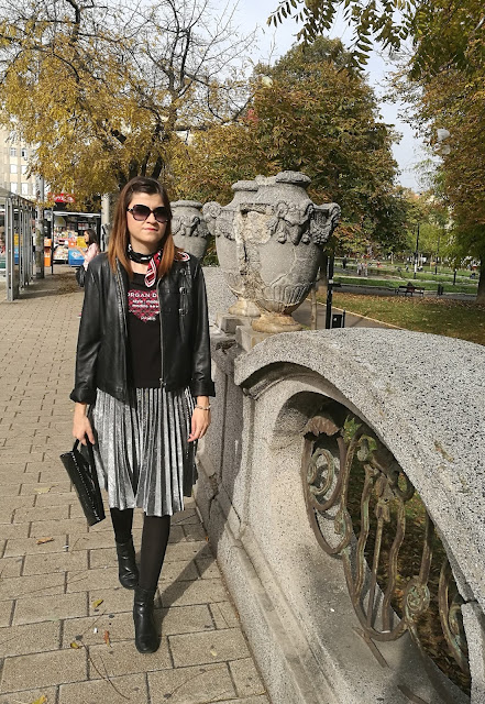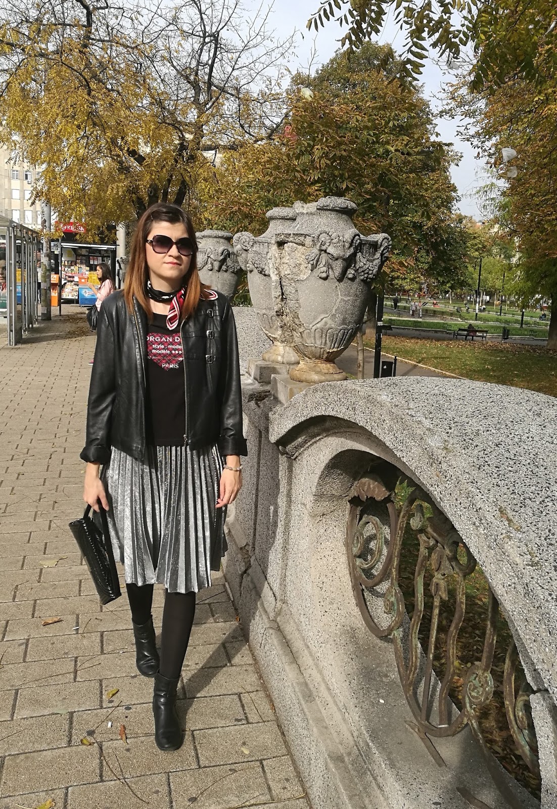 Upravo jedan takav outfit možete videti u ovom postu i on nosi prizvuk rock’n’roll-a u sebi, zahvaljujući crnoj bajkerki, bandana marami, majici sa kariranim printom i gležnjačama. Ženstvenu notu dodala sam baš sa ovom srebrnom plisiranom suknjom midi dužine. Tu je još i nekoliko detalja koji zaokružuju celu kombinaciju.