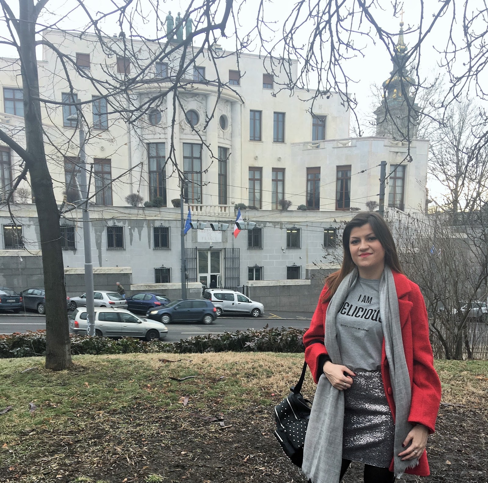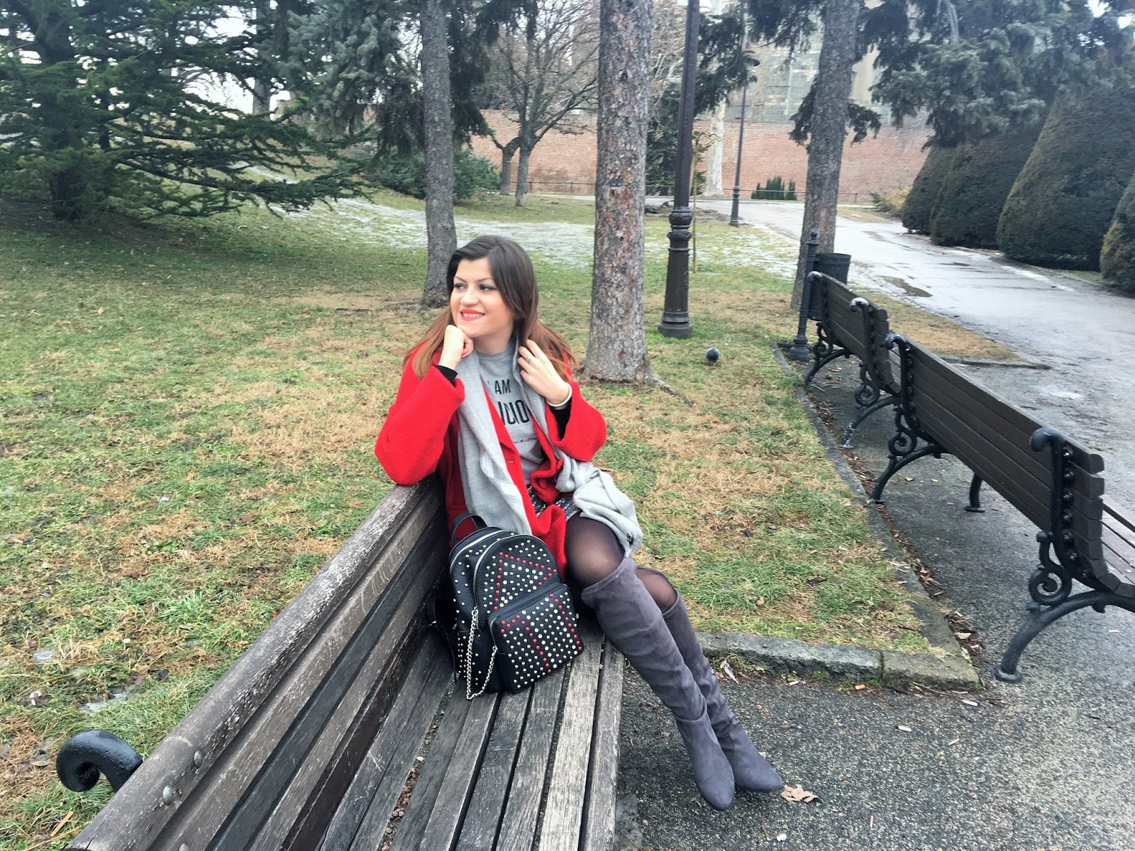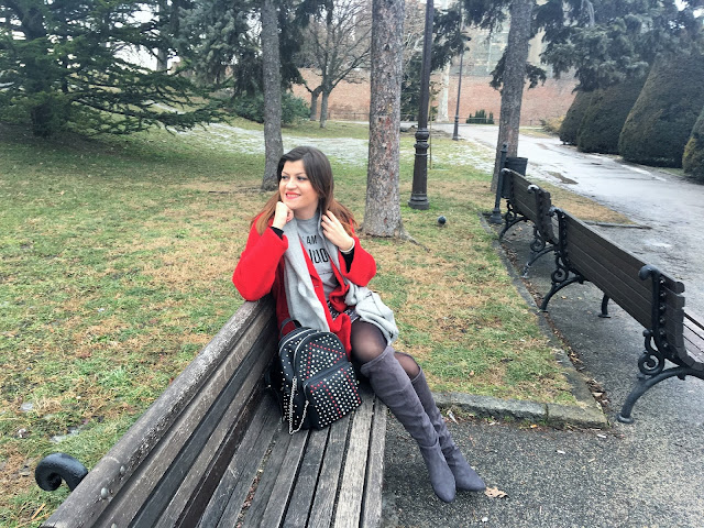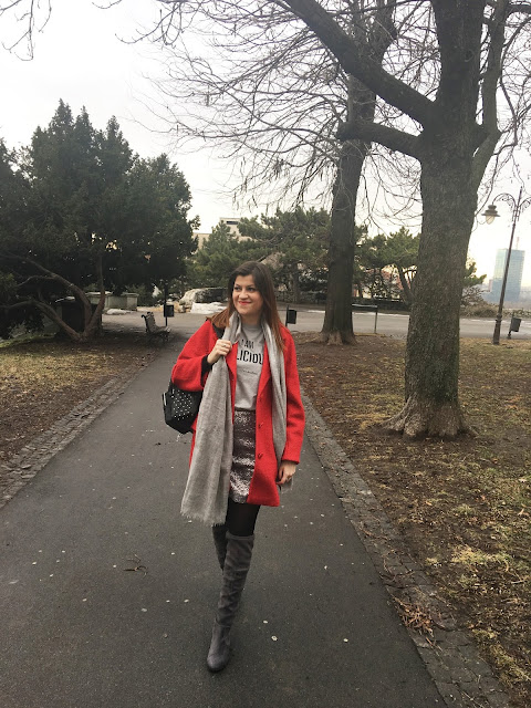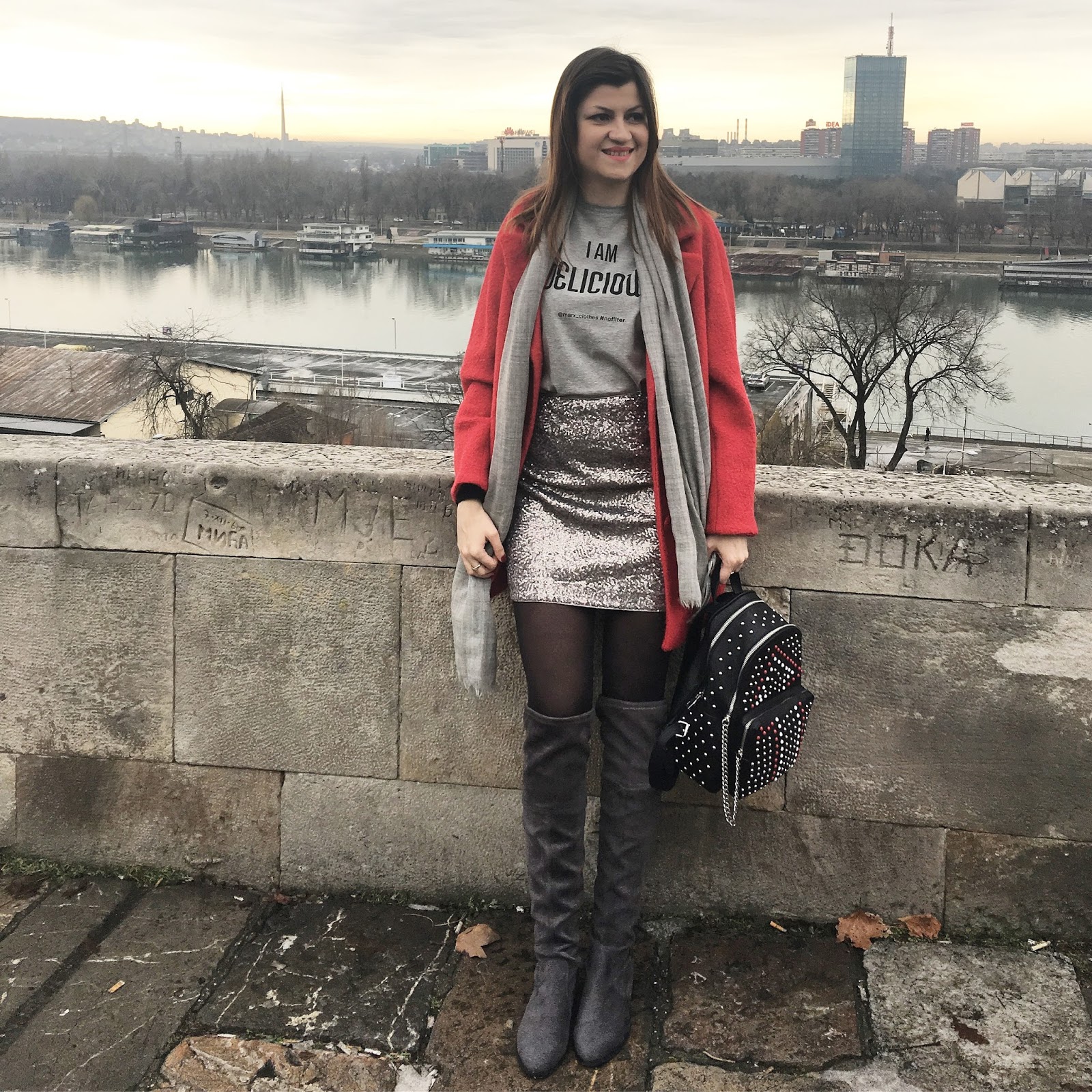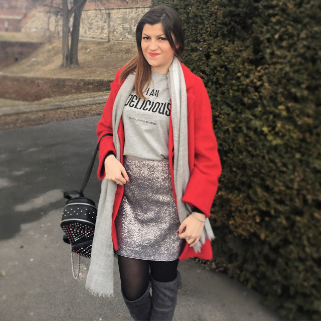 Today, I am playing with mini silver sequin skirt and making a cute and effortless streetstyle look. The trick is simple: pair sequin skirt with a cool casual logo tee and you’ll successfully dress down sequins and make it daytime appropriate. Top the look with red oversized coat, big woollen scarf, trendy backpack with rivets and velvet over-the-knee boots. Grey tones with pop of red and black made this outfit so lovely!