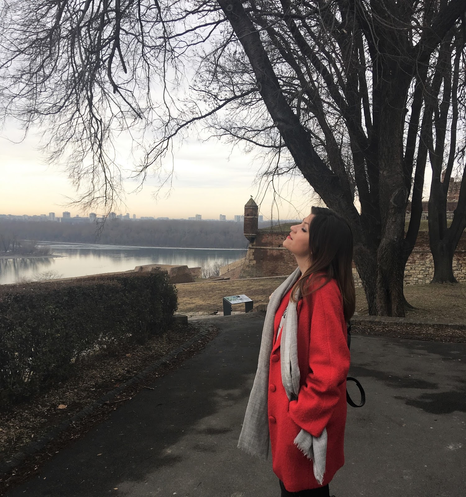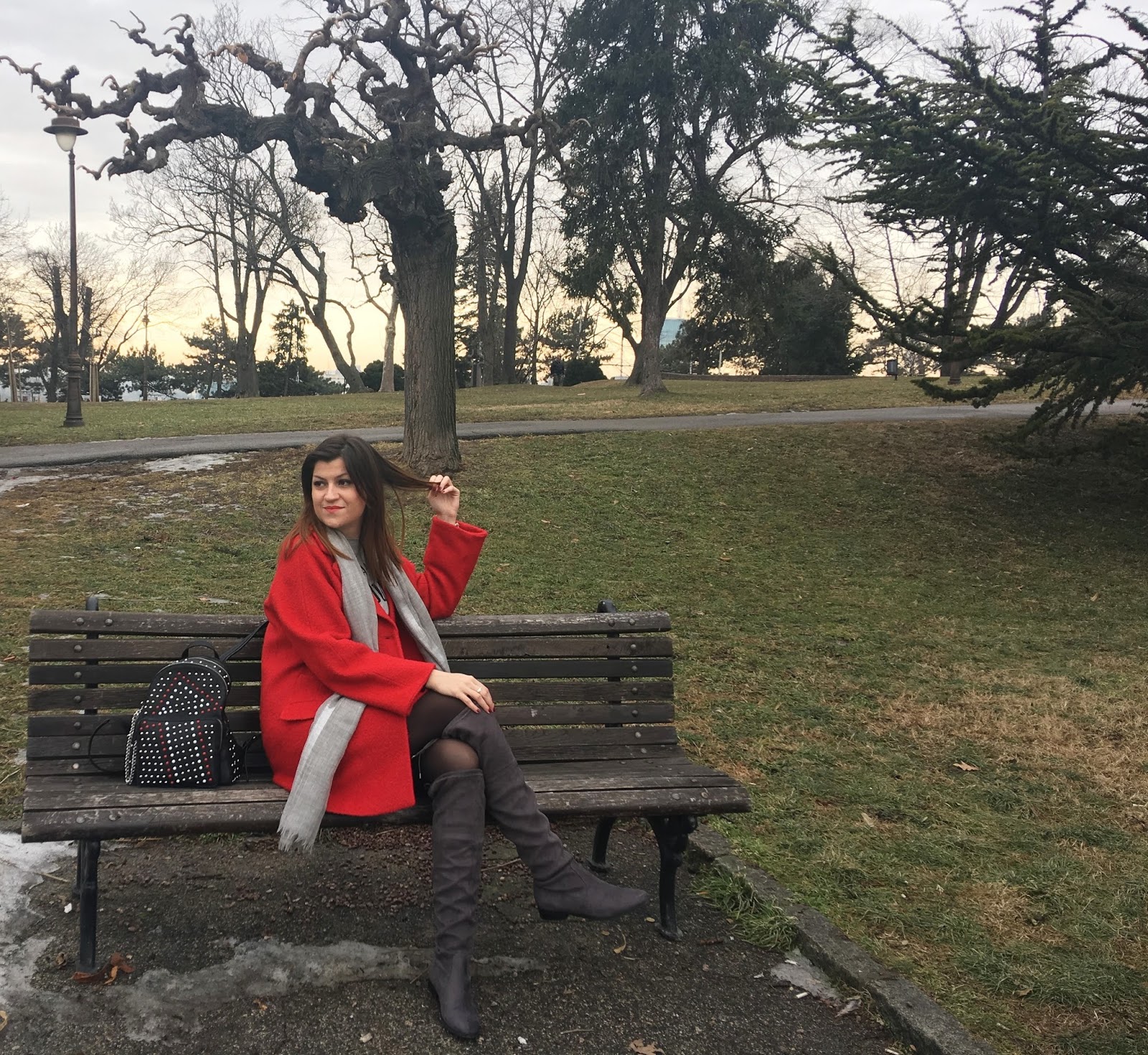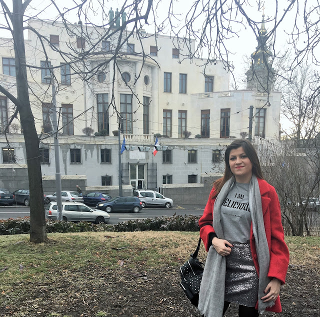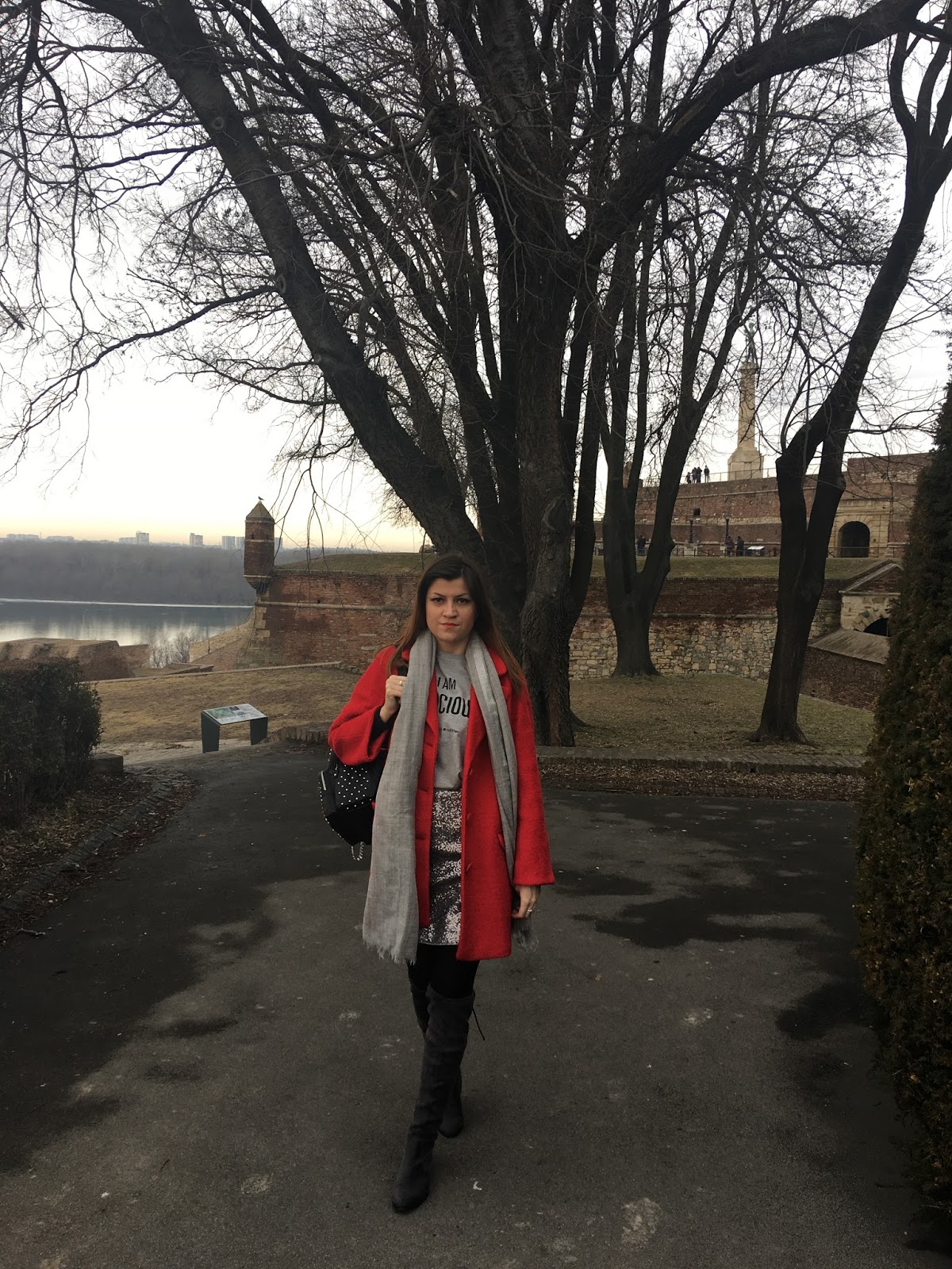 Today, I am playing with mini silver sequin skirt and making a cute and effortless streetstyle look. The trick is simple: pair sequin skirt with a cool casual logo tee and you’ll successfully dress down sequins and make it daytime appropriate. Top the look with red oversized coat, big woollen scarf, trendy backpack with rivets and velvet over-the-knee boots. Grey tones with pop of red and black made this outfit so lovely!