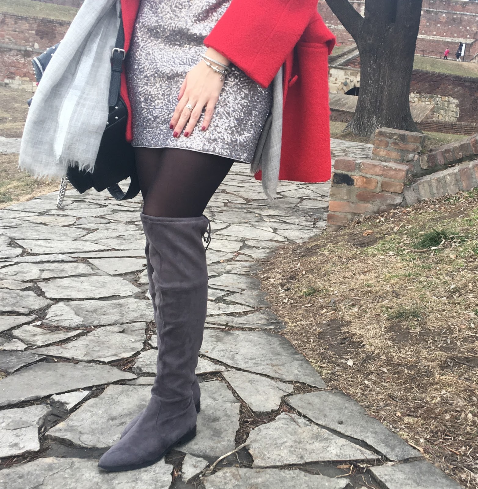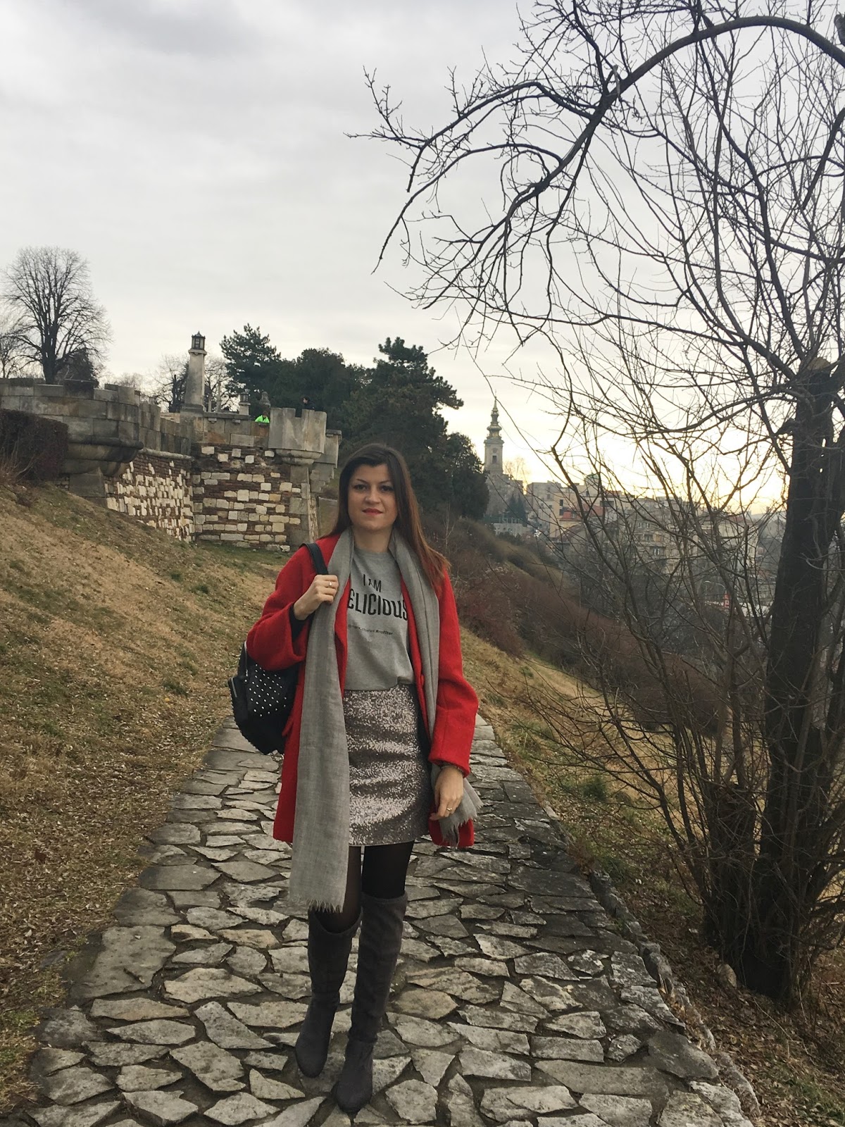Moj primer upravo možete pogledati u okviru ovog posta. Odlučila sam se za mini suknju sa srebrnim šljokicama koju sam iskombinovala sa pamučnom sivom majicom sa cool natpisom, sivim plišanim čizmama preko kolena, komfornim crvenim kaputom, dugim sivim šalom i trendi ruksakom sa nitnicama. Sivi tonovi uz dodatak crvene i crne izgledaju veoma atraktivno i daju efekat dopadljivog uličnog šik stila.
