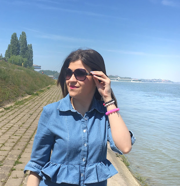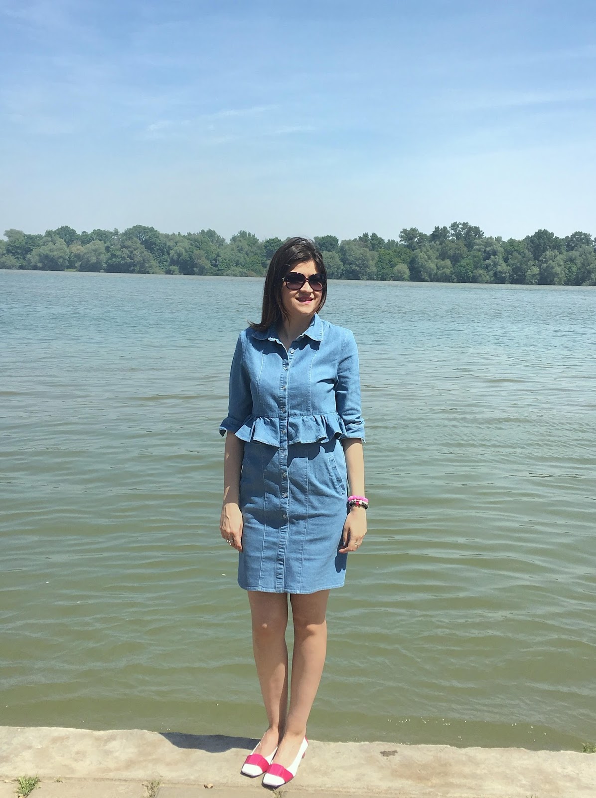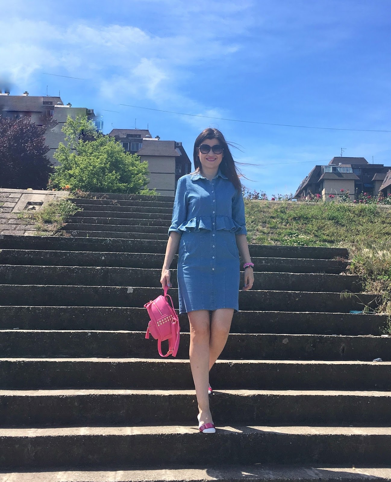 U današnjem postu videćete jednu od trenutno omiljenih denim haljina koje posedujem u garderoberu. Sviđa mi se što je istovremeno i ženstvena i udobna. Na prvi pogled, možete pomisliti da je reč o denim kompletu – košulji i suknji, a zapravo to je optička varka zbog ljupkog karnera na samoj sredini haljine. Uz haljinu sam dodala preslatki mini ranac u jarkoj pink nijansi sa ukrasnim trendi nitnama. Takođe, tu su i dvobojne baletanke, tamno plave naočare i narukvice sa raznobojnim perlicama.