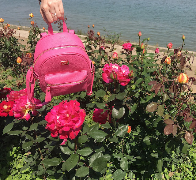 I paired it with this cute a little fellow in bright pink tone. Yes, it is trendy backpack with decorative metal rivets. Two colored shoes, dark blue sunnies and bracelet with beads complete today’s outfit.