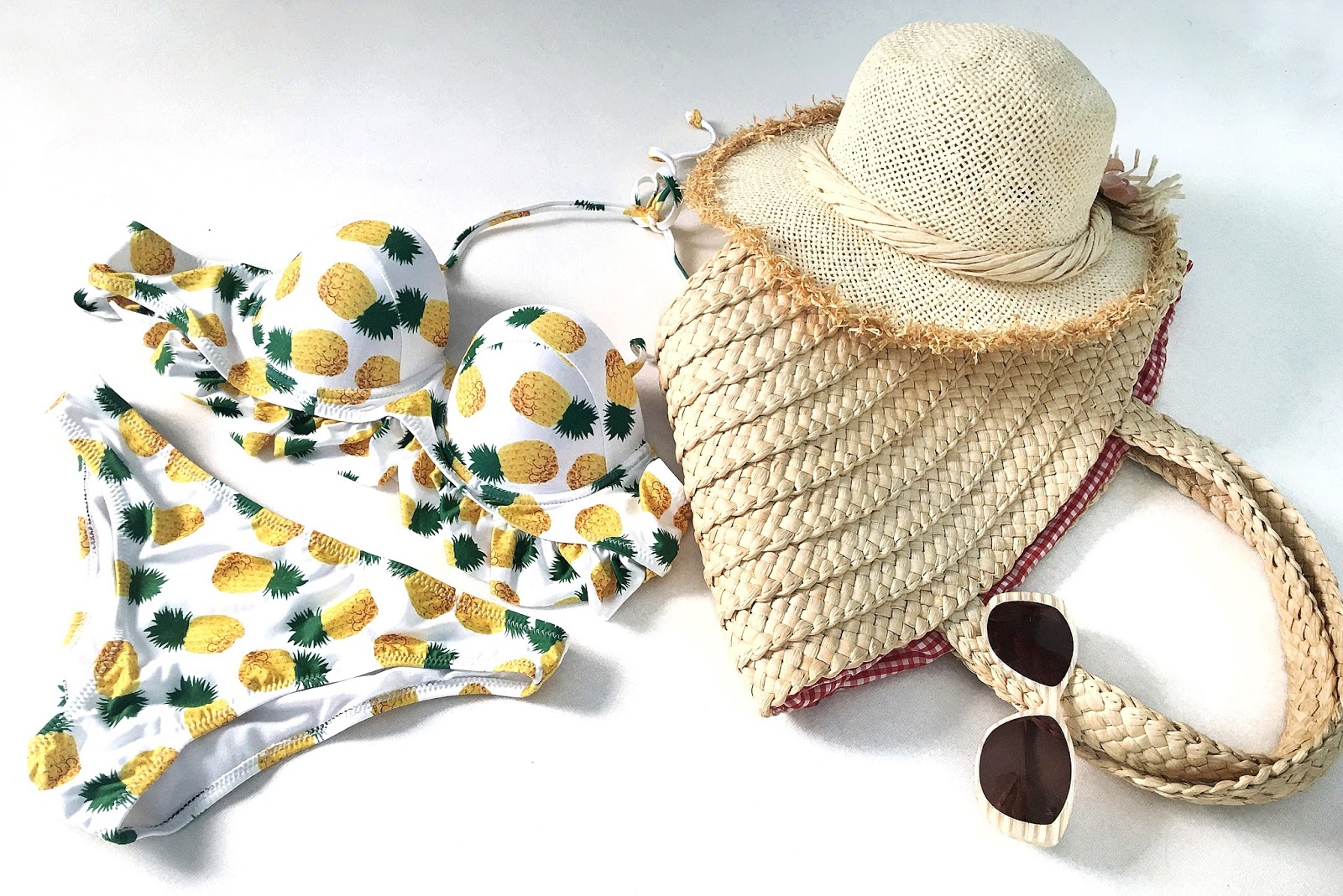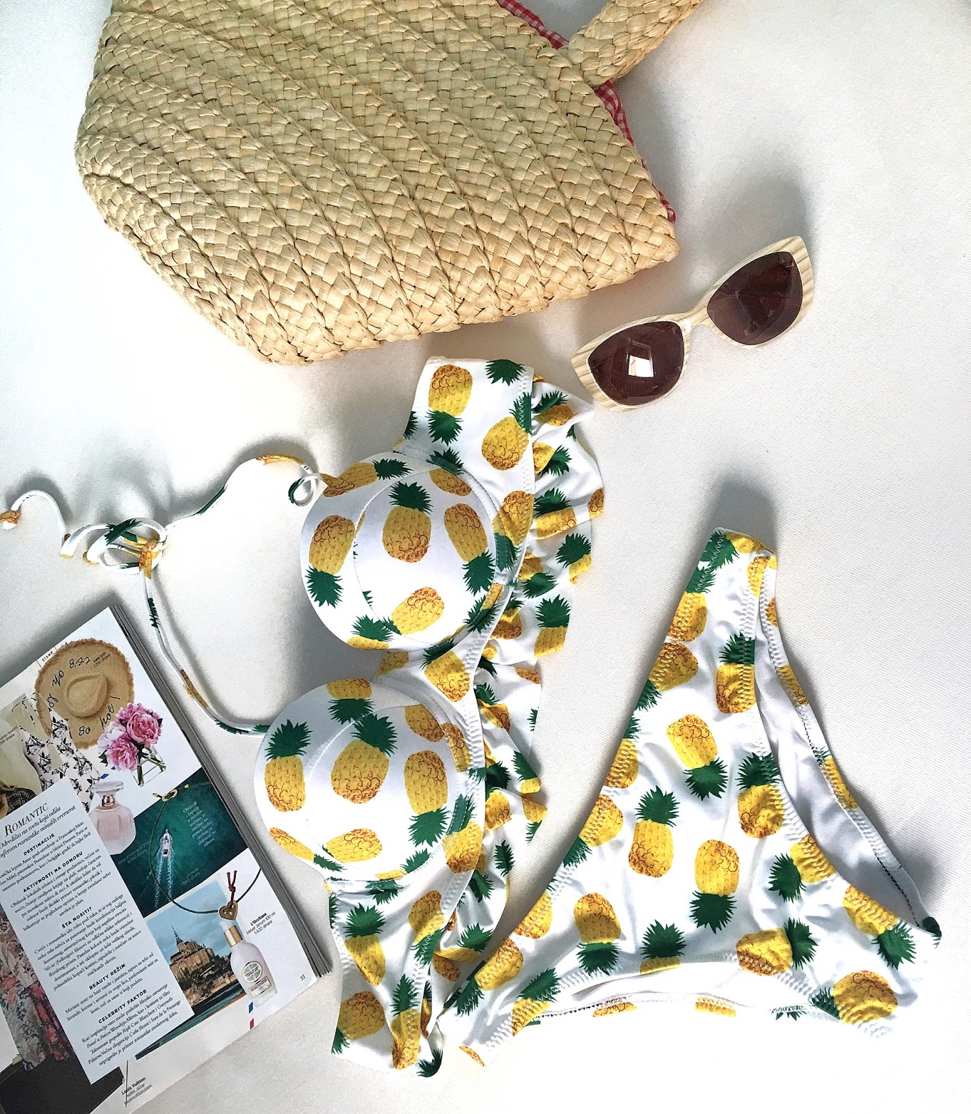 Veoma su aktuelni bikiniji jarkih boja i živopisnih dezena inspirisani tropskim rastinjem i egzotičnim voćem. Jedan takav sa ananas printom je upravo pred vama. Oduševio me je kako bojama i printom tako i sa preslatkim karnerićima na gornjem delu. Prava modna poslastica, ako mene pitate!