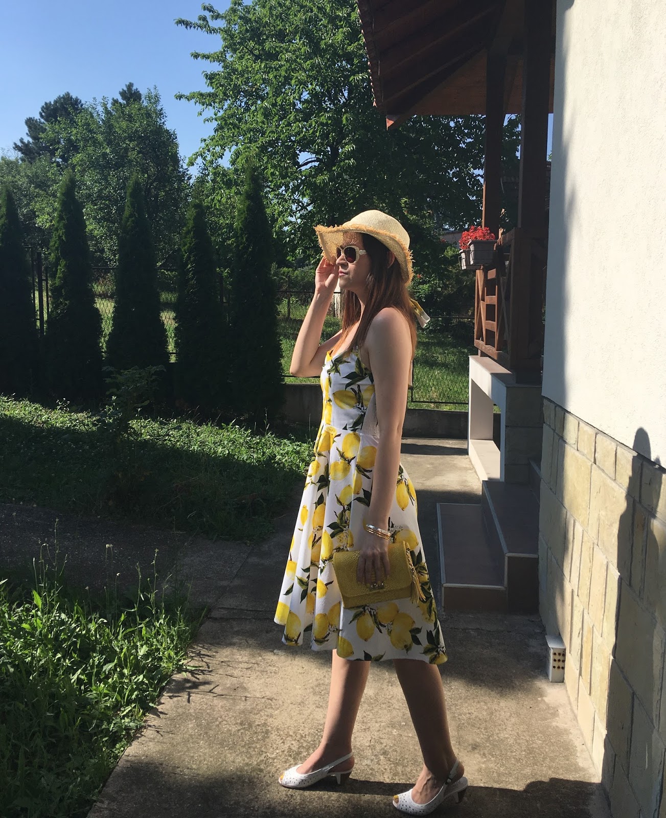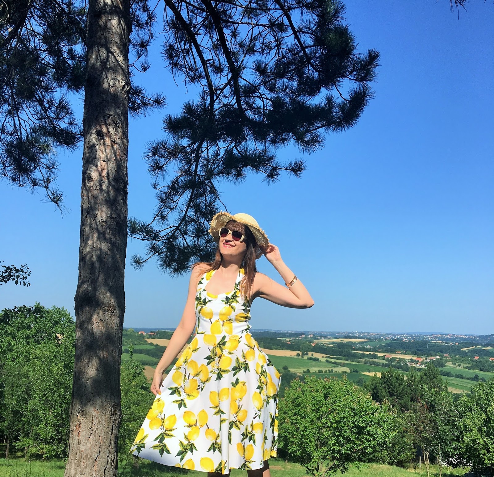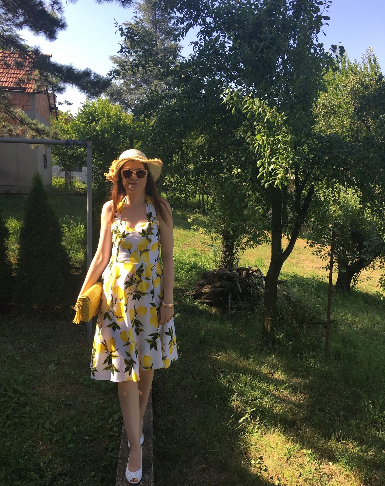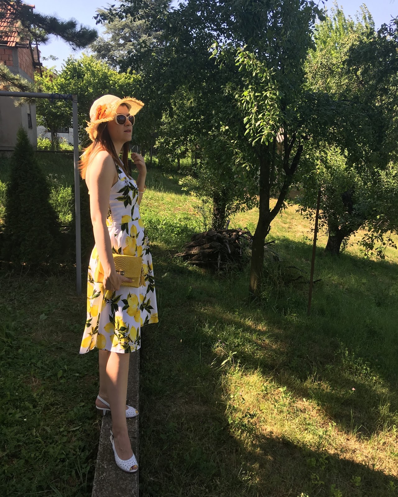 Odlučila sam se za divnu damsku haljinu sa limun printom, vintidž kroja, koja se vezuje oko vrata. Ukoliko vam se dopada, možete je pronaći ovde. Pamučna je i veoma udobna, tako da od mene imate toplu preporuku što se nje tiče. Ostatak kombinacije je sveden, kako bi trendi limun print najbolje došao do izražaja. Tu su retro rupičaste bele sandale sa malom potpeticom, bež naočare, slojevite narukvice i slamnati šešir.