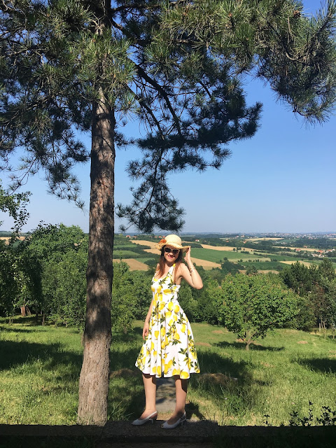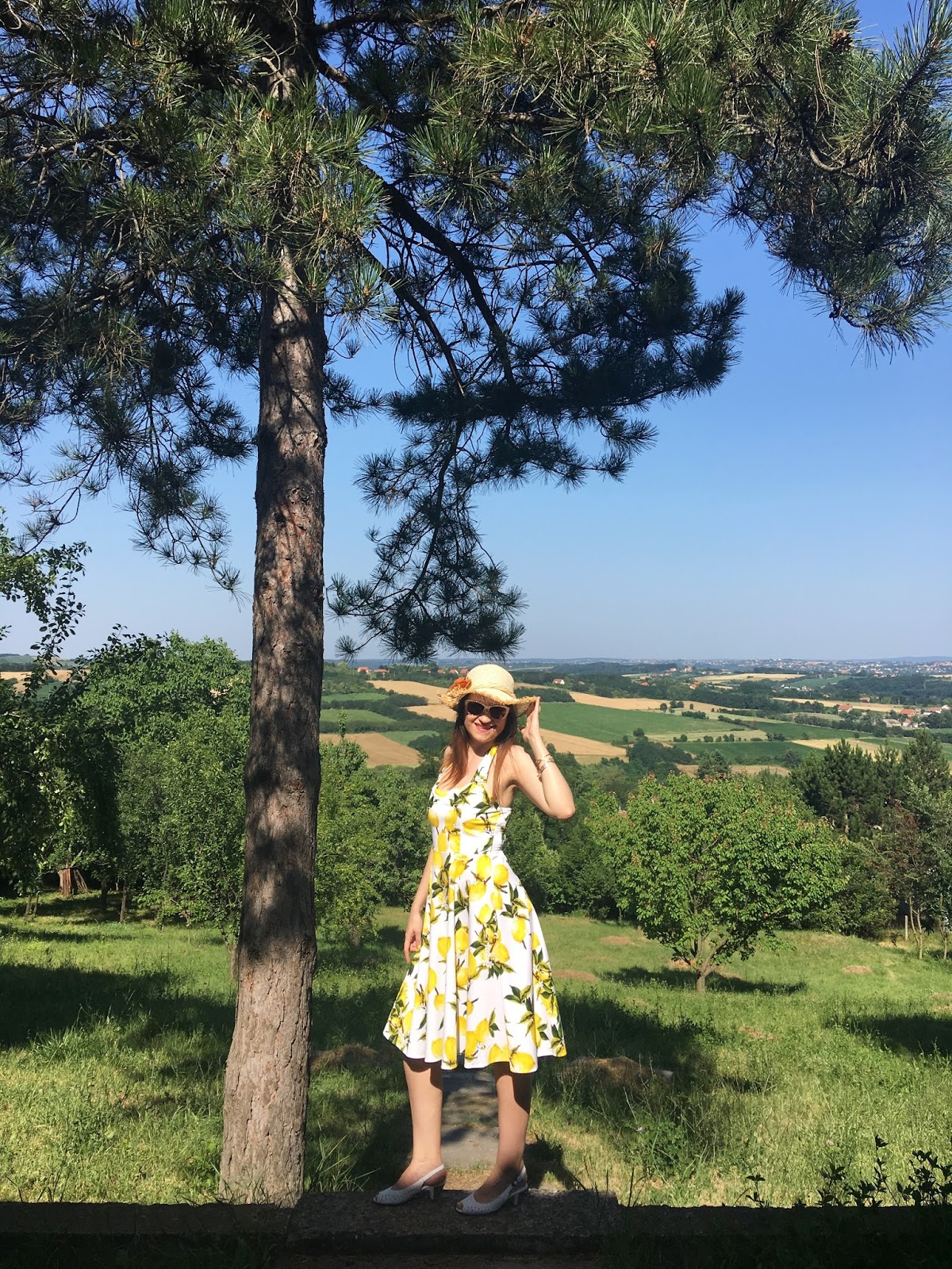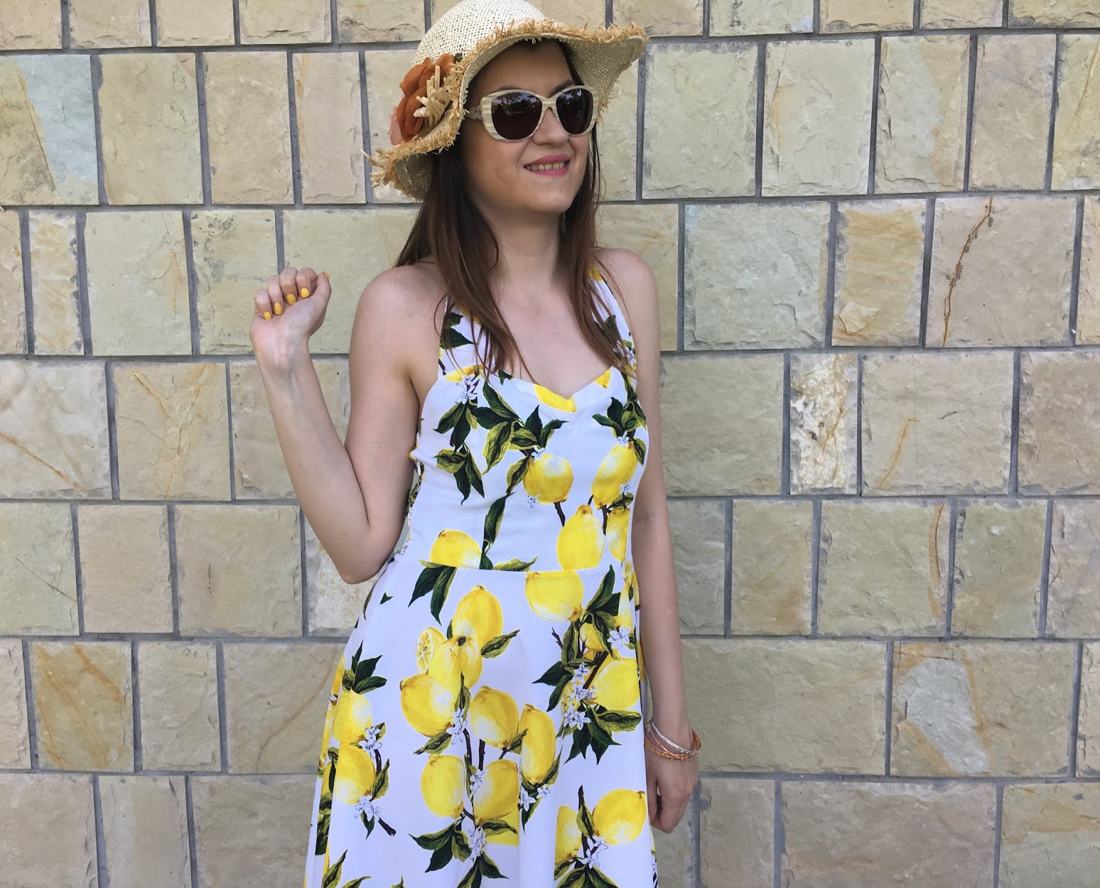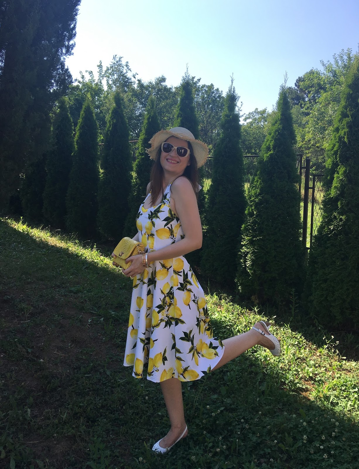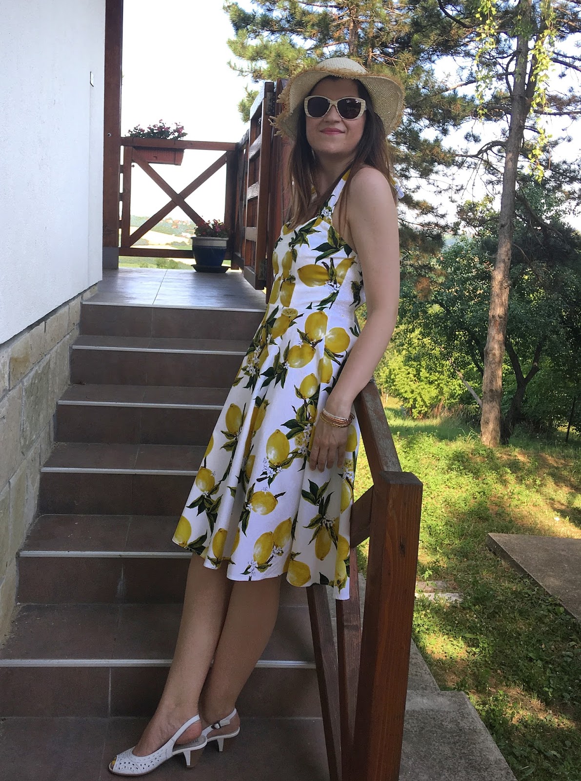 Odlučila sam se za divnu damsku haljinu sa limun printom, vintidž kroja, koja se vezuje oko vrata. Ukoliko vam se dopada, možete je pronaći ovde. Pamučna je i veoma udobna, tako da od mene imate toplu preporuku što se nje tiče. Ostatak kombinacije je sveden, kako bi trendi limun print najbolje došao do izražaja. Tu su retro rupičaste bele sandale sa malom potpeticom, bež naočare, slojevite narukvice i slamnati šešir.