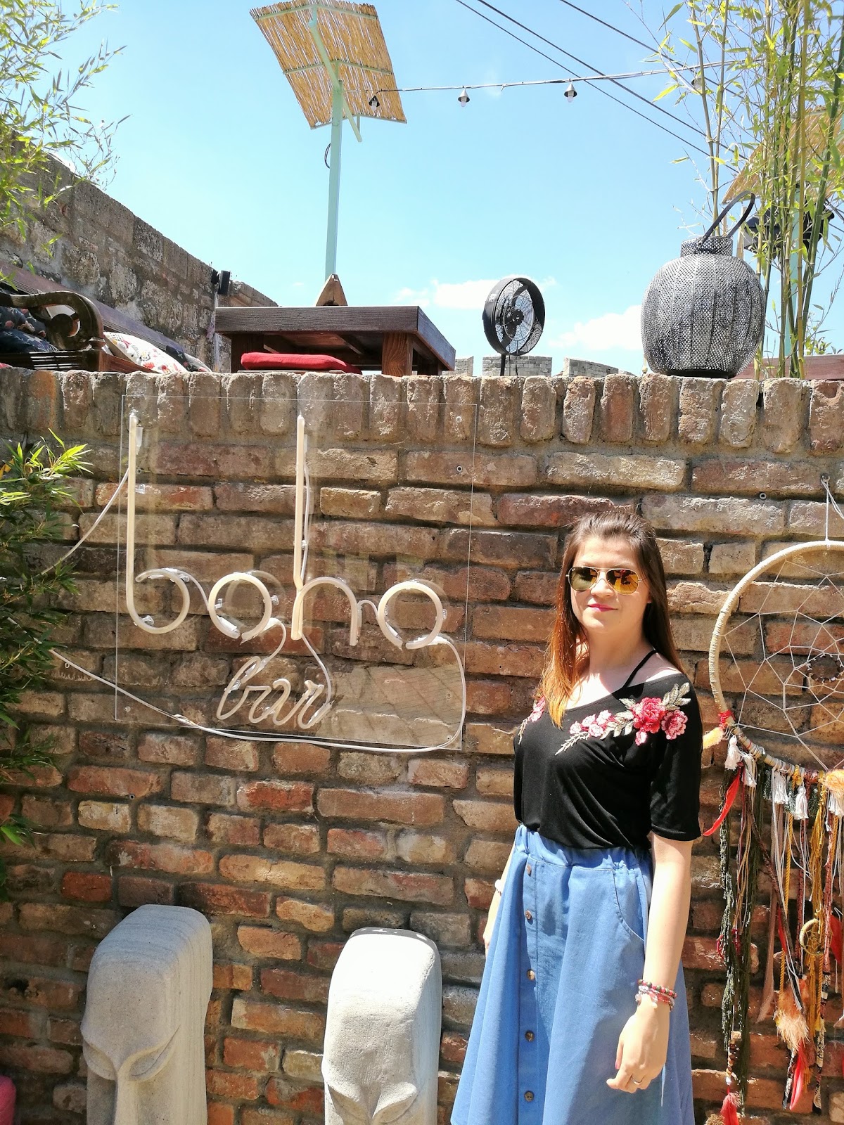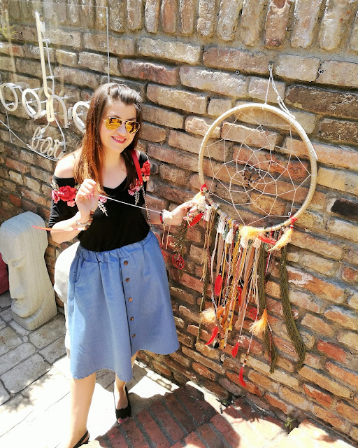 U skladu sa ambijentom i moja odevna kombinacija odiše boho vibracijama. Odlučila sam se za midi denim široku suknju sa dugmićima po sredini (ovde) i pamučnu crnu majicu koja pada na ramena i ima trendi izvezene ruže (ovde).