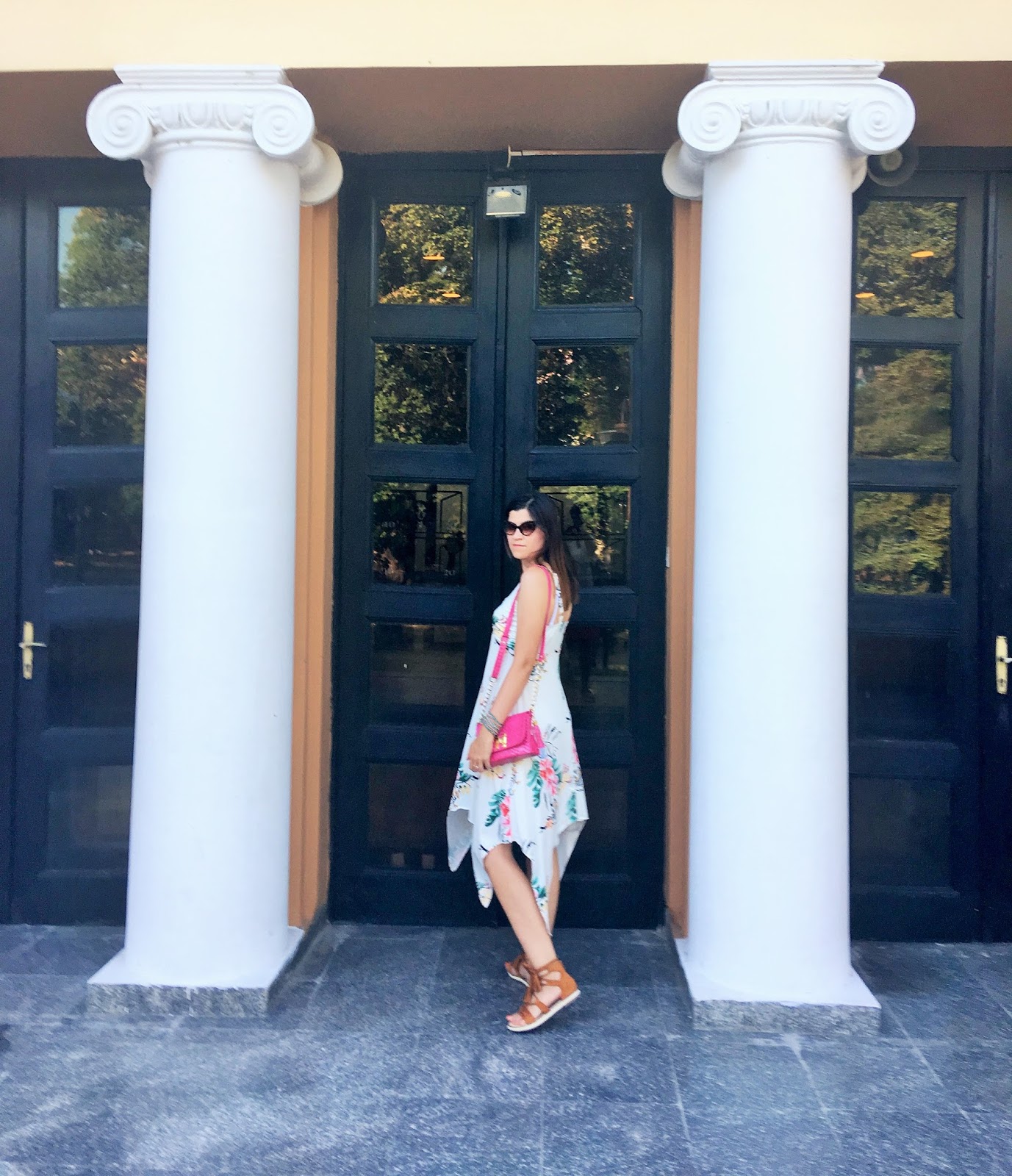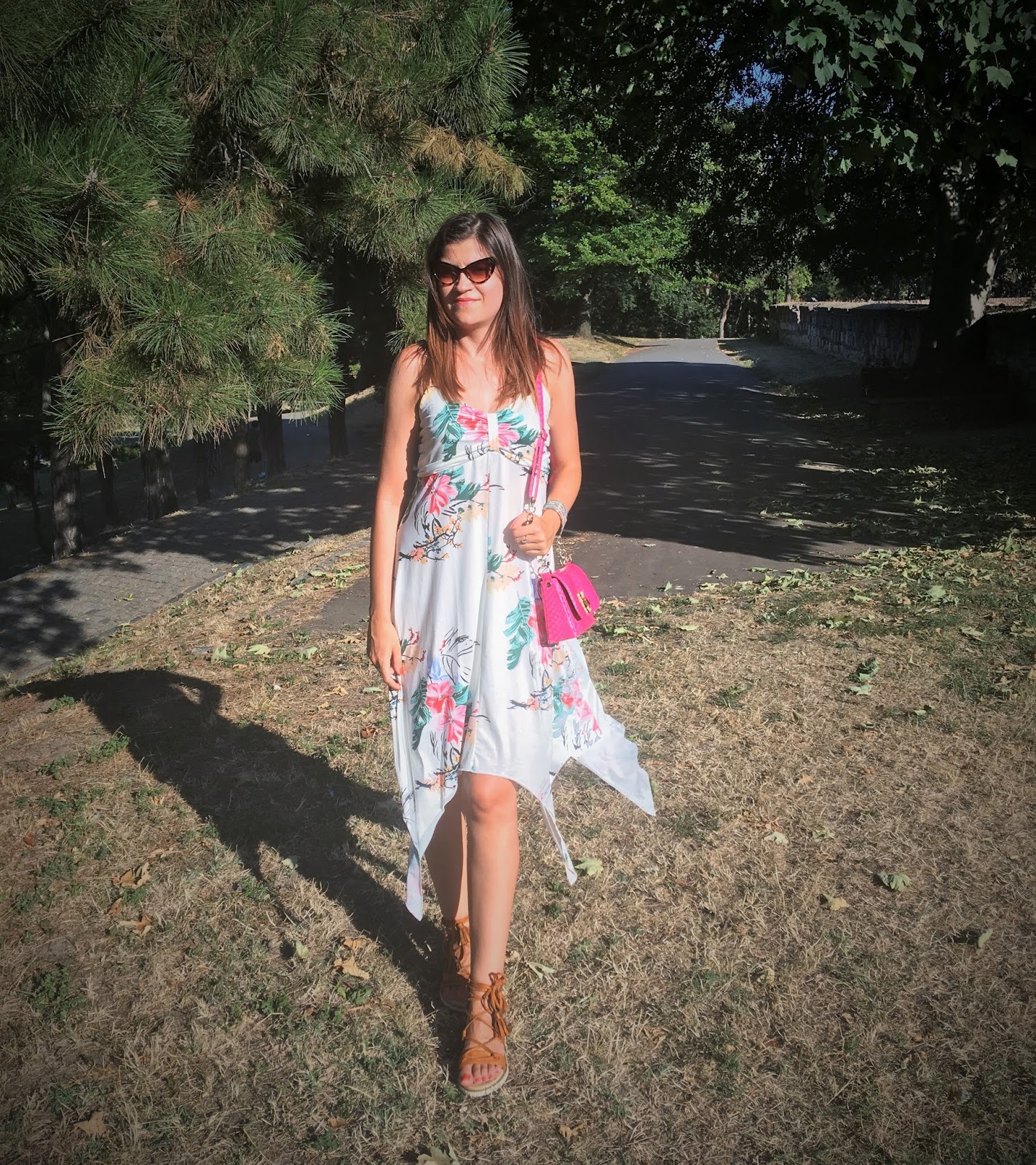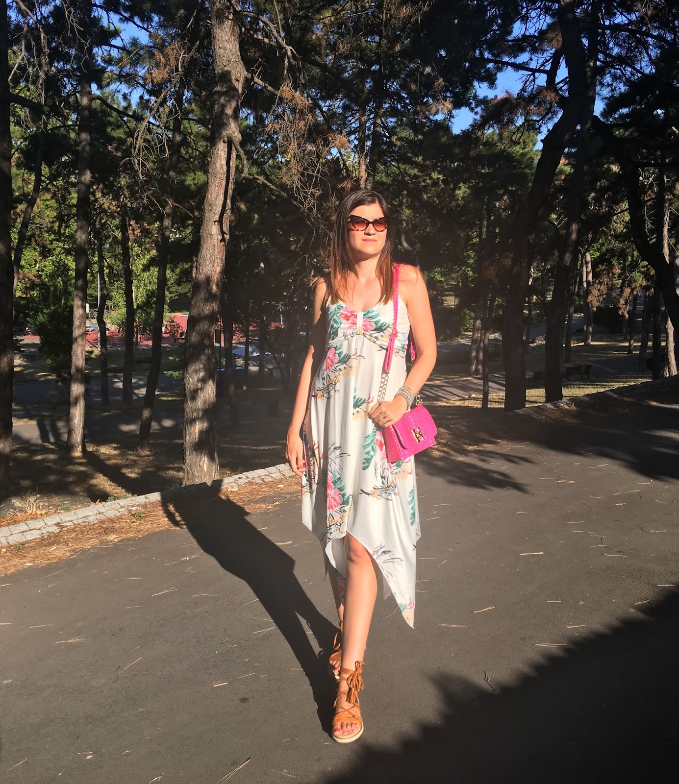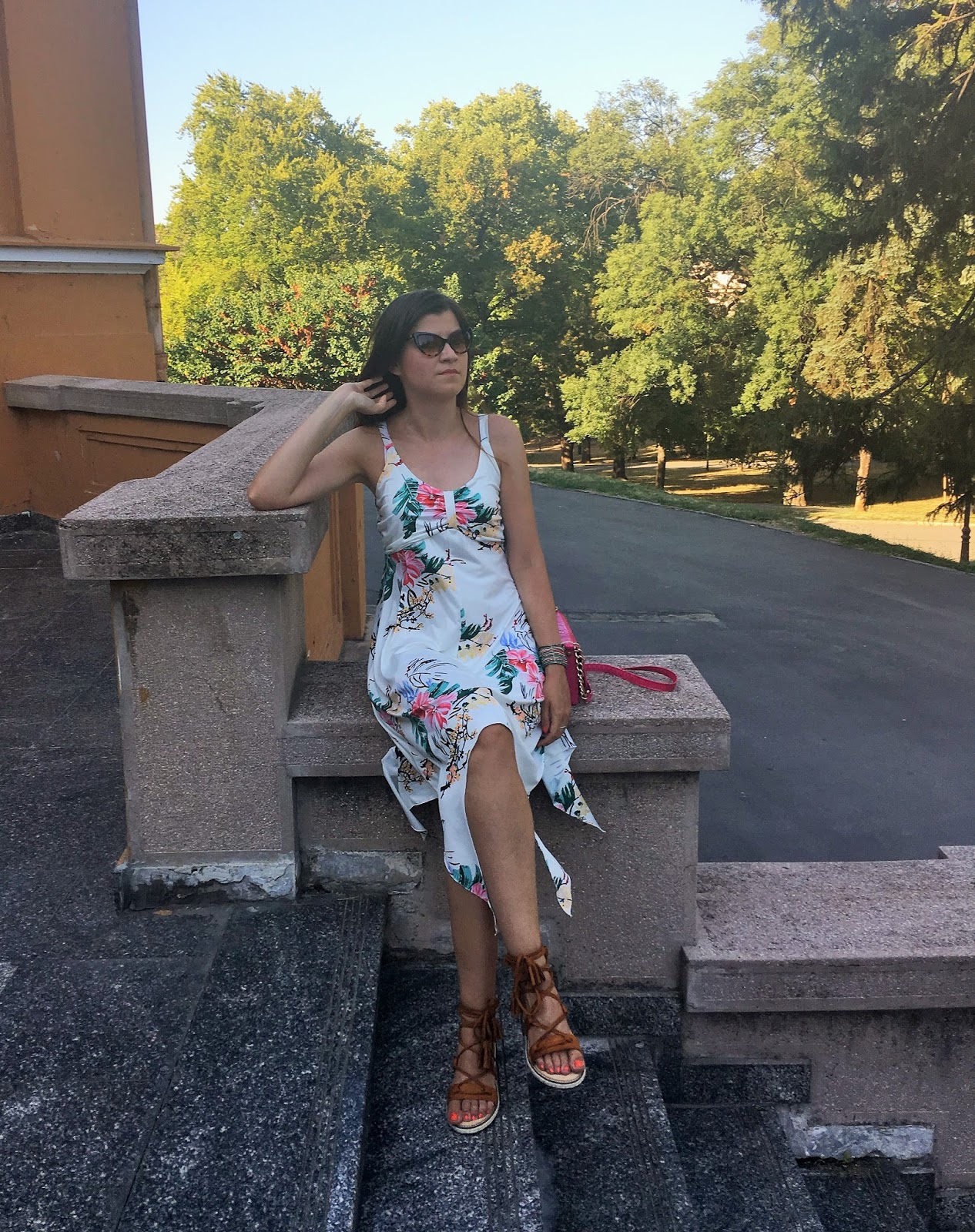 As my answer to the question: ”What to Wear for Hot Weather?” are photos below where I wore an ideal option on a hot sweltering day. I’m obsessed with this lovely asymmetrical dress with cute floral print. It’s so flawless item, perfect for long summer days. I paired it with super comfy and so stylish gladiator sandals in natural brown tone, attractive dark cat-eye sunglasses and mini pink bag.