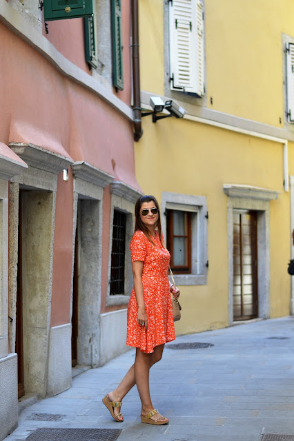 Što se tiše outfit-a, odlučila sam se za laganu lepršavu haljinicu u jarkoj narandžastoj nijansi i sa dezenom sitnih cvetića. Skroz letnje izdanje uz trendi papuče sa ukrasnim kristalima i perlicama, bež mini torbu i atraktivne komade nakita.
