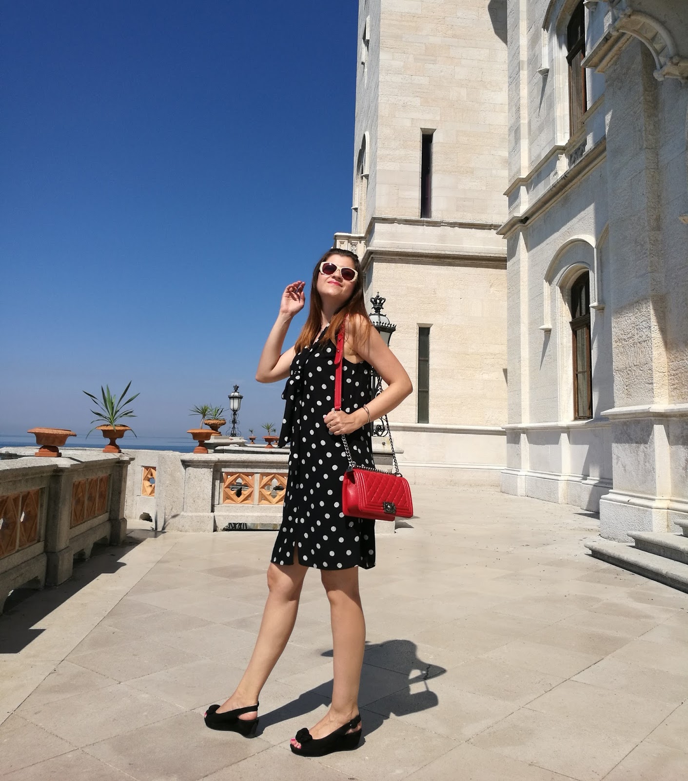 Polka Dot timeless print on the comfy viscose dress with cute bow detail and romantic atmosphere of the gorgeous Miramare Castle in Trieste are the main stars of this fashion-travel post.