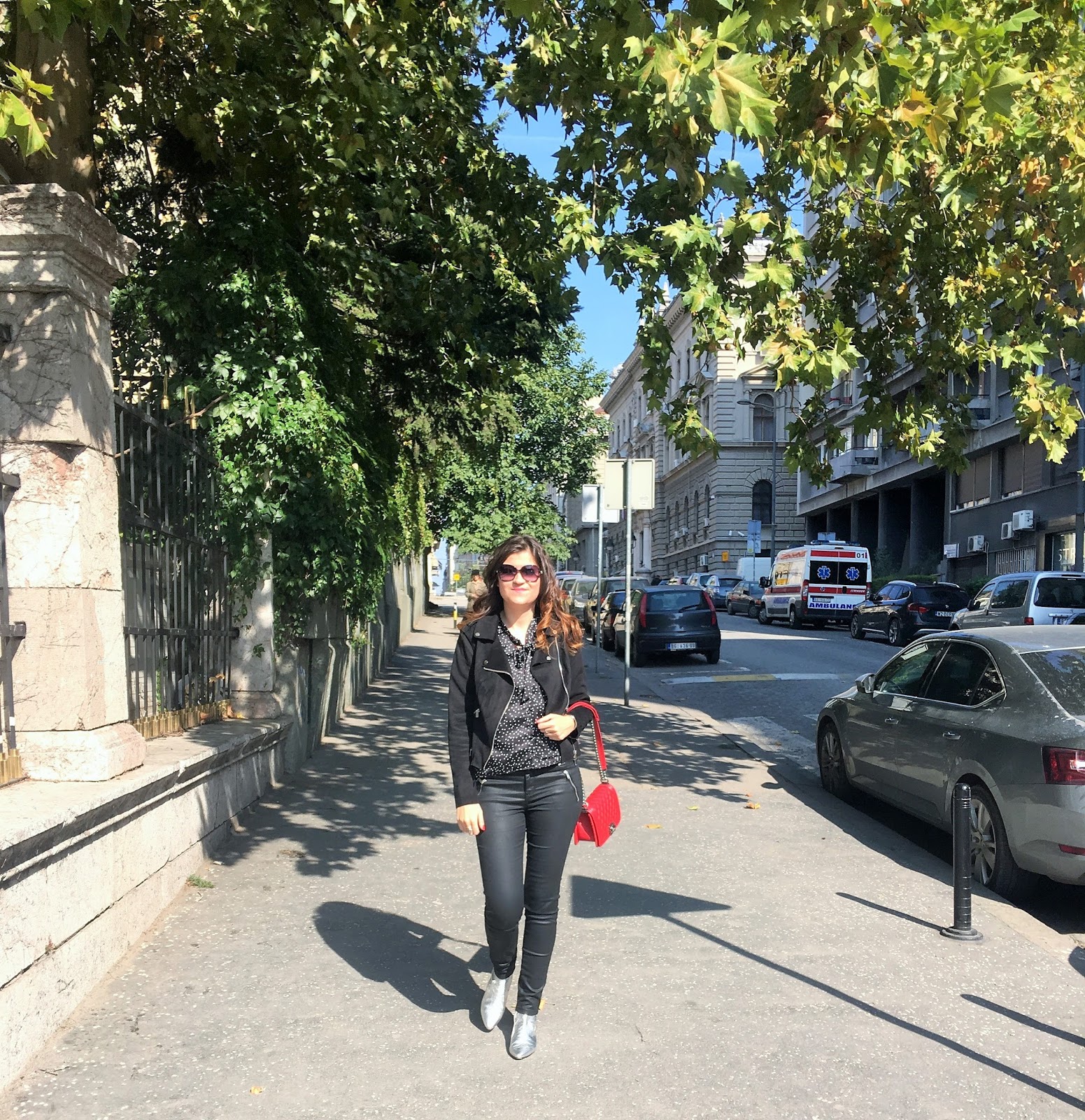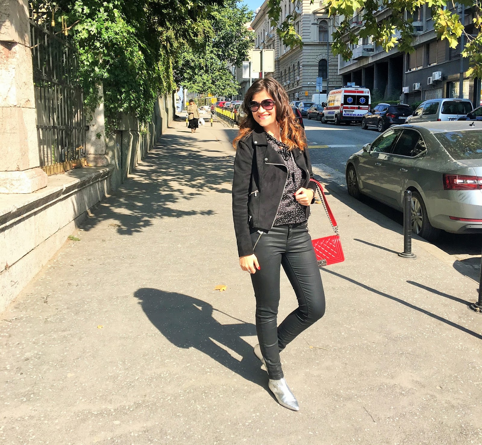 Velur bajkerska jaknica, uske pantalone od rastegljivog materijala nalik koži i upečatljive trendi gležnjače u srebrnoj boji, našli su se u spoju sa ženstvenom crnom košuljom sa sitnim belim tufnicama i trakom koja se vezuje oko vrata, efektnom crvenom mini torbom, naočarima i ukovrdžanom kosom.
