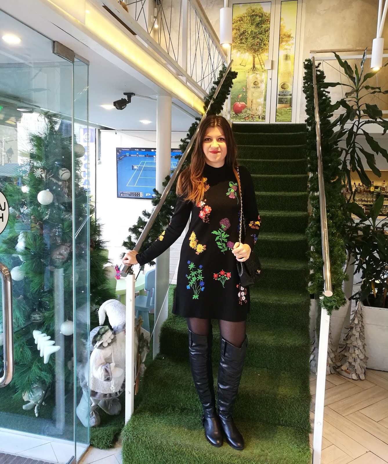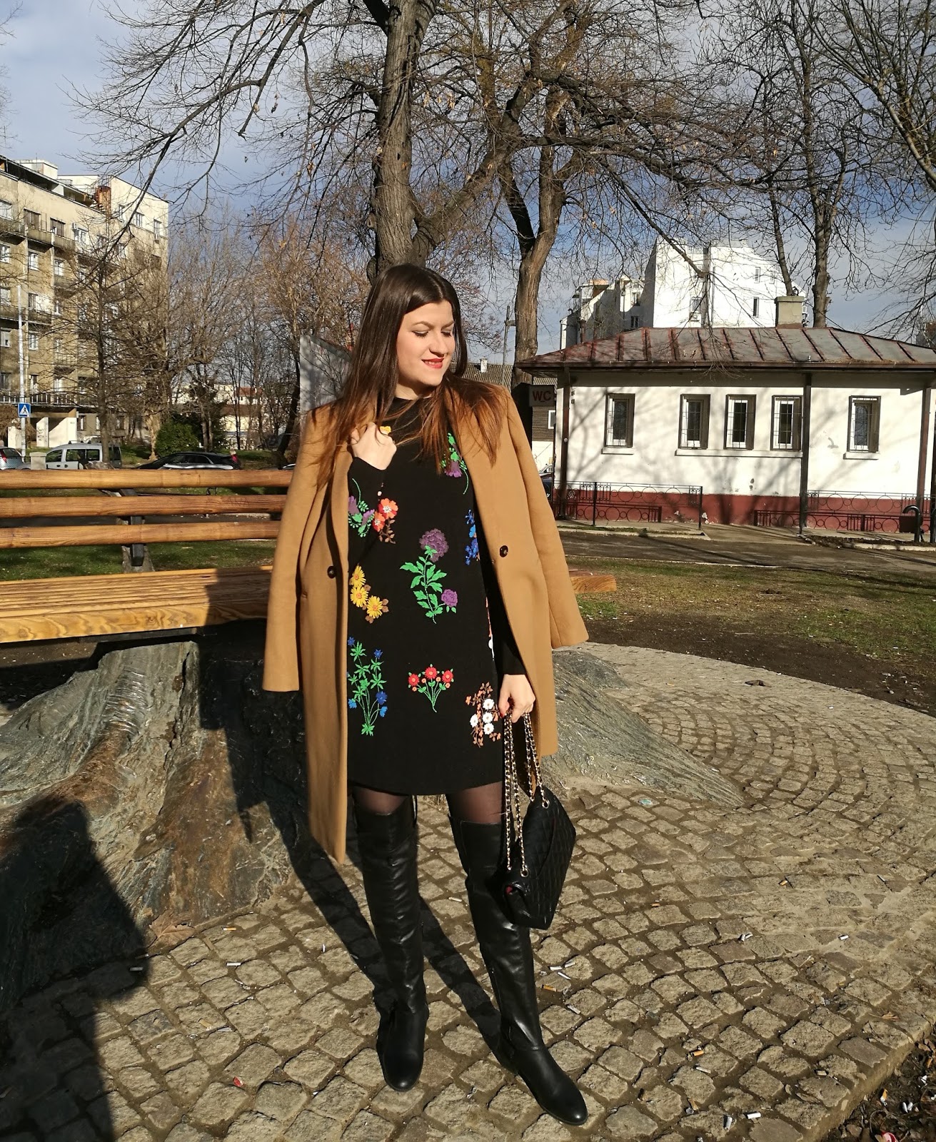 Kada sam je naručivala, u opisu sam pročitala da je reč o vezu, ali ipak su u pitanju nalepljeni cvetići. Međutim, zaista lepo izgledaju i baš verno imitiraju vez. Uparila sam je sa klasičnim kamel kaputom, crnim kožnim čizmama preko kolena i torbicom od štepane kože.
