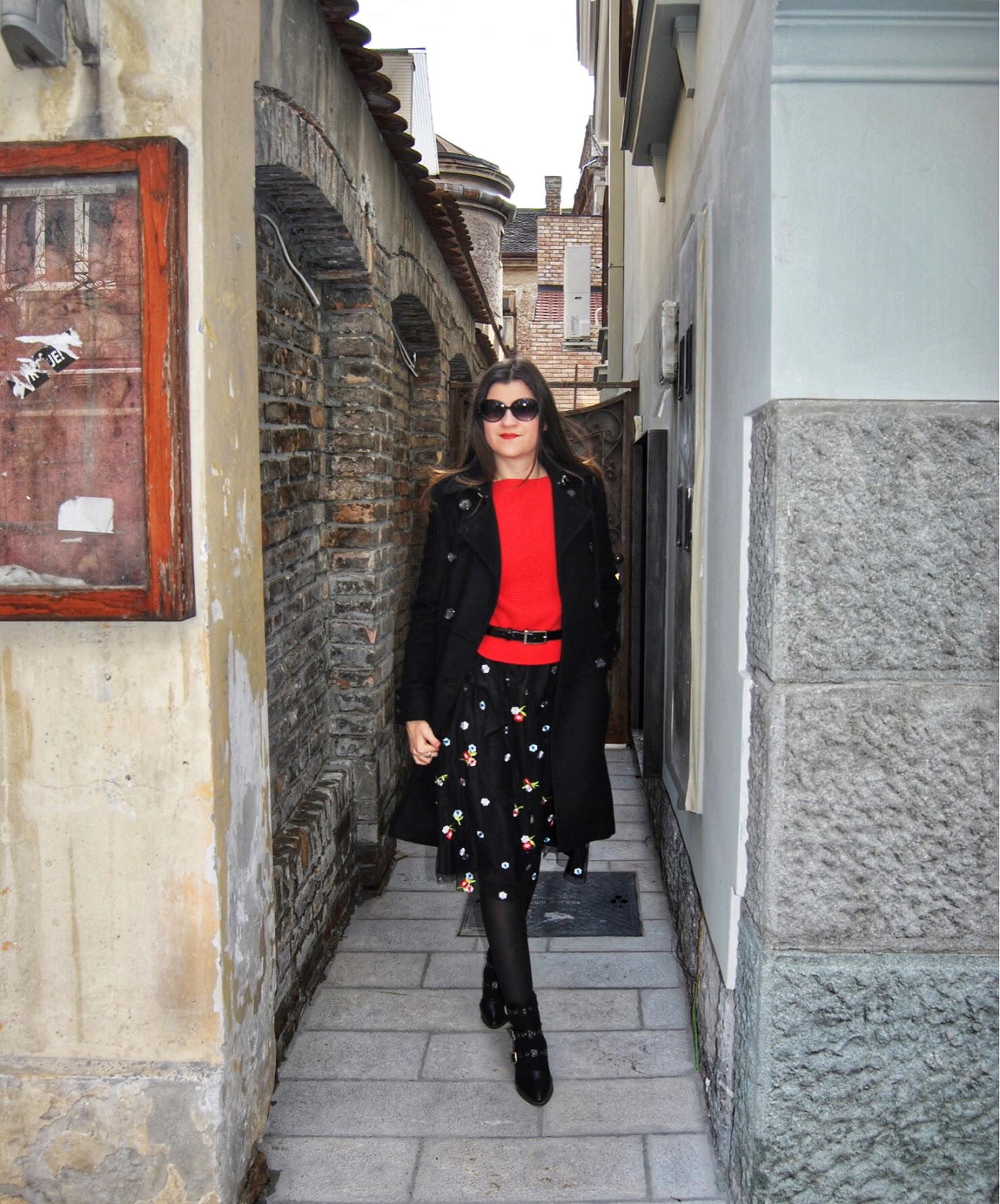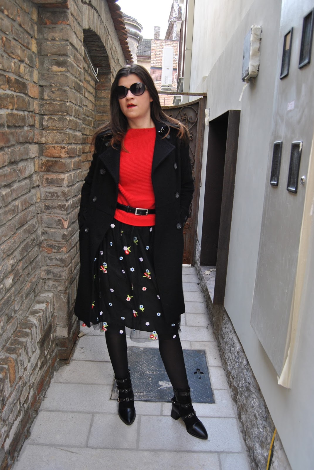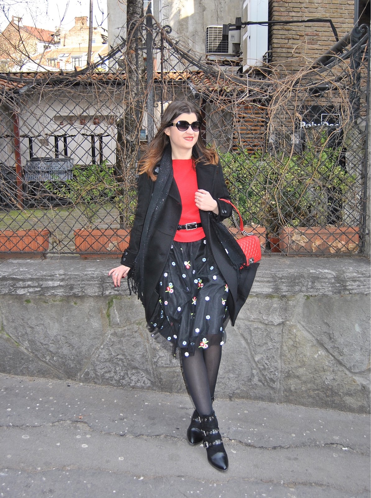 Ovog puta sam htela da izbegnem romantičan izgled koji se obično vezuje za ovakav tip sukanja, tako da sam se umesto klasičnih salonki odlučila za crne gležnjače sa potpeticom i rock’n’roll nitnama. Uz crveni džemper, dugi vuneni kaput i šik detalje postigla sam jednu skroz street style kombinaciju u skladu sa dorćolskim ulicama na kojima su nastale fotografije pred vama.