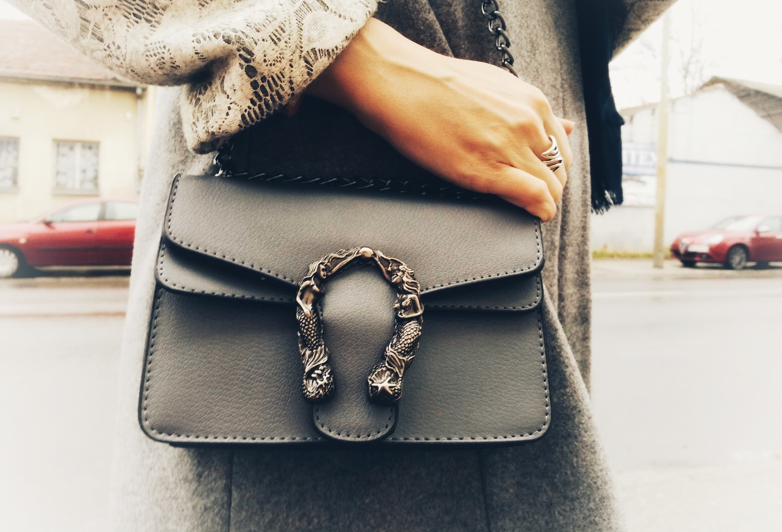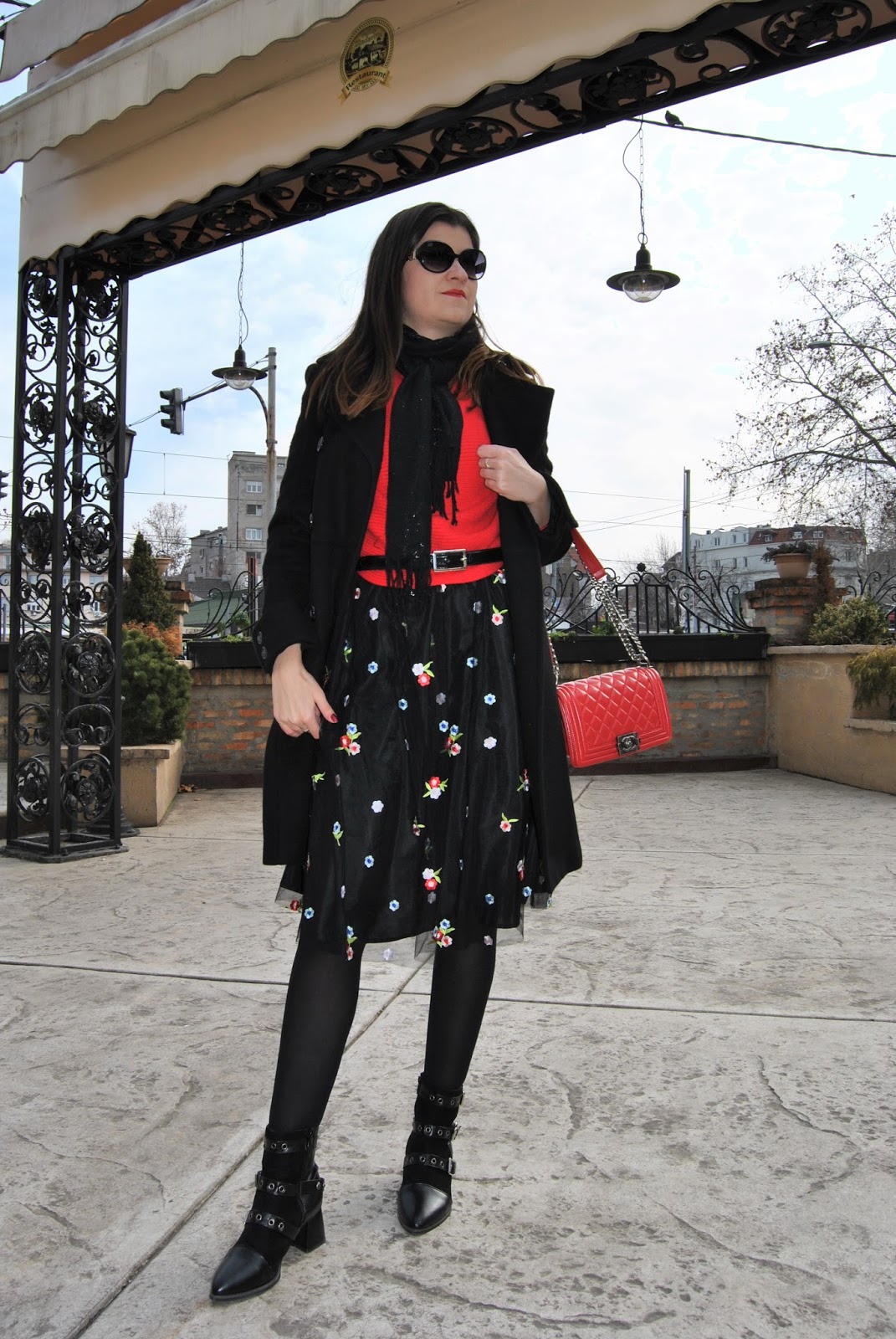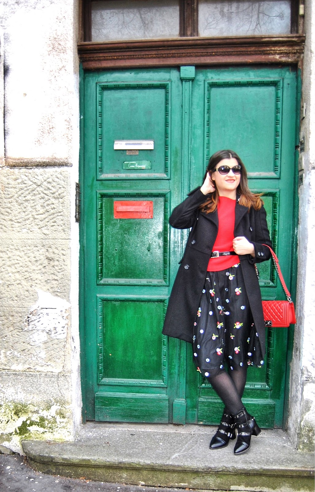 Ovog puta sam htela da izbegnem romantičan izgled koji se obično vezuje za ovakav tip sukanja, tako da sam se umesto klasičnih salonki odlučila za crne gležnjače sa potpeticom i rock’n’roll nitnama. Uz crveni džemper, dugi vuneni kaput i šik detalje postigla sam jednu skroz street style kombinaciju u skladu sa dorćolskim ulicama na kojima su nastale fotografije pred vama.