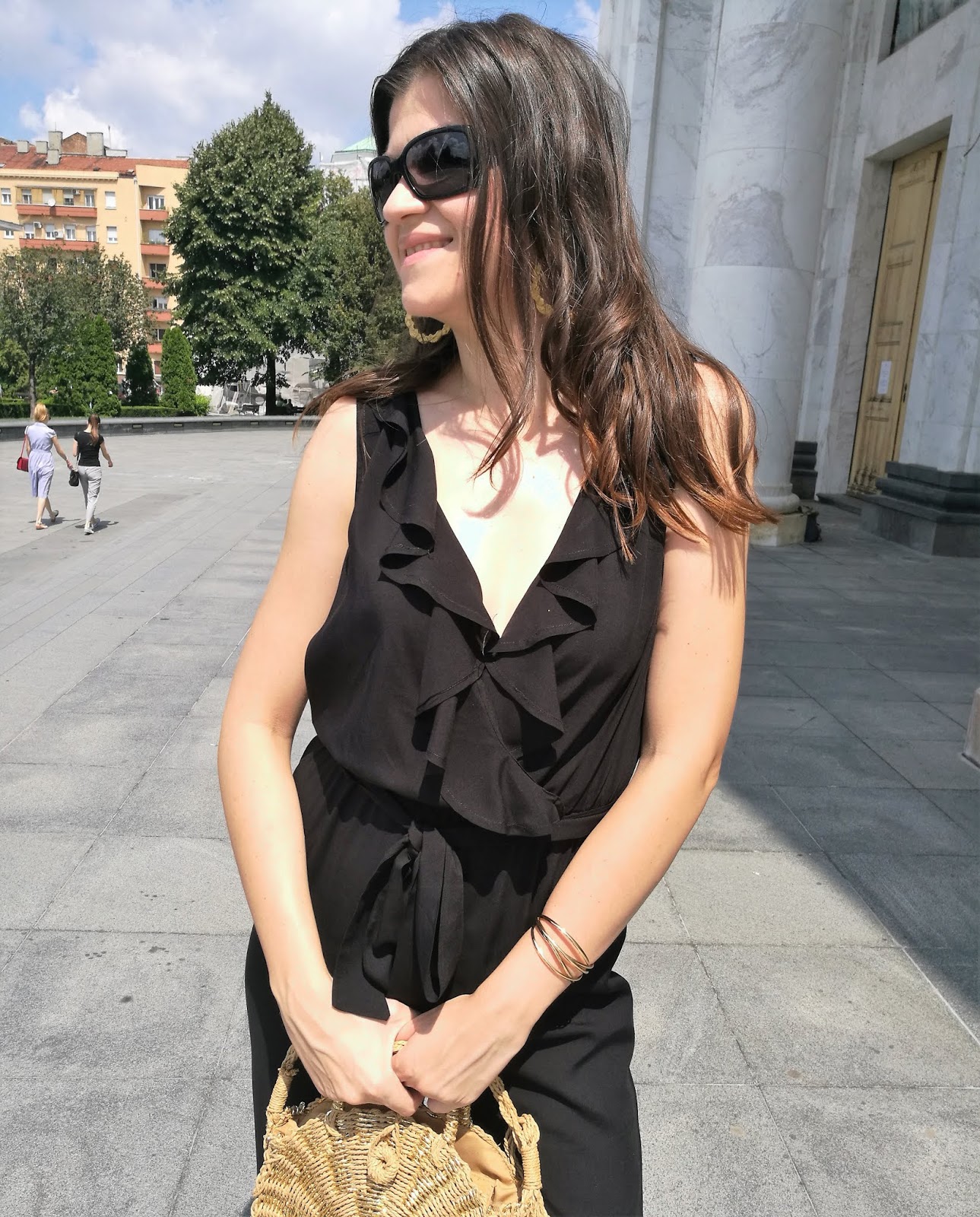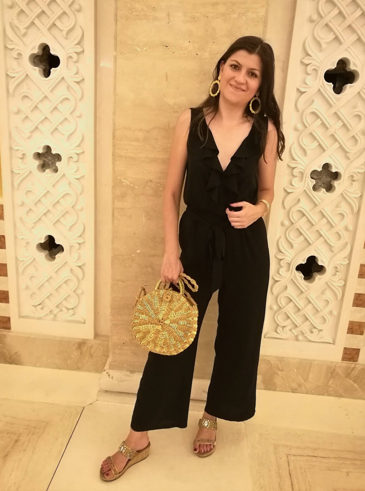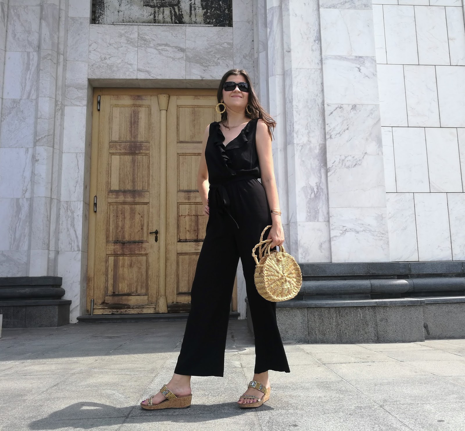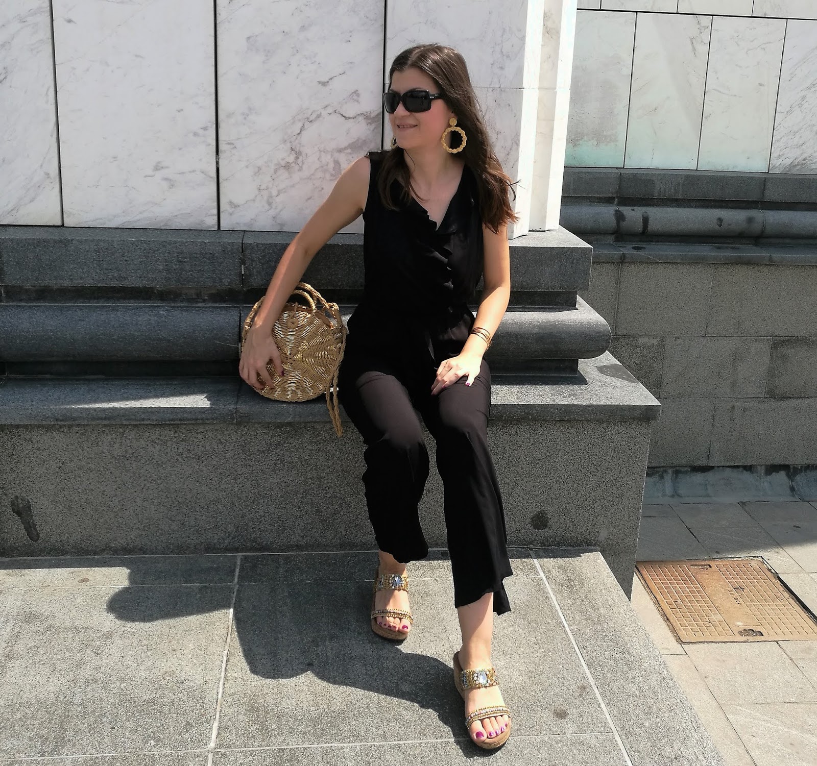 First of all, take a look on photos where I was wearing super chic viscose black jumpsuit with ruffled detail on the upper side. I paired it with popular straw round bag, golden mules and adorable golden statement earrings. Simple and beautiful!