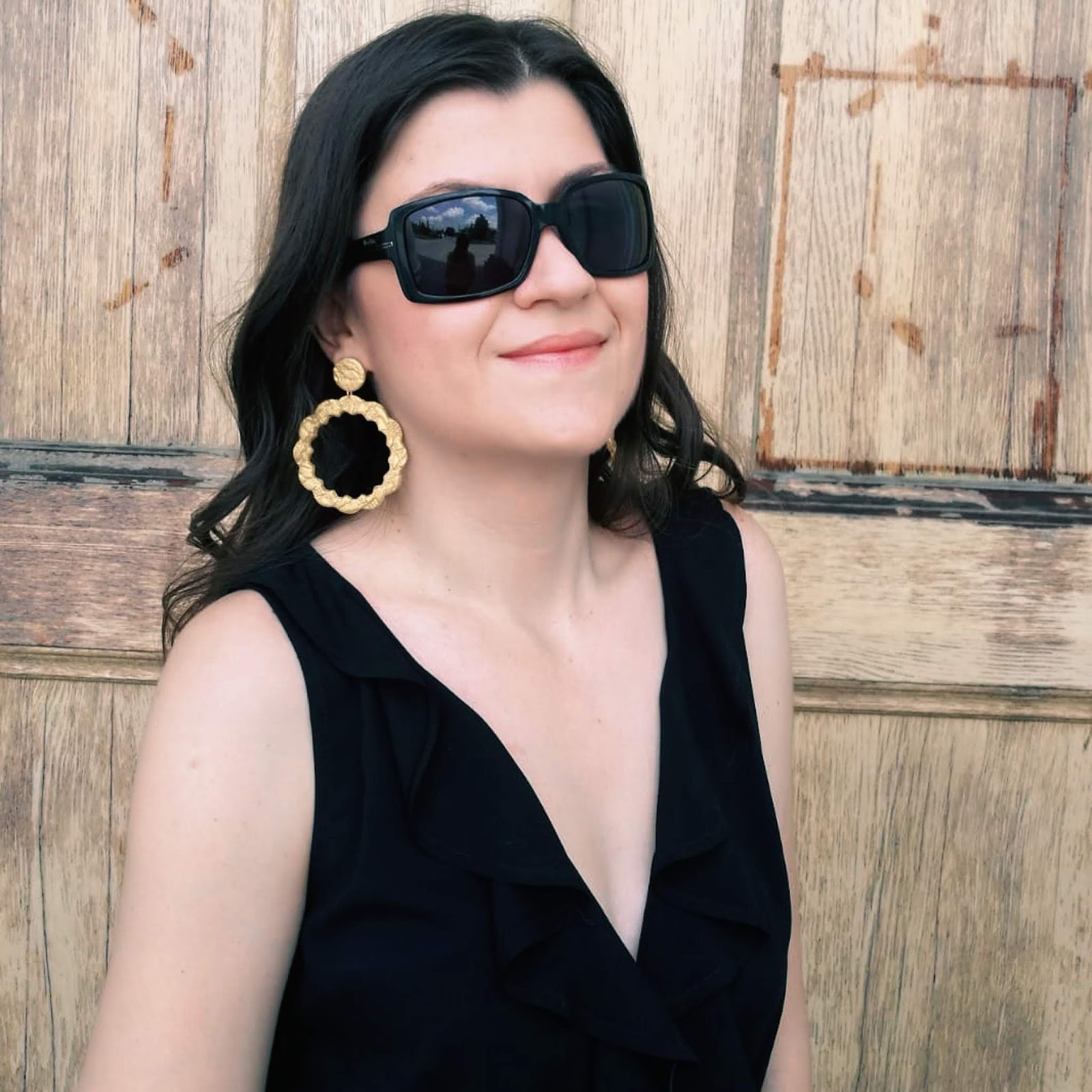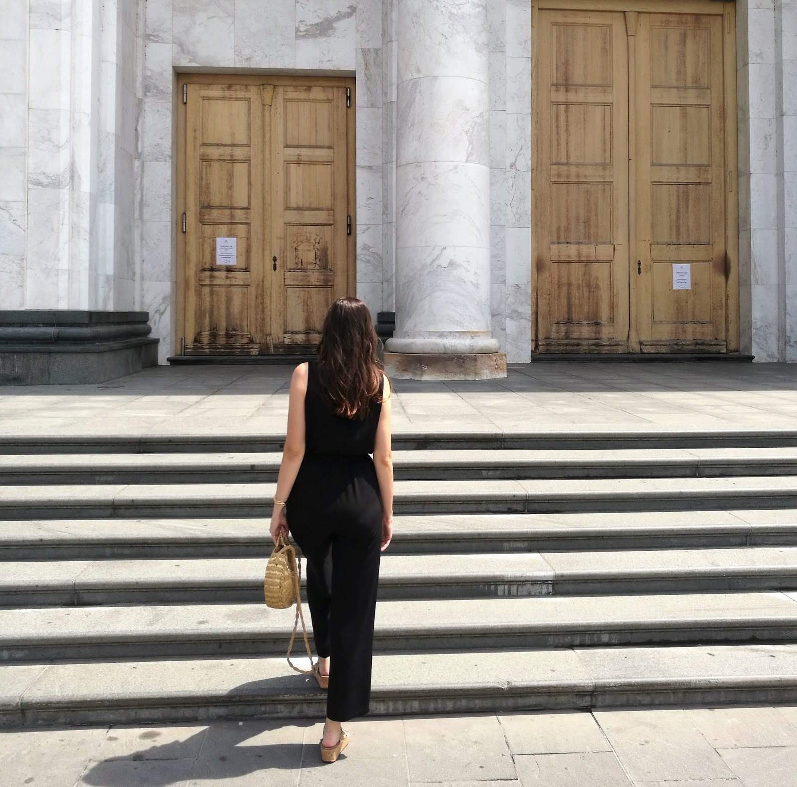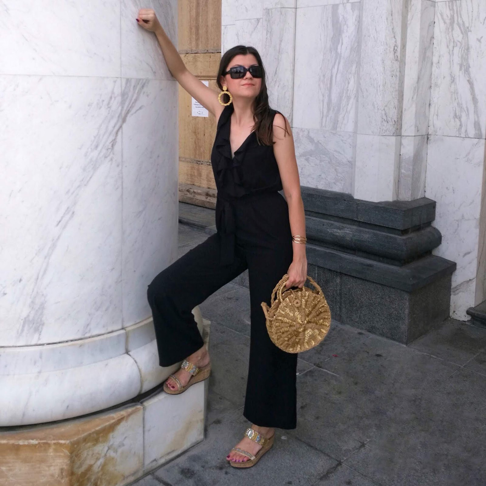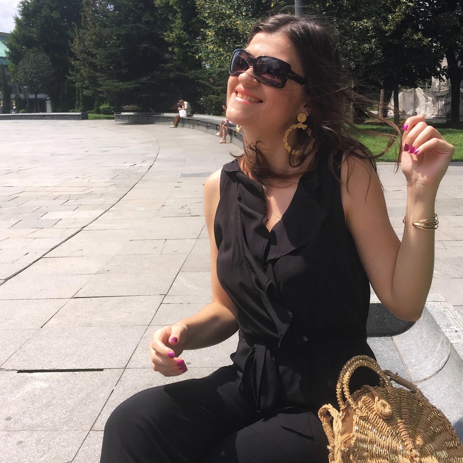 First of all, take a look on photos where I was wearing super chic viscose black jumpsuit with ruffled detail on the upper side. I paired it with popular straw round bag, golden mules and adorable golden statement earrings. Simple and beautiful!