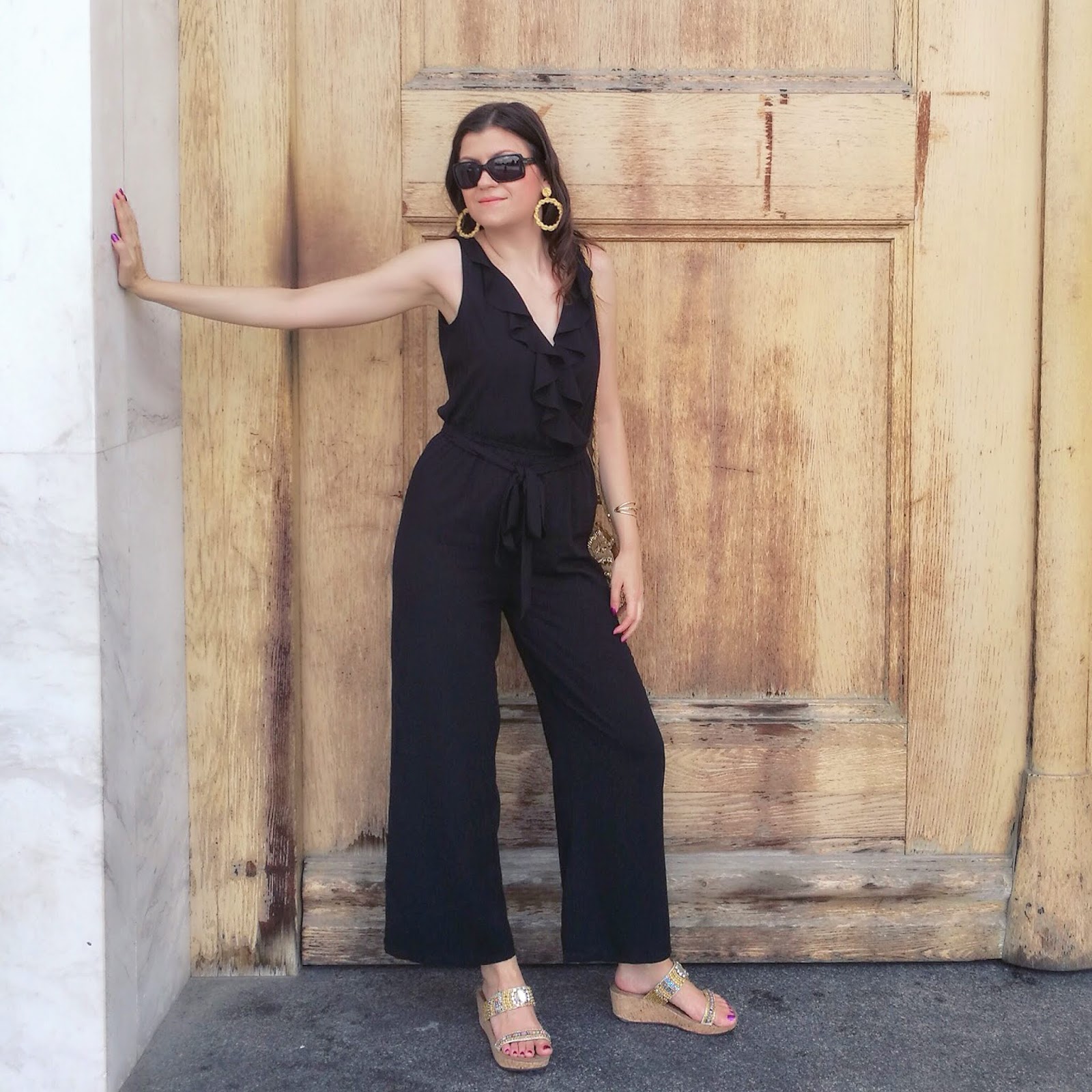 Jumpsuit: here // Bag: Rosegal // Mules: Cinti // Sunglasses: Max Mara // Earrings: Studio 16 The Label