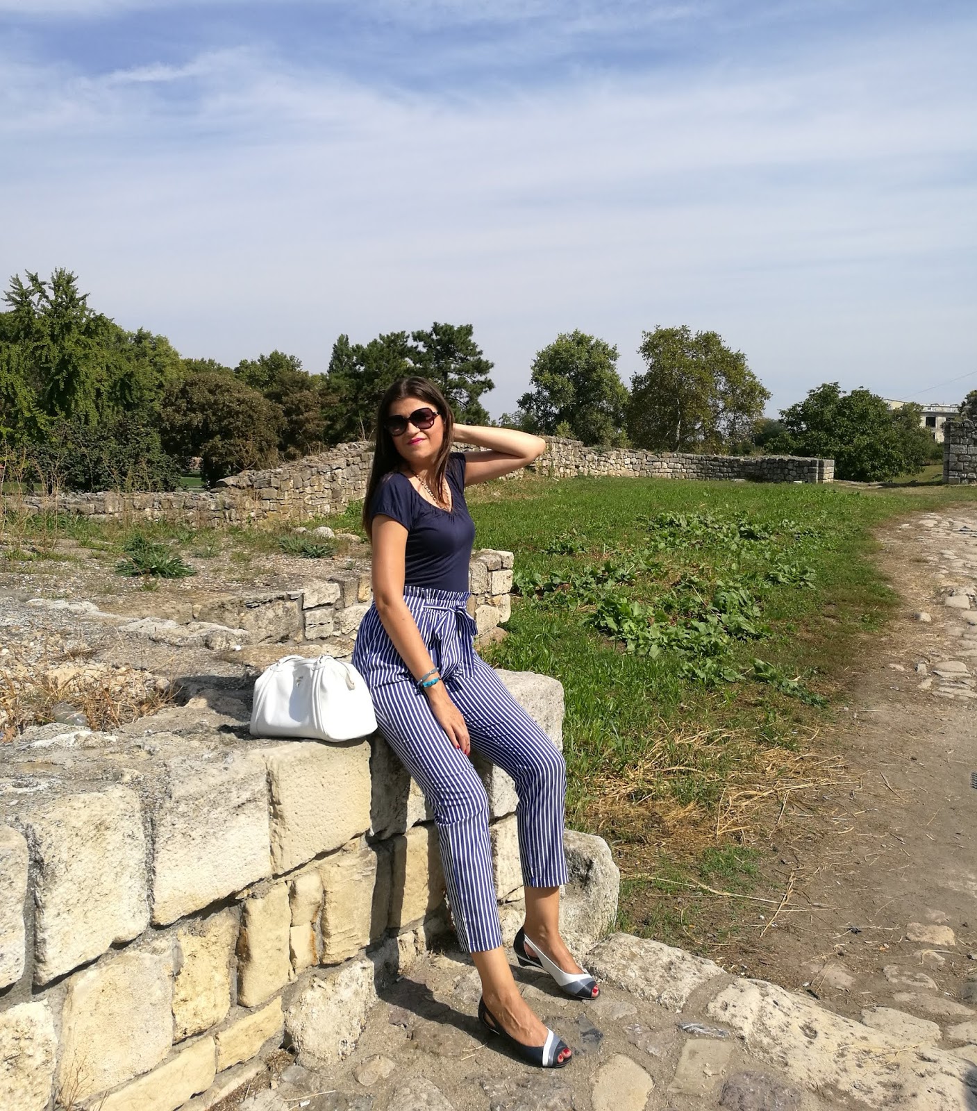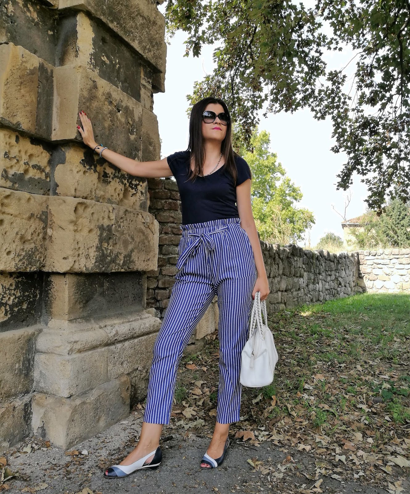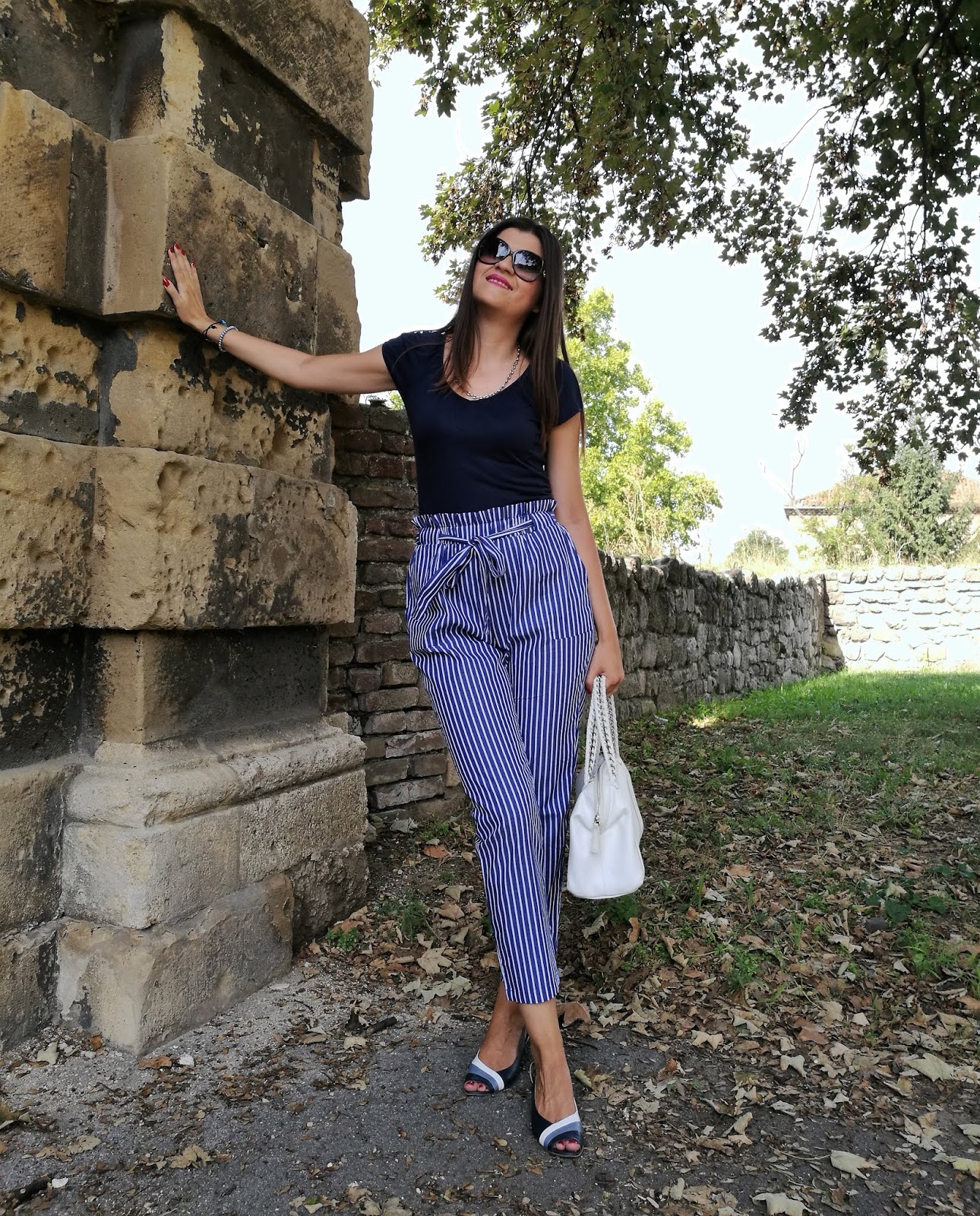 My today’s outfit is exactly in navy blue tones. I opted for trendy high-waist and paired it with plain t-shirt, feminine sandals in three colors and white leather bag.
