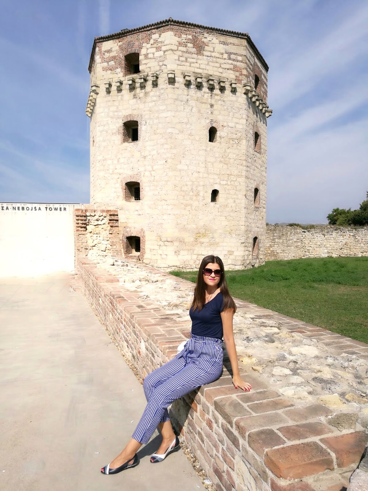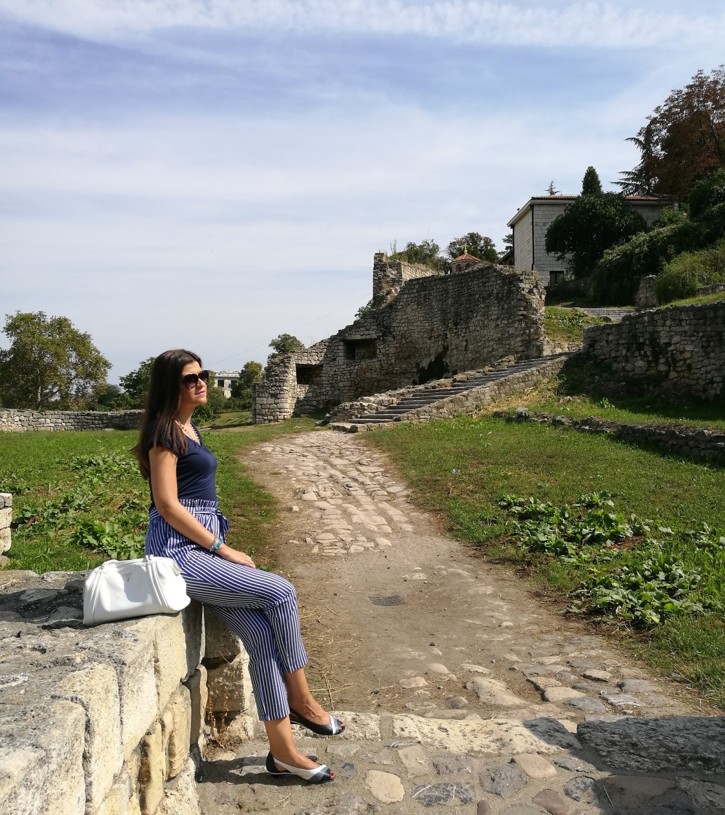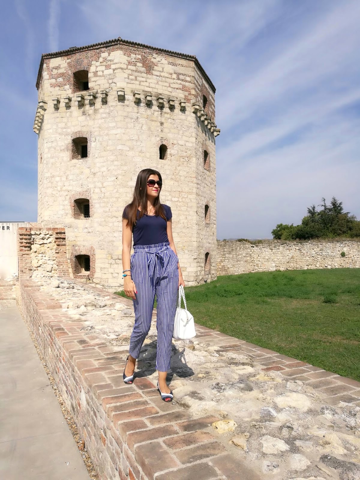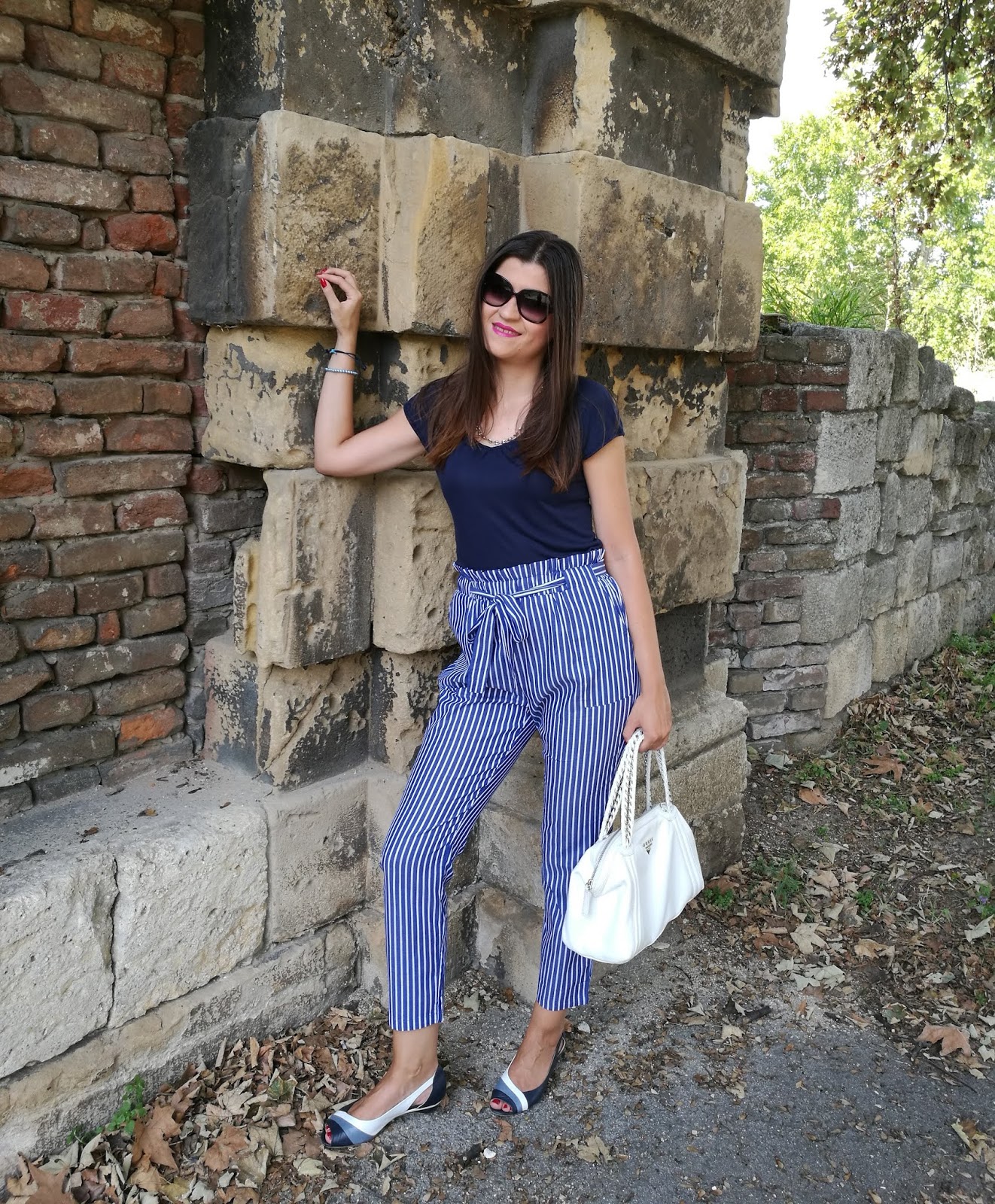 My today’s outfit is exactly in navy blue tones. I opted for trendy high-waist and paired it with plain t-shirt, feminine sandals in three colors and white leather bag.