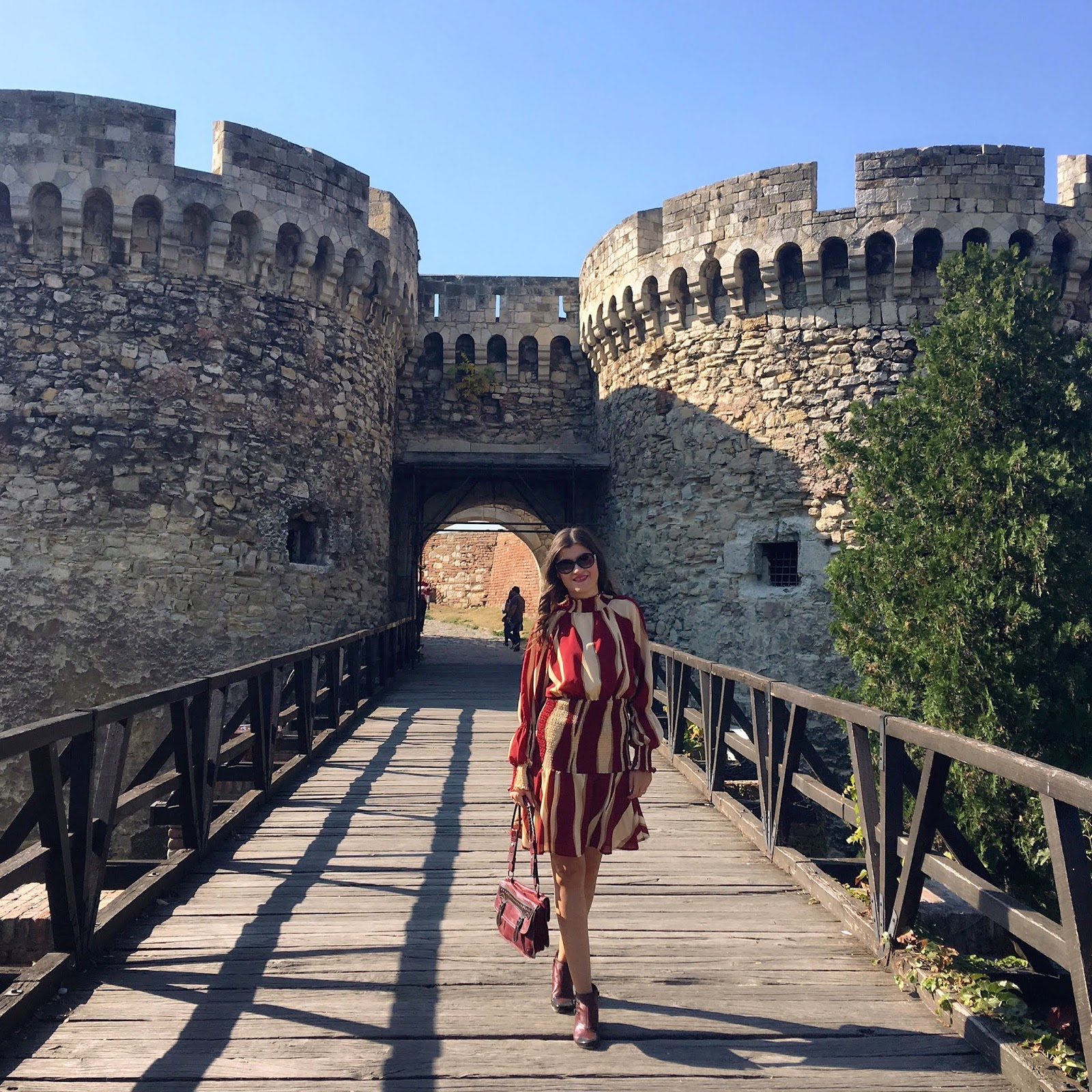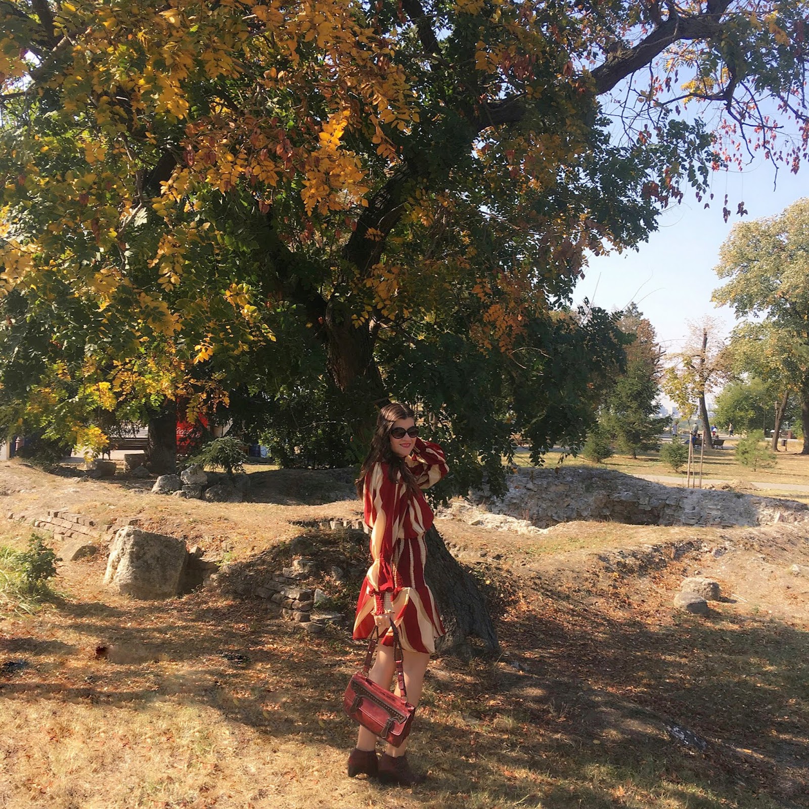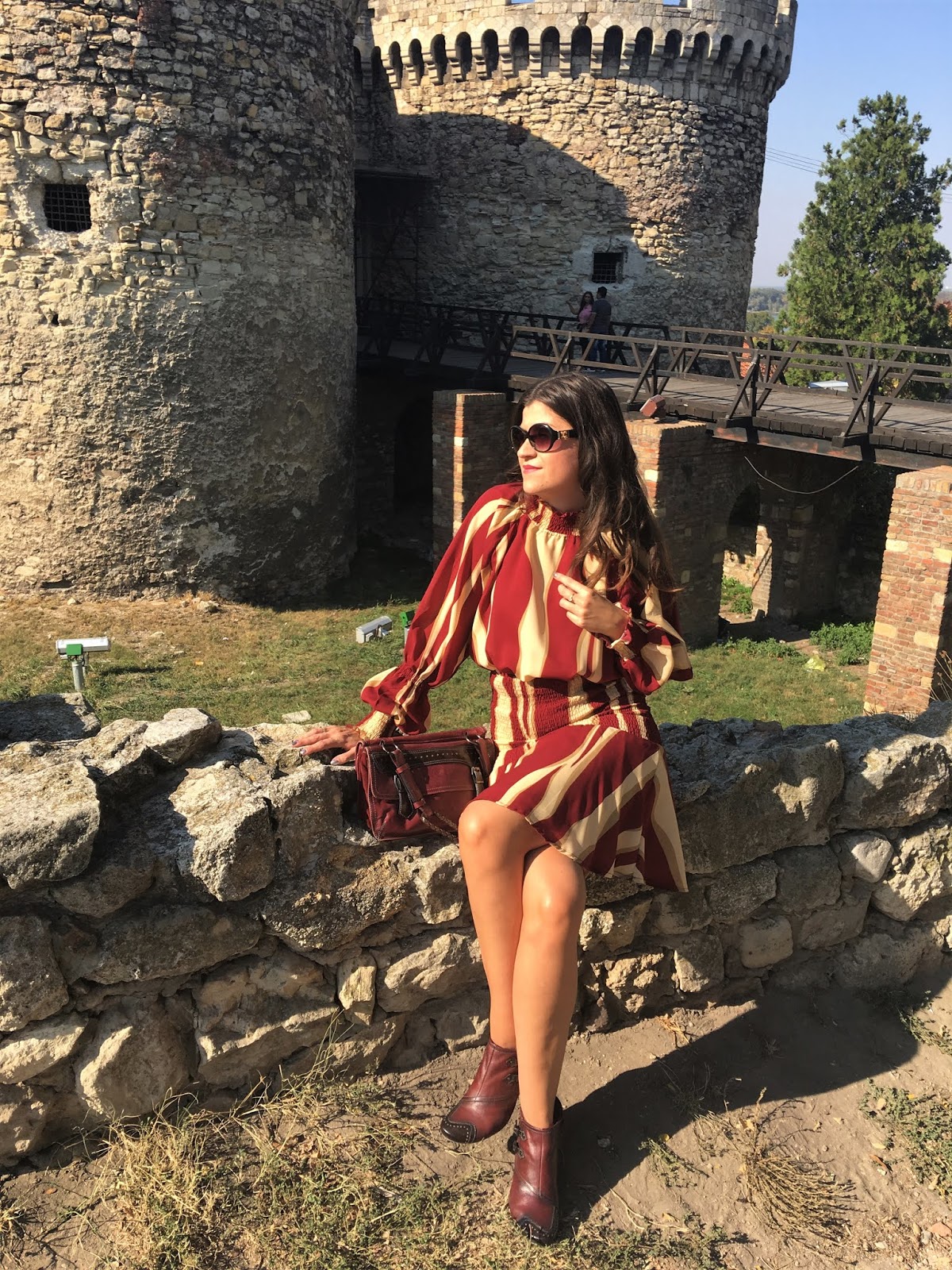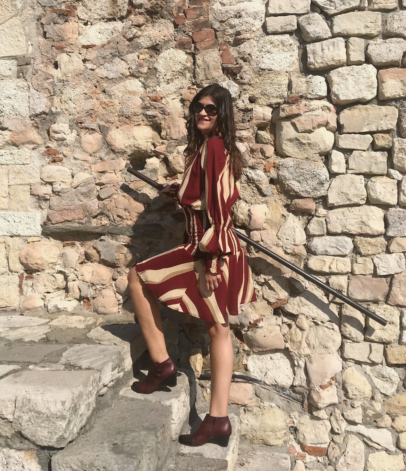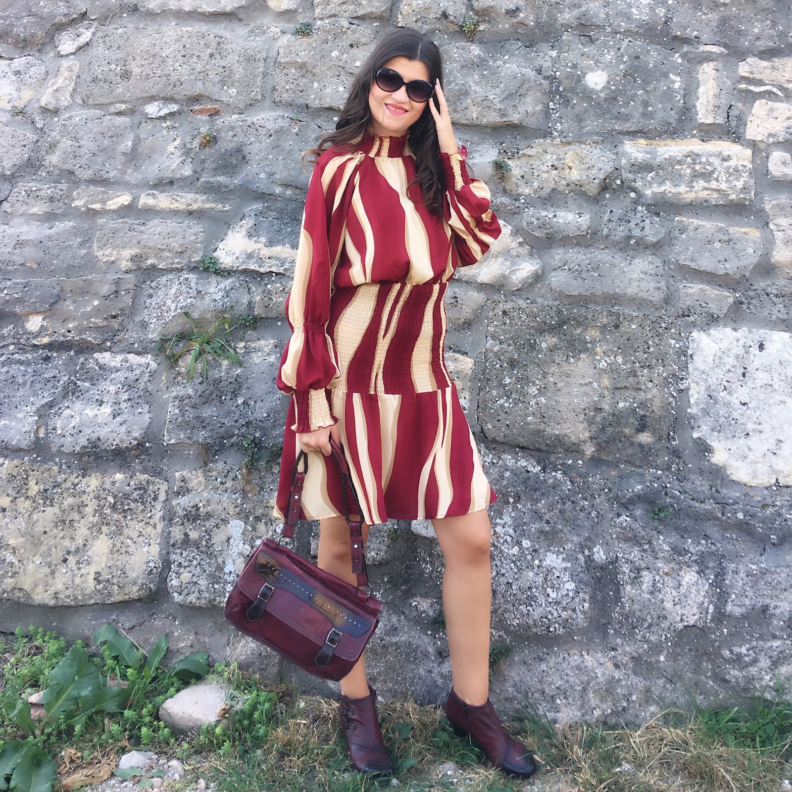 My today’s choice is based on this lovely striped burgundy-beige with interesting details: bishop sleeves and mock neck. I paired it with burgundy set of ankle boots and bag.