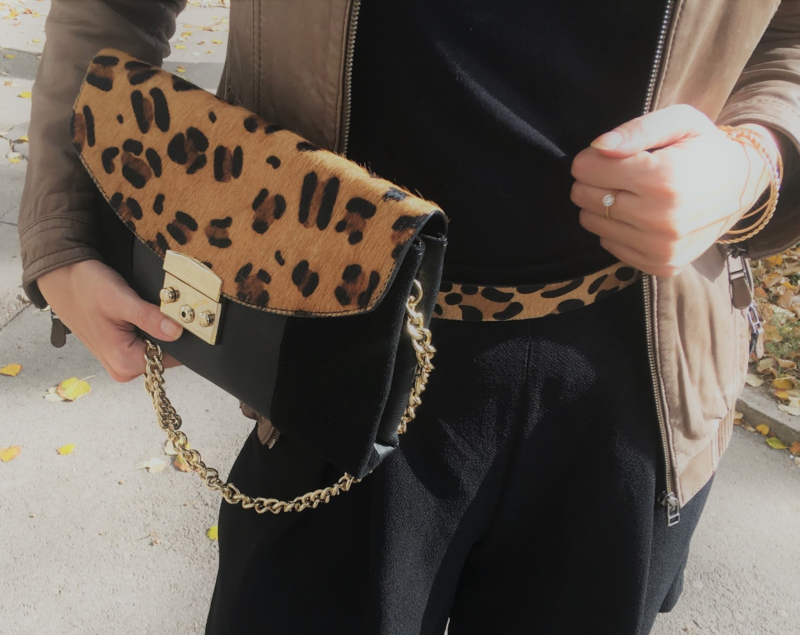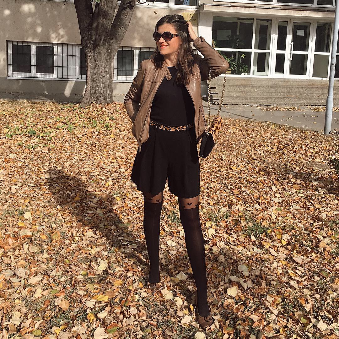 Autumn days in Belgrade look like Indian Summer, so it’s still pleasantly warm to wear stylish pieces like shorts and mini skirts. In this outfit post, I’m glad to show you one super chic street style combo with this cute wide-leg shorts which I paired with soft leather jacket, feminine shoes and attractive black tights that look like ”over-the-knee” boots. Shorts is a very versatile item which you can successfully wear with chunky sweaters, long blazers or biker jackets. Also, you can pick different style of shoes, like long or ankle boots, heels or sneakers too. My today’s combo is bold and sexy, throws the accent on the legs, but it’s also very feminine. I’ve decided to mix only two colors, but I entertained the total look with super trendy leopard details: leather shoulder bag and belt. Do you like this unique Autumn outfit? Tell me whether you wear the shortsin the Autumn and how to combine it?