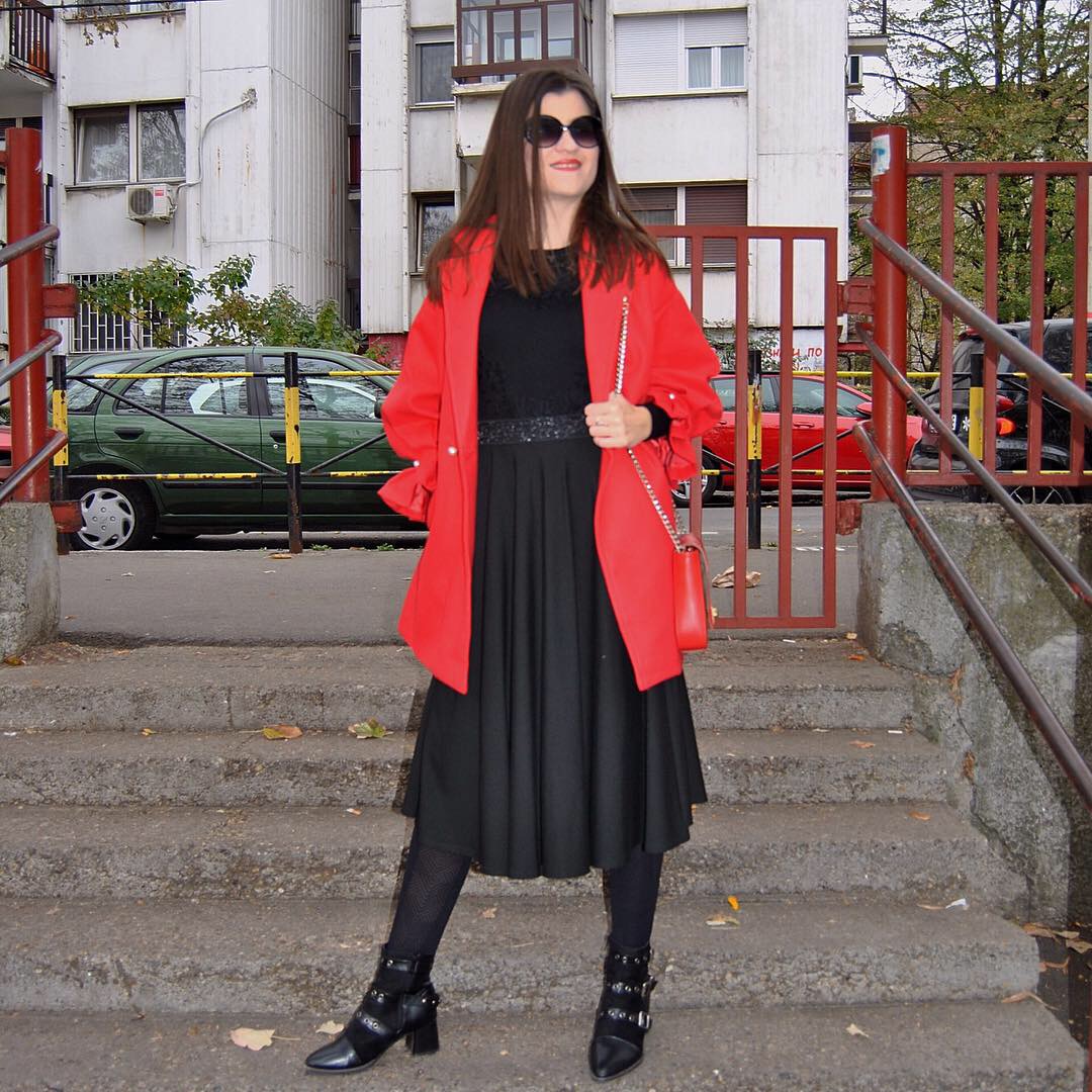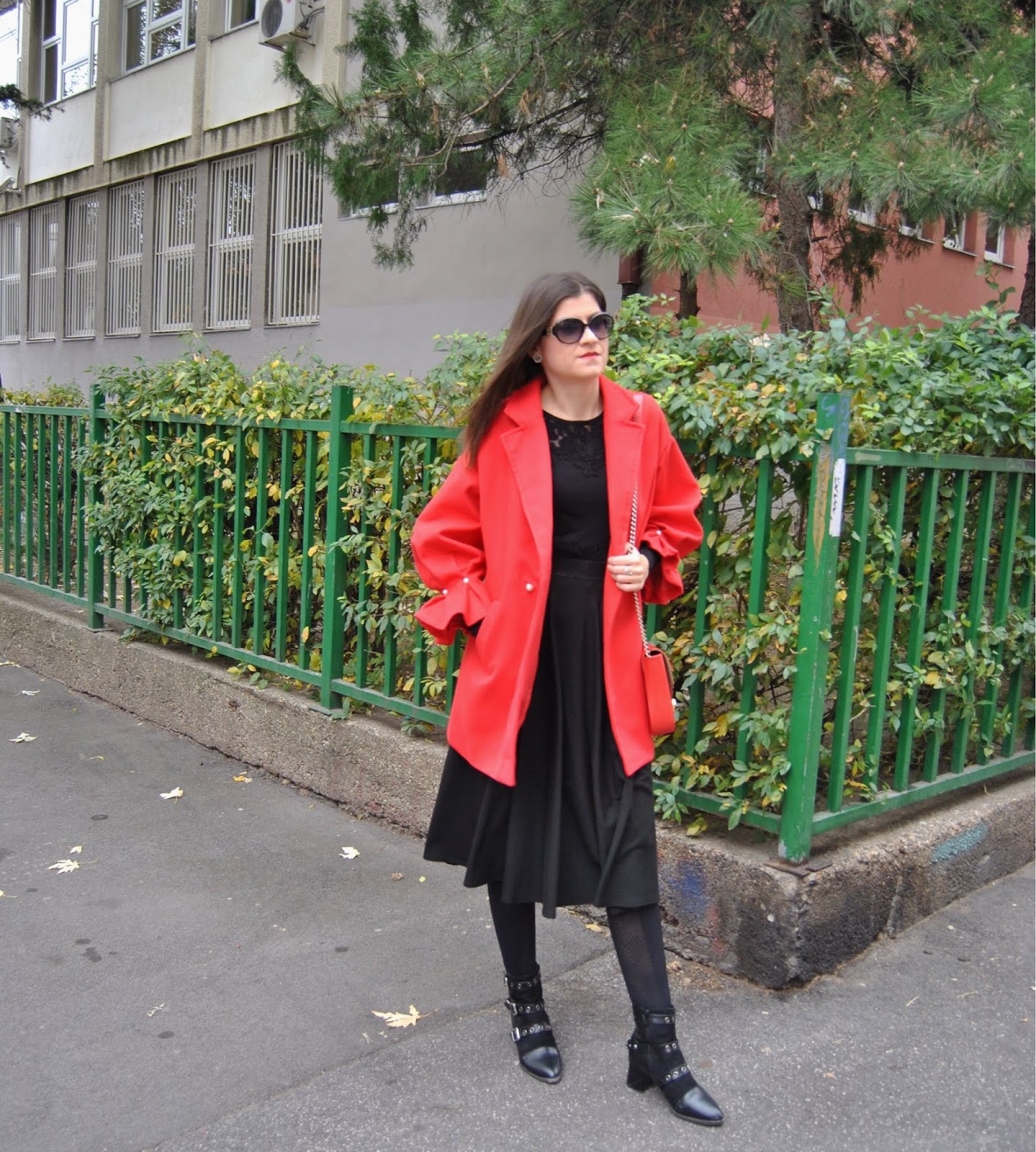 Autumn Season is so inspiriting for mix & match outfit ideas. Today’s choice is a feminine red & black outfit with stunning red oversized with pearl details that I paired with black knitted blouse and midi skirt with elastic waist. Some chic details such as ankle boots, bright shoulder bag and dark sunnies completed total look.
