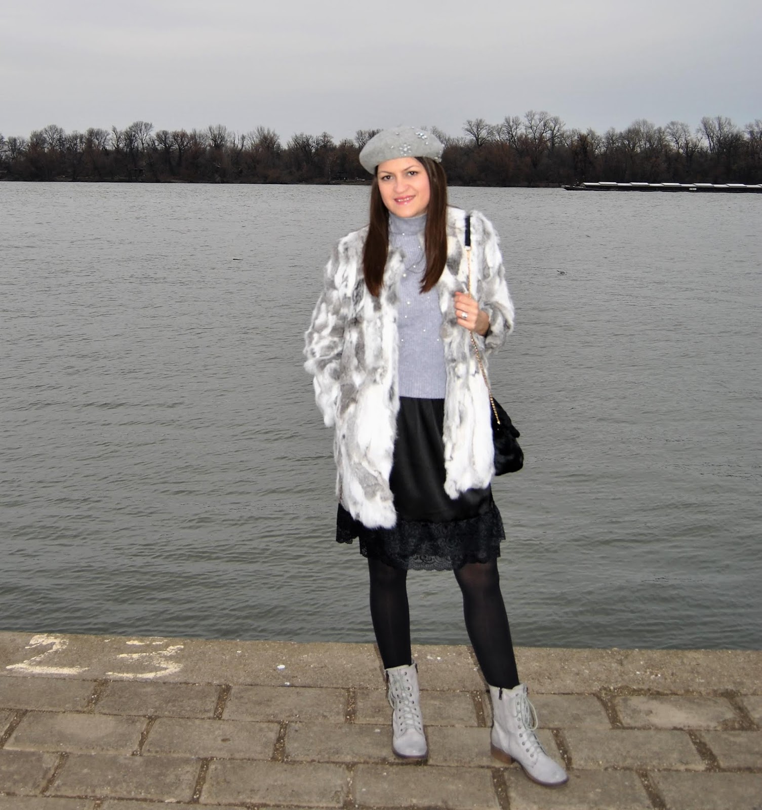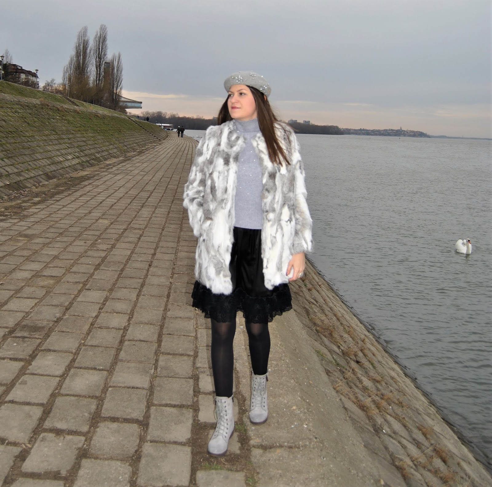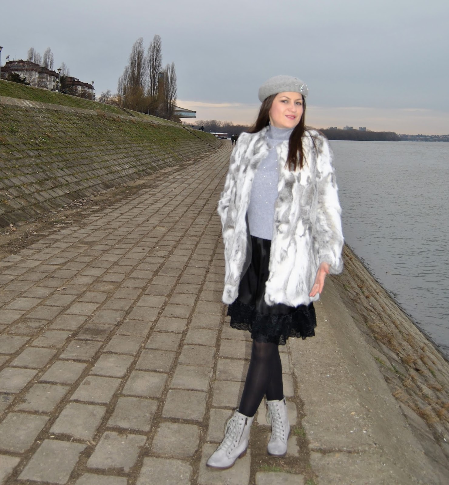 The first one is in bright grey and white tones. I paired it with grey turtleneck, cute satin skirt with feminine lace ruffle, grey ankle boots and trendy beret with rhinestone details.