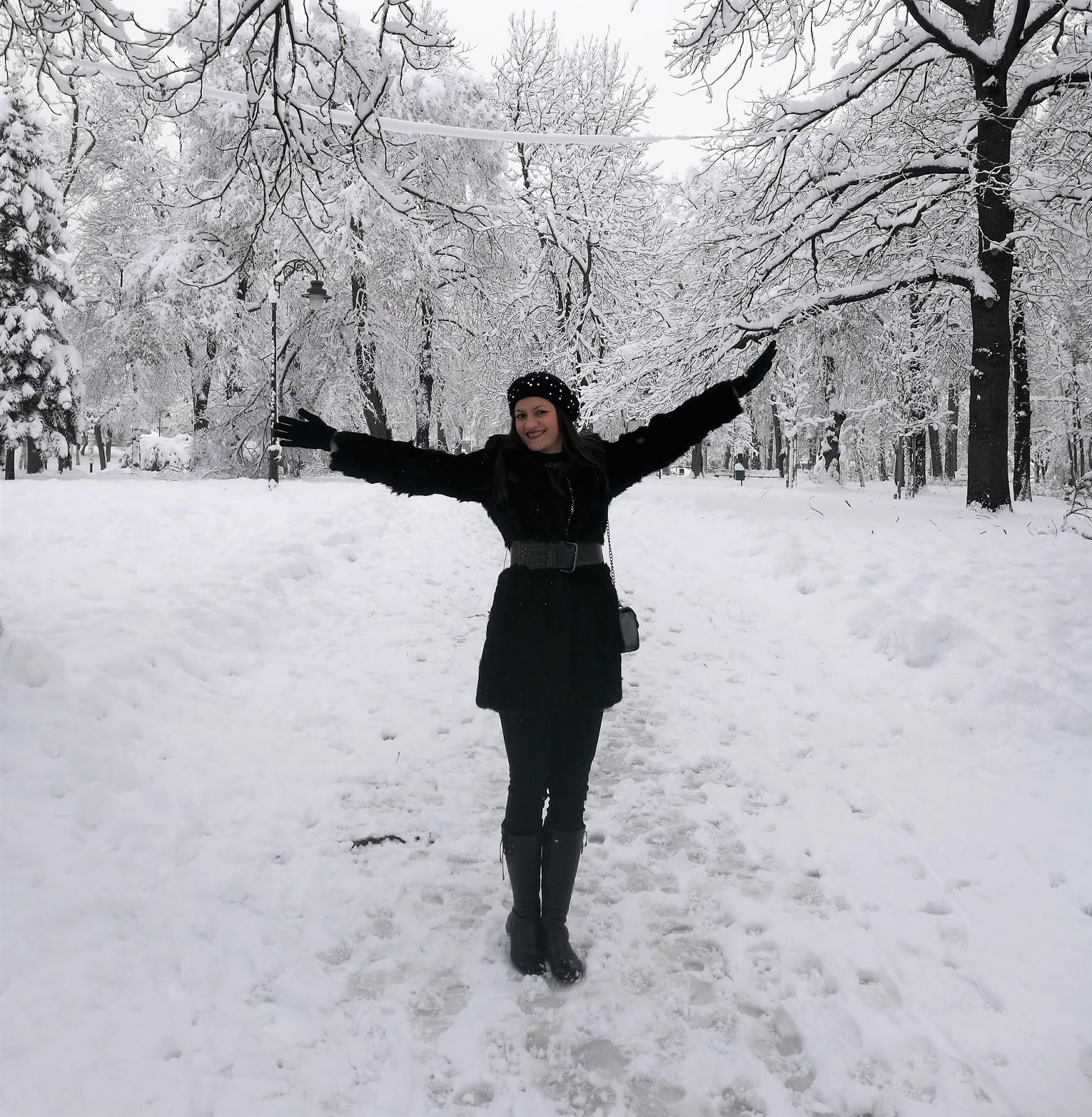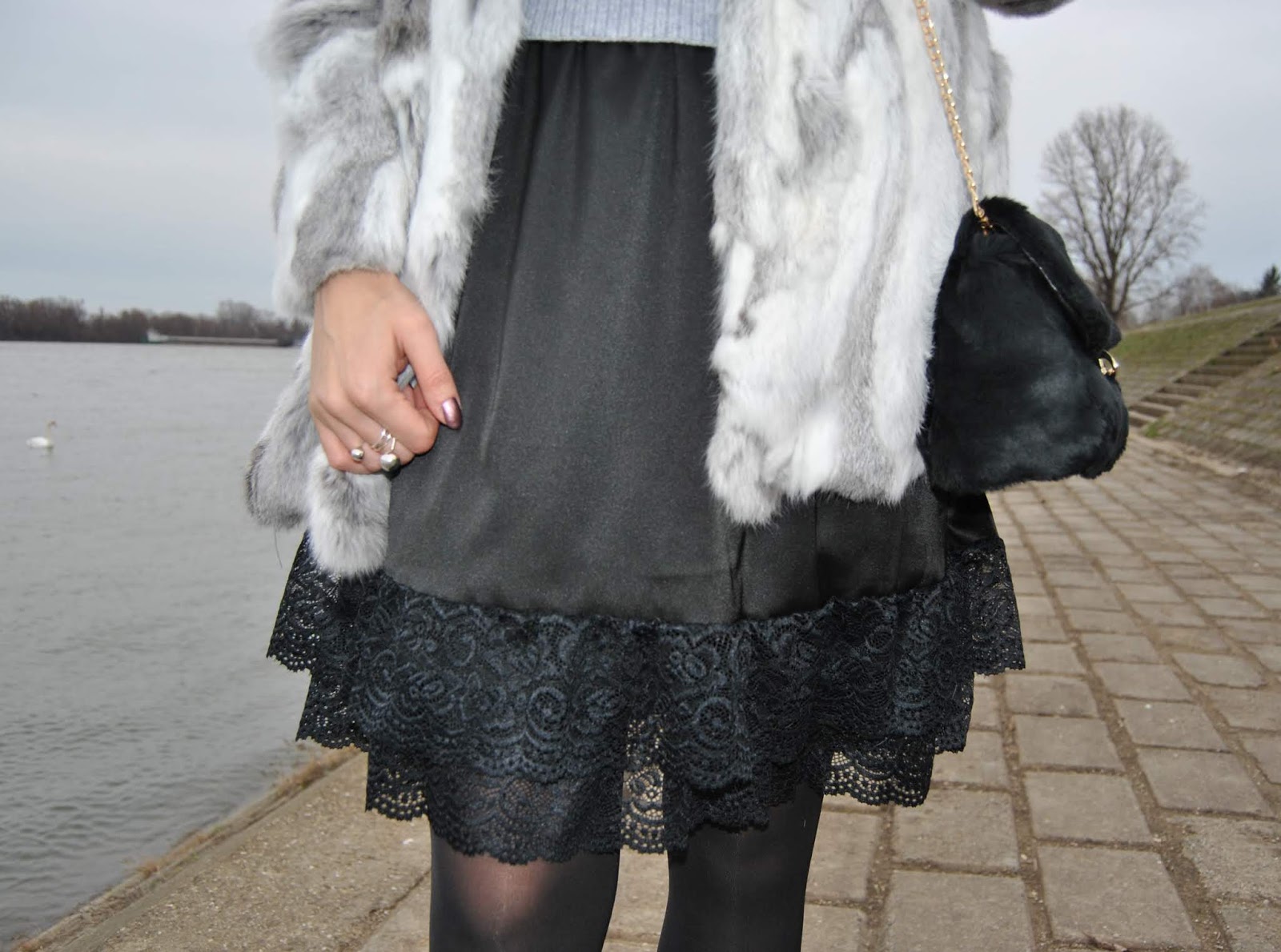 The second is the black fur coat on which I put wide belt and add some trendy accessories (pearl embellised beret, cute mini bag…) to spice up total look.